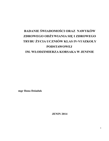 BADANIE ŚWIADOMOŚCI ORAZ NAWYKÓW ZDROWEGO ODŻYWIANIA SIĘ I ZDROWEGO TRYBU ŻYCIA UCZNIÓW KLAS IV-VI SZKOŁY PODSTAWOWEJ IM. WŁODZIMIERZA KORSAKA W JENINIE mgr Ilona Dziaduk JENIN 2014 1 1. Spis treści..........................................................................................................2 2. Wstęp................................................................................................................3 3. Cel pracy i metody...........................................................................................4 4. Teoretyczne podstawy zdrowego żywienia....................................................5 4. 1 Podstawowe pojęcia......................................................................................5 4.2 Podstawowe składniki pokarmowe..............................................................7 4.3 Piramida zdrowego żywienia dla młodzieży.............................................14 4.4 Żywienie a rozwój........................................................................................15 5. Wyniki ankiety...............................................................................................18 5.1 Opis grupy ankietowej oraz projektu KIK/34..........................................18 5.2 Pytania zamknięte.......................................................................................19 5.3 Pytania otwarte............................................................................................31 6. Podsumowanie...............................................................................................35 7. Piśmiennictwo................................................................................................36 2 2. Wstęp Odżywianie się jest procesem życiowym, podczas którego organizm pozyskuje składniki odżywcze zawarte w pokarmie i wykorzystuje je do budowy ciała oraz wytwarzania energii. Jest to podstawowy proces życiowy, bez którego nikt nie byłby w stanie przetrwać. Ważne jest jednak nie tylko to, żeby jeść, tylko to, co człowiek spożywa, w jakiej częstotliwości i w jakiej formie. Każda grupa wiekowa oraz płeć wymaga spożywania produktów w różnej proporcji oraz ilości. Dlatego też niezmiernie ważna jest rola rodziców oraz nauczycieli w procesie nauczania szczególnie dzieci i młodzieży, ponieważ wszyscy wiemy, że „czym skorupka za młodu nasiąknie, tym na starość trąci”. Rodzice w domu dają dzieciom wzór przygotowując zdrowe, zbilansowane posiłki oraz proponując swoim pociechom zdrowe przekąski. To oni pełnią tutaj najważniejszą role, ponieważ zajmują się dziećmi od chwili narodzin, karmią je, wprowadzają nowe dania i napoje. Jeżeli dziecko wcześnie spróbuje czekolady, napojów gazowanych oraz fast-foodów, najprawdopodobniej nie będzie chciało dobrowolnie zmienić swoich nawyków, czyli na przykład pić wody, jeść dużo owoców, warzyw oraz bogatych w składniki odżywcze posiłków. To od rodziców na początku zależy, czym żywią się ich dzieci i dlatego należy jak najlepiej wykorzystać tą szansę. Nauczyciele z kolei mogą przekazywać uczniom najważniejsze informacje, organizować akcje mające na celu wdrożenie u uczniów zasad zdrowego odżywiania się. Jeżeli zarówno rodzice, jak i nauczyciele będą nad tym pracowali, w przyszłości będziemy mieli do czynienia ze zdrowym i silnym społeczeństwem. Jest to niezwykle ważne w dobie częstych zachorowań na nowotwór oraz choroby układu krążenia, otyłość. 3 3. Cel pracy i metody Poniższa praca napisana została w celu zbadania wśród uczniów klas IVVI Szkoły Podstawowej w Jeninie świadomości oraz nawyków zdrowego odżywiania się i zdrowego trybu życia. Wśród uczniów przeprowadzono ankietę składającą się z 20 pytań otwartych i zamkniętych. Wyniki ankiety przedstawiono w formie graficznej, odpowiedzi na pytania zamknięte zaprezentowano na wykresach, a odpowiedzi na pytania otwarte w formie tabeli. Wszystkie wyniki zostały krótko skomentowane, a na końcu można było dojść do wniosków, które można wykorzystać w dalszej pracy z uczniami. Oprócz przeprowadzonej ankiety, w niniejszej pracy posłużyłam się dostępną literaturą na temat zdrowego odżywiania się dzieci i młodzieży, folderami stworzonymi w ramach projektu KIK/34 oraz informacjami przeczytanymi w internecie. 4 4. Teoretyczne podstawy zdrowego żywienia 4.1 Podstawowe pojęcia Pisząc pracę na temat świadomości oraz nawyków zdrowego odżywiania się i zdrowego trybu życia należy wyjaśnić najważniejsze pojęcia. Należą do nich zdrowe żywienie, prozdrowotna edukacja żywieniowa oraz aktywność fizyczna. Spożywanie i przyswajanie pokarmu jest podstawową, biologiczną potrzebą człowieka. Nie jest jednak obojętne, co jemy, kiedy i jak, dlatego też warto wiedzieć, czym jest zdrowe żywienie. Pojęcie to określa żywienie zgodne z zaleceniami nauki o żywieniu i uwzględniające uwarunkowania genetyczne, społeczne i kulturowe. Jego celem jest zaspokojenie potrzeb biologicznych, psychicznych i społecznych człowieka, jak również umożliwienie osiągnięcia pełnego, zaprogramowanego genetycznie, rozwoju psychicznego i fizycznego oraz utrzymanie odporności organizmu na choroby. Prozdrowotna edukacja żywieniowa jest to proces, w którym ludzie uczą się zastosowania w codziennej praktyce wiedzy o żywności i żywieniu, opartej na aktualnych i pewnych wynikach badań naukowych, z uwzględnieniem indywidualnych potrzeb. Edukacja żywieniowa jest nieodłącznym elementem edukacji zdrowotnej. Jej celami są głównie: • uzyskiwanie odpowiedniej wiedzy i żywności i żywieniu, umiejętności poszukiwania tej wiedzy, kształtowanie zdolności do interpretacji i krytycznej oceny informacji pochodzących z różnych źródeł, w tym zwłaszcza z mediów i reklam 5 • kształtowanie prozdrowotnych zachowań żywieniowych • kształtowanie zdolnoś