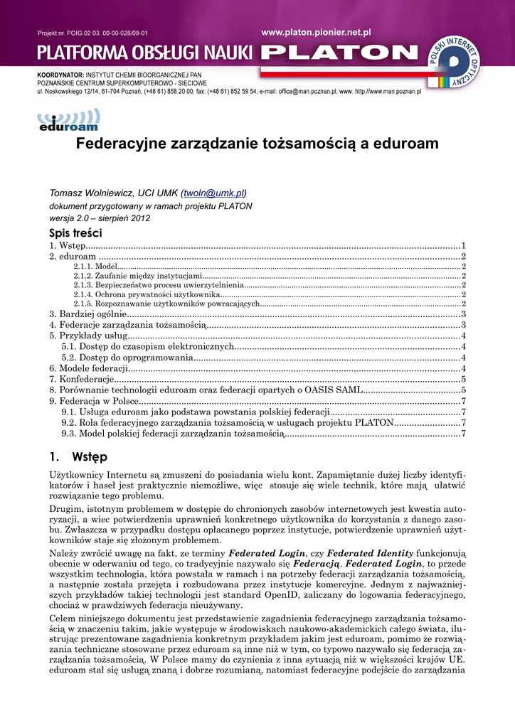 Federacyjne zarządzanie tożsamością a eduroam Tomasz Wolniewicz, UCI UMK ([email protected]) dokument przygotowany w ramach projektu PLATON wersja 2.0 – sierpień 2012 Spis treści 1. Wstęp.....................................................................................................................................................1 2. eduroam ................................................................................................................................................2 2.1.1. Model............................................................................................................................................................... 2 2.1.2. Zaufanie między instytucjami.......................................................................................................................2 2.1.3. Bezpieczeństwo procesu uwierzytelnienia....................................................................................................2 2.1.4. Ochrona prywatności użytkownika...............................................................................................................2 2.1.5. Rozpoznawanie użytkowników powracających.............................................................................................2 3. Bardziej ogólnie.....................................................................................................................................3 4. Federacje zarządzania tożsamością.....................................................................................................3 5. Przykłady usług....................................................................................................................................4 5.1. Dostęp do czasopism elektronicznych..........................................................................................4 5.2. Dostęp do oprogramowania..........................................................................................................4 6. Modele federacji....................................................................................................................................4 7. Konfederacje..........................................................................................................................................5 8. Porównanie technologii eduroam oraz federacji opartych o OASIS SAML.......................................5 9. Federacja w Polsce................................................................................................................................7 9.1. Usługa eduroam jako podstawa powstania polskiej federacji....................................................7 9.2. Rola federacyjnego zarządzania tożsamością w usługach projektu PLATON..........................7 9.3. Model polskiej federacji zarządzania tożsamością......................................................................7 1. Wstęp Użytkownicy Internetu są zmuszeni do posiadania wielu kont. Zapamiętanie dużej liczby identyfikatorów i haseł jest praktycznie niemożliwe, więc stosuje się wiele technik, które mają ułatwić rozwiązanie tego problemu. Drugim, istotnym problemem w dostępie do chronionych zasobów internetowych jest kwestia autoryzacji, a wiec potwierdzenia uprawnień konkretnego użytkownika do korzystania z danego zasobu. Zwłaszcza w przypadku dostępu opłacanego poprzez instytucje, potwierdzenie uprawnień użytkowników staje się złożonym problemem. Należy zwrócić uwagę na fakt, ze terminy Federated Login, czy Federated Identity funkcjonują obecnie w oderwaniu od tego, co tradycyjnie nazywało się Federacją. Federated Login, to przede wszystkim technologia, która powstała w ramach i na potrzeby federacji zarządzania tożsamością, a następnie została przejęta i rozbudowana przez instytucje komercyjne. Jednym z najważniejszych przykładów takiej technologii jest standard OpenID, zaliczany do logowania federacyjnego, chociaż w prawdziwych federacja nieużywany. Celem niniejszego dokumentu jest przedstawienie zagadnienia federacyjnego zarządzania tożsamością w znaczeniu takim, jakie występuje w środowiskach naukowo-akademickich całego świata, ilustrując prezentowane zagadnienia konkretnym przykładem jakim jest eduroam, pomimo że rozwiązania techniczne stosowane przez eduroam są inne niż w tym, co typowo nazywało się federacją zarządzania tożsamością. W Polsce mamy do czynienia z inna sytuacją niż w większości krajów UE. eduroam stał się usługą znaną i dobrze rozumianą, natomiast federacyjne podejście do zarządzania tożsamością, ciągle nie może wyjść z fazy planów. Model eduroam powinien ułatwić zrozumienie na czym polega bardziej abstrakcyjny schemat zarządzania tożsamością, ale dodatkowo, fakt, ze eduroam w Polsce już działa, może się stać znaczącym ułatwieniem przy wprowadzaniu federacji o szerszych celach. W dalszym ciągu przedstawione zostaną różne przykłady konkretnych rozwiązań, ale zaczniemy od opisania usługi eduroam, rozwijanej w Polsce w ramach projektu PLATON. 2. 2.1.1. eduroam Model Celem usługi eduroam jest zapewnienie powszechnego, gościnnego dostępu do sieci dla członków środowiska nauki. eduroam jest zazwyczaj postrzegany jako ściśle związany z sieciami bezprzewodowymi i tak jest zazwyczaj realizowany, chociaż w rzeczywistości infrastruktura eduroam wspiera wszelkie sieci chronione przy pomocy standardu IEEE 802.1X. Istotą eduroam jest mechanizm uwierzytelnienia i autoryzacji. Kiedy na terenie instytucji włączonej do eduroam pojawia się użyt kownik z innej instytucji i uruchamia urządzenie, przy pomocy którego chce korzystać z sieci, to urządzenia dostępowe sieci uruchamiają proces uwierzytelnienia. Urządzenie użytkownika zapytane o identyfikator przesyła łańcuch znaków skonstruowany na tej samej zasadzie, co adres e-mail. Podobnie, jak w przypadku e-mail, na podstawie części domen