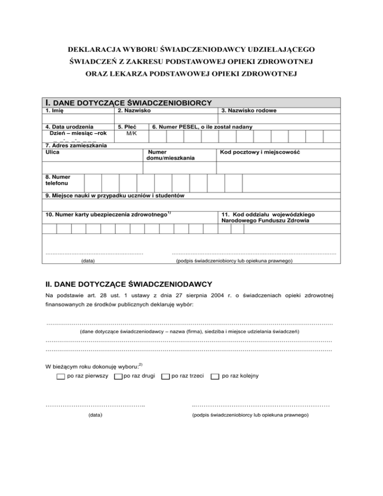 DEKLARACJA WYBORU ŚWIADCZENIODAWCY UDZIELAJĄCEGO ŚWIADCZEŃ Z ZAKRESU PODSTAWOWEJ OPIEKI ZDROWOTNEJ ORAZ LEKARZA PODSTAWOWEJ OPIEKI ZDROWOTNEJ I. DANE DOTYCZ CE WIADCZENIOBIORCY 1. Imię 2. Nazwisko 4. Data urodzenia Dzień – miesi c –rok _ _-_ _-_ _ _ _ 7. Adres zamieszkania Ulica 5. Płeć M/K 3. Nazwisko rodowe 6. Numer PESEL, o ile został nadany Numer domu/mieszkania Kod pocztowy i miejscowo ć 8. Numer telefonu 9. Miejsce nauki w przypadku uczniów i studentów 10. Numer karty ubezpieczenia zdrowotnego ………………………………………………… 11. Kod oddziału wojewódzkiego Narodowego Funduszu Zdrowia 1) …………………………………………………………………………………… (podpis wiadczeniobiorcy lub opiekuna prawnego) (data) II. DANE DOTYCZ CE WIADCZENIODAWCY Na podstawie art. 28 ust. 1 ustawy z dnia 27 sierpnia 2004 r. o wiadczeniach opieki zdrowotnej finansowanych ze rodków publicznych deklaruję wybórŚ ………………………………………………………………………………………………………………………………… (dane dotyczące wiadczeniodawcy – nazwa (firma), siedziba i miejsce udzielania wiadczeń) ………………………………………………………………………………………………………………………………… ………………………………………………………………………………………………………………………………… W bieżącym roku dokonuję wyboru: po raz pierwszy 2) po raz drugi ……………………………………….. (data) po raz trzeci po raz kolejny ..……………………………………………………… (podpis wiadczeniobiorcy lub opiekuna prawnego) III. DANE DOTYCZ CE LEKARZA PODSTAWOWEJ OPIEKI ZDROWOTNEJ Na podstawie art. 28 ust. 1a ustawy z dnia 27 sierpnia 2004 r. o finansowanych ze rodków publicznych deklaruję wybór: wiadczeniach opi eki zdrowotnej 3) ………………………………………………………………………………………………………………………………… (imię i nazwisko lekarza podstawowej opieki zdrowotnej) ………………………………………………………………………………………………………………………………… W bieżącym roku dokonuję wyboru: po raz pierwszy 2) po raz drugi po raz trzeci ……………………………………….. po raz kolejny ..……………………………………………………… (podpis wiadczeniobiorcy lub opiekuna prawnego) (data) ……………………………………………………………………….. (podpis osoby przyjmującej deklarację wyboru) Obja nieniaŚ 1) Jeżeli wiadczeniobiorcy została wydana karta ubezpieczenia zdrowotnego, a w przypadku osób uprawnionych na podstawie przepisów o koordynacji – numer po wiadczenia potwierdzającego prawo do wiadczeń opieki zdrowotnej w ramach ubezpieczenia zdrowotnego na terytorium Rzeczypospolitej Polskiej. 2) wiadczeniobiorca ma prawo bezpłatnego wyboru wiadczeniodawcy, lekarza, pielęgniarki i położnej podstawowej opieki zdrowotnej nie czę ciej niż trzy razy w roku kalendarzowym, a w przypadku każdej kolejnej zmiany wnosi opłatę w wysoko ci 80 zł. wiadczeniobiorca nie ponosi opłaty w przypadku zmiany swojego miejsca zamieszkania lub w przypadku zaprzestania udzielania wiadczeń opieki zdrowotnej przez wybranego wiadczeniodawcę, lekarza, pielęgniarkę lub położną podstawowej opieki zdrowotnej u wybranego wiadczeniodawcy lub z innych przyczyn powstałych po stronie wiadczeniodawcy (art. 28 ust. 1c i 1d ustawy z dnia 27 sierpnia 2004 r. o wiadczeniach opieki zdrowotnej finansowanych ze rodków publicznych). 3) wiadczeniobiorca może wybrać lekarza, pielęgniarkę lub położną podstawowej opieki zdrowotnej u tego samego wiadczeniodawcy, u różnych wiadczeniodawców albo będących wiadczeniodawcami (art. 28 ust. 1b ustawy z dnia 27 sierpnia 2004 r. o wiadczeniach opieki zdrowotnej finansowanych ze rodków publicznych). DEKLARACJA WYBORU ŚWIADCZENIODAWCY UDZIELAJĄCEGO ŚWIADCZEŃ Z ZAKRESU PODSTAWOWEJ OPIEKI ZDROWOTNEJ ORAZ PIELĘGNIARKI PODSTAWOWEJ OPIEKI ZDROWOTNEJ I. DANE DOTYCZ CE WIADCZENIOBIORCY 1. Imi 2. Nazwisko 4. Data urodzenia Dzień – miesi c –rok _ _-_ _-_ _ _ _ 7. Adres zamieszkania Ulica 5. Płeć M/K 3. Nazwisko rodowe 6. Numer PESEL, o ile został nadany Numer domu/mieszkania Kod pocztowy i miejscowo ć 8. Numer telefonu 9. Miejsce nauki w przypadku uczniów i studentów 10. Numer karty ubezpieczenia zdrowotnego ………………………………………………… 11. Kod oddziału wojewódzkiego Narodowego Funduszu Zdrowia 1) …………………………………………………………………………………… (podpis wiadczeniobiorcy lub opiekuna prawnego) (data) II. DANE DOTYCZ CE WIADCZENIODAWCY Na podstawie art. 28 ust. 1 ustawy z dnia 27 sierpnia 2004 r. o wiadczeniach opieki zdrowotnej finansowanych ze rodków publicznych deklaruję wybórŚ ………………………………………………………………………………………………………………………………… (dane dotyczące wiadczeniodawcy – nazwa (firma), siedziba i miejsce udzielania wiadczeń) ………………………………………………………………………………………………………………………………… ………………………………………………………………………………………………………………………………… W bieżącym roku dokonuję wyboruŚ po raz pierwszy 2) po raz drugi ……………………………………….. (data) po raz trzeci po raz kolejny ..……………………………………………………… (podpis wiadczeniobiorcy lub opiekuna prawnego) III. DANE DOTYCZ CE PIEL GNIARKI PODSTAWOWEJ OPIEKI ZDROWOTNEJ Na podstawie art. 28 ust. 1a us