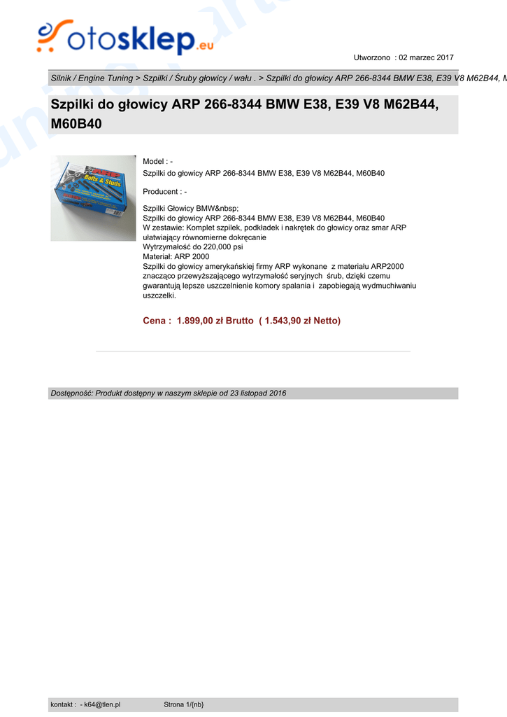 p g n i n u t r a Utworzono : 02 marzec 2017 Silnik / Engine Tuning > Szpilki / Śruby głowicy / wału . > Szpilki do głowicy ARP 266-8344 BMW E38, E39 V8 M62B44, M Szpilki do głowicy ARP 266-8344 BMW E38, E39 V8 M62B44, M60B40 Model : Szpilki do głowicy ARP 266-8344 BMW E38, E39 V8 M62B44, M60B40 Producent : Szpilki Głowicy BMW Szpilki do głowicy ARP 266-8344 BMW E38, E39 V8 M62B44, M60B40 W zestawie: Komplet szpilek, podkładek i nakrętek do głowicy oraz smar ARP ułatwiający równomierne dokręcanie Wytrzymałość do 220,000 psi Materiał: ARP 2000 Szpilki do głowicy amerykańskiej firmy ARP wykonane z materiału ARP2000 znacząco przewyższającego wytrzymałość seryjnych śrub, dzięki czemu gwarantują lepsze uszczelnienie komory spalania i zapobiegają wydmuchiwaniu uszczelki. Cena : 1.899,00 zł Brutto ( 1.543,90 zł Netto) Dostępność: Produkt dostępny w naszym sklepie od 23 listopad 2016 kontakt : - [email protected] Strona 1/{nb}