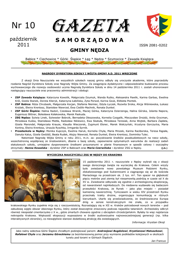 Nr 10 październik 2011 GAZETA SAMORZĄDOWA ISSN 2081-0202 GMINY NĘDZA Babice * Ciechowice * Górki Śląskie * Łęg * Nędza * Szymocice * Zawada KsiąŜęca NAGRODY DYREKTORA SZKOŁY I WÓJTA GMINY A.D. 2011 WRĘCZONE Z okazji Dnia Nauczyciela we wszystkich szkołach naszej gminy odbyły się uroczyste akademie, które poprzedziły rozdanie Nagród Dyrektora Szkoły oraz Nagrody Wójta Gminy. Za osiągnięcia dydaktyczne i odpowiedzialne budowanie procesu wychowawczego dla rozwoju osobowości ucznia Nagrodą Dyrektora Szkoły w dniu 14 października 2011 r. zostali uhonorowani następujący nauczyciele oraz pracownicy administracji i obsługi: ZSP Zawada KsiąŜęca: Katarzyna Kowolik, Małgorzata Dzumyk, Wanda Rutko, Aleksandra Pawlik, Karina Garbas, Ewelina Król, Gizela Stanek, Dorota Klieryk, Katarzyna Łabińska, Zyta Porwoł, Karina Gzuk, ElŜbieta Piontek. ZSP Babice: RóŜa Chrubasik, Małgorzata Kocjan, Stefania Niemiec, Edyta Łyczek, Rozwita Sroka, Alicja Wiśniewska, Łukasz KrziŜek, Elwira Krentosz, Stanisław Niewrzoł, Ewa Cieślik-Machnik, Renata Dunkel. ZSP Górki Śląskie: Halina Radoń, Czesława Wranik, Maciej Górka, Katarzyna Dzierzenga, Halina Górska, Jolanta Napora, Eugeniusz Bittner, Bolesława Kołakowska, Marek Paskuda. ZSG Nędza: Sylwia Linek, Sylwester Bobrzik, Bernadeta Oleszowska, Kornelia Czogalik, Mieczysław DroŜdŜ, Anita Grycman, Mirosława Kuśka, Stanisława Mietła, Radosław Niklewicz, Ewa Skatuła, Mirosława Teresiak, Anna Wojtek, Barbara Zapłata, Gizela Marondel, Małgorzata Krauze, Klaudia Wieczorek, Zygmunt Elsner, Marek Wołczyński, Krystyna Gorczycka, Maria Kontna, Elwira Krentosz, Urszula Ryschka, Irmgarda Syrnik. Przedszkola w Nędzy: Monika Kupczyk, Ewelina Haruk, Kornelia Chyła, Maria Mrozek, Karina Raciborska, Teresa Rąpała, Danuta Kalus, Gizela Gwóźdź, Beata Rudek, Alojzy Niewrzoł, Renata Dunkel, Elwira Krentosz, Dominika Tulec. Natomiast Nagrodę Wójta Gminy w roku 2011, m.in. za: pozyskiwanie środków pozabudŜetowych na rzecz szkoły, wszechstronną współpracę ze środowiskiem, dbanie o bazę szkoły, zapewnienie optymalnych warunków do realizacji zadań statutowych szkoły, umiejętne dysponowanie środkami przyznanymi w planie finansowym w sposób celowy i oszczędny otrzymały: Hanna Kowalska - dyrektor ZSP w Babicach oraz Maria Czerwińska - dyrektor ZSG w Nędzy. (j.b.) WYCIECZKA NAUCZYCIELI ZSG W NĘDZY DO KRAKOWA 15 października 2011 r. nauczyciele z Nędzy wybrali się z okazji swego dorocznego święta na wycieczkę do Krakowa. Celem wizyty było zwiedzenie nowo powstałego Muzeum Podziemi Rynku, zlokalizowanego pod Sukiennicami a ciągnącego się aŜ do kościoła Mariackiego na przestrzeni ok. 2 tys. m². Ten spacer na głębokość pięciu metrów pod ziemię był niesamowitą podróŜą w czasie od X do XV w. Zwiedzanie odbywało się zgodnie z archeologiczną eksploracją, od nawarstwień najmłodszych. Do niedawna wydawało się badaczom przeszłości Krakowa, Ŝe Rynek – jako plac miejski – posiadał kamienną nawierzchnię. Tymczasem w wieku XIV przestrzeń Rynku przecinały trakty droŜne, organizujące komunikację w róŜnych kierunkach. Utarło się przeświadczenie, Ŝe średniowieczna Europa dróg w sensie konstrukcyjnym nie znała, co w przypadku krakowskiego Rynku zupełnie mija się z rzeczywistością. Rozrastający się w XII w. Kraków potrzebował nowych terenów – pod zabudowę zajęto obszar obecnego Rynku, który został doszczętnie zniszczony podczas najazdów tatarskich. Archeolodzy odkryli równieŜ nieopodal cmentarzysko z X w., gdzie zmarłych chowano zgodnie z obrzędem chrześcijańskim. Byłaby to więc najstarsza nekropolia Krakowa. Większość ekspozycji wyposaŜono w środki audiowizualne najnowocześniejszej generacji (np. kilka interaktywnych ekranów), co niewątpliwie stanowi dodatkową atrakcję dla zwiedzających. Informacja: Krystian Okręt Jako radny sołectwa Górki Śląskie chciałbym podziękować panom: Andrzejowi Bugdolowi, Krystianowi Matuszkowi, Rafałowi Chyle oraz Jerzemu Góreckiemu za bezinteresowną pomoc przy wymianie podkładów kolejowych w okolicach tunelu pod torami w Górkach Śląskich. Jan Francus OGŁOSZENIA WÓJTA GMINY STAWKA PODATKU ROLNEGO NA 2012 ROK Komunikat Prezesa Głównego Urzędu Statystycznego z dnia 19 października 2011 roku w sprawie średniej ceny skupu Ŝyta za okres pierwszych trzech kwartałów 2011 roku podaje, Ŝe: na podstawie art. 6 ust. 2 ustawy z dnia 15 listopada 1984 r. o podatku rolnym (Dz. U z 2006 r. Nr 136, poz.969 z późn. zm.) ogłasza się, Ŝe średnia cena skupu Ŝyta za okres pierwszych trzech kwartałów 2011 r. wyniosła 74,18 zł za 1 dt. W związku z tym, na terenie Gminy Nędza w 2012 roku podatek rolny dla gruntów powyŜej 1 hektara wynosić będzie 185,45 zł, natomiast podatek rolny dla gruntów poniŜej 1 hektara wynosić będzie 370,90 zł. ORGANIZACJA AKCJI ZIMOWEJ NA DROGACH GMINNYCH Wójt Gminy zarządzeniem powołał zespół wykonawczy ds. prowadzenia akcji zimowej. Koordynacja akcji zimowej do dnia 31.12.2011 r. została powierzona Józefowi Zagoli. NiŜej GS przedstawia najwaŜniejsze postanowienia programu prowadzenia akcji zimowej w sezonie 2011/2012: 1. Prowadzenie akcji zimowej przewiduje się od 15 listopada 2011 roku do dnia 31 marca 2012 roku. 2. W okresie prowadzenia akcji zimowej na drogach gminnych będzie uŜywany piasek w miejscach szczególnie niebezpiecznych: na skrzyŜowaniach ulic, na podjazdach i zjazdach, na łukach, na chodnikach. 3. Za miejsca szczególnie niebezpieczne w Gminie Nędza uwaŜa się: skrzyŜowanie ulic Jana Pawła II – Gliwickiej - Jesionowej w Nędzy k. Roszarni; skrzyŜowanie ulic Rudzkiej i Arki BoŜka w Babicach; skrzyŜowanie ulic Jana Pawła II i Tuwima w Nędzy; skrzyŜowanie ulic Jana Pawła II i Borowiec w Nędzy; odcinek ulicy Borowiec do skrzyŜowanie z ulicą Wiśniową w Nędzy; ulica Mickiewicza; dojazd do ulicy Jana Paw