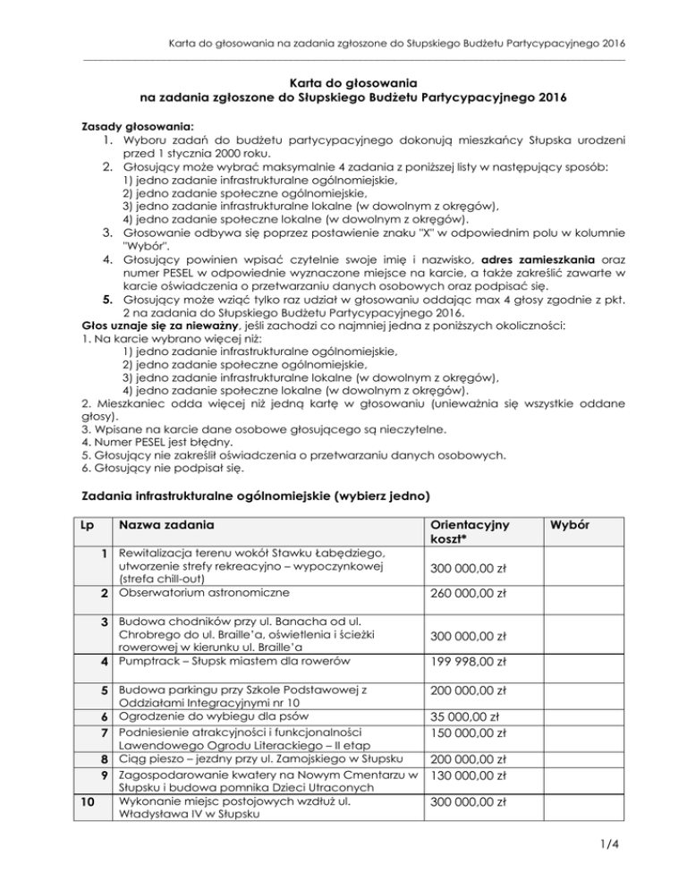 Karta do głosowania na zadania zgłoszone do Słupskiego Budżetu Partycypacyjnego 2016 ______________________________________________________________________________________________ Karta do głosowania na zadania zgłoszone do Słupskiego Budżetu Partycypacyjnego 2016 Zasady głosowania: 1. Wyboru zadań do budżetu partycypacyjnego dokonują mieszkańcy Słupska urodzeni przed 1 stycznia 2000 roku. 2. Głosujący może wybrać maksymalnie 4 zadania z poniższej listy w następujący sposób: 1) jedno zadanie infrastrukturalne ogólnomiejskie, 2) jedno zadanie społeczne ogólnomiejskie, 3) jedno zadanie infrastrukturalne lokalne (w dowolnym z okręgów), 4) jedno zadanie społeczne lokalne (w dowolnym z okręgów). 3. Głosowanie odbywa się poprzez postawienie znaku "X" w odpowiednim polu w kolumnie "Wybór". 4. Głosujący powinien wpisać czytelnie swoje imię i nazwisko, adres zamieszkania oraz numer PESEL w odpowiednie wyznaczone miejsce na karcie, a także zakreślić zawarte w karcie oświadczenia o przetwarzaniu danych osobowych oraz podpisać się. 5. Głosujący może wziąć tylko raz udział w głosowaniu oddając max 4 głosy zgodnie z pkt. 2 na zadania do Słupskiego Budżetu Partycypacyjnego 2016. Głos uznaje się za nieważny, jeśli zachodzi co najmniej jedna z poniższych okoliczności: 1. Na karcie wybrano więcej niż: 1) jedno zadanie infrastrukturalne ogólnomiejskie, 2) jedno zadanie społeczne ogólnomiejskie, 3) jedno zadanie infrastrukturalne lokalne (w dowolnym z okręgów), 4) jedno zadanie społeczne lokalne (w dowolnym z okręgów). 2. Mieszkaniec odda więcej niż jedną kartę w głosowaniu (unieważnia się wszystkie oddane głosy). 3. Wpisane na karcie dane osobowe głosującego są nieczytelne. 4. Numer PESEL jest błędny. 5. Głosujący nie zakreślił oświadczenia o przetwarzaniu danych osobowych. 6. Głosujący nie podpisał się. Zadania infrastrukturalne ogólnomiejskie (wybierz jedno) Lp Nazwa zadania Orientacyjny koszt* Wybór 1 Rewitalizacja terenu wokół Stawku Łabędziego, utworzenie strefy rekreacyjno – wypoczynkowej (strefa chill-out) 2 Obserwatorium astronomiczne 300 000,00 zł 260 000,00 zł 3 Budowa chodników przy ul. Banacha od ul. Chrobrego do ul. Braille’a, oświetlenia i ścieżki rowerowej w kierunku ul. Braille’a 4 Pumptrack – Słupsk miastem dla rowerów 300 000,00 zł 5 Budowa parkingu przy Szkole Podstawowej z 200 000,00 zł Oddziałami Integracyjnymi nr 10 6 Ogrodzenie do wybiegu dla psów 7 Podniesienie atrakcyjności i funkcjonalności Lawendowego Ogrodu Literackiego – II etap 8 Ciąg pieszo – jezdny przy ul. Zamojskiego w Słupsku 199 998,00 zł 35 000,00 zł 150 000,00 zł 200 000,00 zł 9 Zagospodarowanie kwatery na Nowym Cmentarzu w 130 000,00 zł 10 Słupsku i budowa pomnika Dzieci Utraconych Wykonanie miejsc postojowych wzdłuż ul. Władysława IV w Słupsku 300 000,00 zł 1/4 Karta do głosowania na zadania zgłoszone do Słupskiego Budżetu Partycypacyjnego 2016 ______________________________________________________________________________________________ 11 12 13 14 Budowa miejsc postojowych przy ul. Druyffa - Lipowa Połączenie dróg rowerowych na terenie Słupska – wykonanie projektów Górka narciarza – Centrum Sportów Górskich Łąki kwietne w Słupsku – EKO MIASTO 300 000,00 zł 300 000,00 zł 280 000,00 zł 55 000,00 zł Zadania infrastrukturalne lokalne (wybierz jedno w dowolnym z okręgów) Lp Nazwa zadania i okręg 15 Lasek Zachodni – Park przy ul. Marii Zaborowskiej – Okręg 1 16 Budowa piaskowego boiska do piłki siatkowej na plaży – Okręg 2 40 000,00 zł 17 Zagospodarowanie terenu przy Szkole Podstawowej nr 5 – Okręg 4 120 000,00 zł 18 Odbudowa istniejącego, zniszczonego śmietnika przy ul. Mikołajskiej – Okręg 3 11 000,00 zł 19 Remont i wyposażenie boiska wielofunkcyjnego przy Gimnazjum nr 2 im. Ks. Jana Twardowskiego w Słupsku – Okręg 2 Modernizacja placu zabaw dla dzieci – Okręg 3 205 000,00 zł 20 21 22 23 24 25 26 27 28 29 30 31 32 33 34 35 Mało nas do pieczenia chleba – Budowa pieca chlebowego – Okręg 3 Otwieramy podwórko w przedszkolu Kubusia Puchatka – Okręg 1 Rewitalizacja podwórka przynależnego do budynków Wspólnot Mieszkaniowych przy ul. Paderewskiego 6,7,8 i 10 oraz Wrocławska 1 w Słupsku w nawiązaniu do realizacji projektu „podwórko pokoleniowe” – Okręg 3 Tato czerwone, Mamo zielone!!! – Budowa Mini Miasteczka Ruchu drogowego na Osiedlu Niepodległości w Słupsku – I faza – Okręg 1 Oświetlenie solarne w Parku rekreacyjnowypoczynkowo – sportowym przy ul. Konarskiego – Okręg 2 Niech stanie się jasność! Oświetlenie Parku Powstańców Warszawskich – Okręg 4 Remont dwóch fragmentów ulicy Czarnieckiego w Słupsku na osiedlu Jana III Sobieskiego – Okręg 2 Modernizacja ogrodzenia stadionu przy ul. Zielonej 9 – Okręg 3 Nasza baszta kochana… - Okręg 3 Kosze na psie odchody na osiedlu Stefana Batorego i Jana III Sobieskiego – Okręg 2 Budowa boiska wielofunkcyjnego przy ul. Kilińskiego 38 – Okręg 4 Rozbudowa parku rekreacyjno – sportowego przy ul. Rejtana – Konarskiego – Okręg 2 Modernizacja parku przy ul. Wazów – Okręg 2 II etap budowy parku rekreacyjno – sportowego im. Witkacego przy ul. 11 listopada – Okręg 1 Przebudowa i modernizacja skateparku przy ul. Małcużyńskiego – Okręg 1 Orientacyjny koszt* 300 000,00 zł Wybór 300 000,00 zł 12 000,00 zł 300 000,00 zł 125 000,00 zł 183 579,00 zł 147 015,00 zł 251 000,00 zł 300 000,00 zł 300 000,00 zł 24 000,00 zł 26 600,00 zł 240 000,00 zł 300 000,00 zł 300 000,00 zł 300 000,00 zł 300 000,00 zł 2/4 Karta do głosowania na zadania zgłoszone do Słupskiego Budżetu Partycypacyjnego 2016 ______________________________________________________________________________________________ 36 37 Osiedlowy Plac Aktywności przy ul. E. Łady – Cybulskiego – Okręg 4 Rozbudowa skateparku, etap I – Okręg 1 300