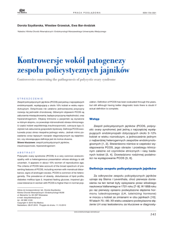 PRACA POGLĄDOWA ISSN 1734–3321 Dorota Szydlarska, Wiesław Grzesiuk, Ewa Bar-Andziak 1 Katedra i Klinika Chorób Wewnętrznych i Endokrynologii Warszawskiego Uniwersytetu Medycznego Kontrowersje wokół patogenezy zespołu policystycznych jajników Controversies concerning the pathogenesis of polycystic ovary syndrome STRESZCZENIE Zespół policystycznych jajników (PCOS) jest jedną z najczęstszych ulation. Definition of PCOS has been evaluated through the years, endokrynopatii, występującą u około 10% kobiet w wieku repro- but still although having better diagnostic tools there is doubt if dukcyjnym. Dotychczas nie ustalono jednoznacznej przyczyny actual definition is complete. rozwoju tej jednostki chorobowej. Głównymi objawami PCOS są zaburzenia miesiączkowania, będące przyczyną niepłodności, oraz hiperandrogenizm. Objawy kliniczne u pacjentek są wyrażone Wstęp w różnym stopniu, co powoduje różnorodność obrazu klinicznego. U części kobiet współistnieją insulinooporność, cukrzyca typu 2, otyłość lub zaburzenia gospodarki lipidowej. Definicja PCOS ewoluowała przez okres niespełna jednego wieku. Jednak mimo posiadania coraz lepszych narzędzi diagnostycznych są wątpliwości, czy obowiązująca definicja jest do końca słuszna. Słowa kluczowe: zespół policystycznych jajników, insulinooporność, hiperandrogenizm ABSTRACT Polycystic ovary syndrome (PCOS) is a very common endocrinopathy with a heterogeneous presentation whose etiology is still Zespół policystycznych jajników (PCOS, polycystic ovary syndrome) jest jedną z najczęściej występujących endokrynopatii dotyczących około 3–12% kobiet w wieku rozrodczym, a jednocześnie jednym z najbardziej heterogennych zespołów endokrynologicznych [1, 2]. Stwierdzono różnice w częstości występowania PCOS, jego obrazie i przebiegu klinicznym zależne od czynników etnicznych i rasy badanych kobiet [3, 4]. Dowiedziono rodzinnej podatności na występowanie PCOS [5, 6]. uncertain. It appears in about 10% women of reproductive age. The criteria of PCOS take account of the broad spectrum of presenting features of PCOS, including women with menstrual distur- Definicja zespołu policystycznych jajników bance, signs of androgen excess. PCOS is common of its heterogeneity. The prevalence of obesity, disturbances of lipid profile, diabetes mellitus type 2, impaired fasting glucose, impaired glucose tolerance in women with PCOS is higher than in normal pop- Adres do korespondencji: lek. Dorota Szydlarska Klinika Chorób Wewnętrznych i Endokrynologii WUM ul. Banacha 1a, 02–097 Warszawa e-mail: [email protected] tel.: 22 599 12 63 Copyright © 2010 Via Medica Nadesłano: 28.07.2010 Przyjęto do druku: 11.10.2010 Za odkrywców zespołu policystycznych jajników uznaje się Steina i Leventhala, choć pierwsze doniesienia na ten temat były opisywane przez włoskiego naukowca Vallisneriego w 1721 roku [7–9]. W 1958 roku po raz pierwszy opisano podwyższone stężenie hormonu luteotropowego (LH, luteinizing hormone) w moczu u kobiet ze zmianami w obu jajnikach [10]. W latach 70. i 80. XX wieku uważano podwyższone stężenie LH oraz testosteronu za kluczowe w diagnosty- www.endokrynologia.viamedica.pl 141 Endokrynologia, Otyłość i Zaburzenia Przemiany Materii 2010, tom 6, nr 3 ce zespołu wielotorbielowatych jajników (tak wtedy nazywano tę jednostkę chorobową) [11, 12]. W 1990 roku odbyła się konferencja sponsorowana przez National Institutes of Heath (NIH), podczas której ustalono, że u kobiet można rozpoznać PCOS, jeśli są spełnione następujące kryteria: objawy nadmiaru androgenów (kliniczne lub biochemiczne), rzadkie owulacje przy wykluczeniu innych jednostek chorobowych przebiegających z podobnym obrazem klinicznym. Szczegółowe informacje są dostępne na stronie internetowej http://consensus.nih.gov/previous.htm. Jednak w świetle prowadzonych badań naukowych widziano potrzebę modyfikacji tej definicji [13]. Od 2004 roku obowiązują kryteria ustanowione przez grupę ekspertów podczas konferencji w Rotterdamie (The Rotterdam ESHRE/ASRM — European Society for Human Reproduction and Embryology/American Society for Reproductive Medicine, Consensus Workshop Group 2003). Według nich o rozpoznaniu PCOS decyduje obecność 2 spośród 3 kryteriów: rzadkie owulacje lub ich brak, nadmierna aktywność hormonów o działaniu androgennym potwierdzona w badaniu klinicznym lub laboratoryjnym, cechy policystycznych jajników w obrazie ultrasonograficznym po wykluczeniu innych patologii cechujących się hiperandrogenizmem [14]. W 2006 roku naukowcy zrzeszeni w Androgen Excess Society (AES) wydali oświadczenie, zgodnie z którym w celu potwierdzenia podejrzenia PCOS należy stwierdzić u pacjentki cechy hiperandrogenizacji [15]. Innymi słowy, u pacjentek bez cech nadmiaru androgenów, z zaburzeniami miesiączkowania i typowym dla PCOS obrazem ultrasonograficznym jajników nie stwierdza się PCOS. Obecnie toczy się dyskusja, co należy rozumieć pod pojęciem hiperandrogenizmu laboratoryjnego. Wobec tak znacznej krytyki testów immunoenzymatycznych testosteronu całkowitego u kobiet poszukuje się innych sposobów oceny stężenia androgenów w surowicy. Dylematem jest także, które spośród androgenów powinny być oceniane? Czy wobec różnej siły androgenowej hormonów analiza stężenia androstendionu ma także znaczenie? Hiperandrogenizm, hiperinsulinizm, insulinooporność Problemy z definicją PCOS wynikają między innymi z faktu, że w zespole tym występują zaburzenia metaboliczne i hormonalne. Do głównych nieprawidłowości można zaliczyć: nadmiar androgenów, hiperinsulinizm, insulinooporność, zaburzenia gospodarki węglowodanowej oraz lipidowej. Pod względem me- tabolicznym jest to niejednorodna jednostka chorobowa, gdyż nie ma zdefiniowanego podziału na kobiety szczupłe i otyłe z PCOS oraz towarzyszące im różne zaburzenia, a także odpowiedź