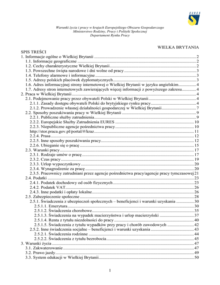 Warunki życia i pracy w krajach Europejskiego Obszaru Gospodarczego Ministerstwo Rodziny, Pracy i Polityki Społecznej Departament Rynku Pracy WIELKA BRYTANIA SPIS TREŚCI 1. Informacje ogólne o Wielkiej Brytanii ............................................................................................ 2 1.1. Informacje geograficzne ........................................................................................................... 2 1.2. Cechy charakterystyczne Wielkiej Brytanii .............................................................................. 2 1.3. Powszechne święta narodowe i dni wolne od pracy ................................................................. 3 1.4. Telefony alarmowe i informacyjne ........................................................................................... 3 1.5. Adresy polskich placówek dyplomatycznych ........................................................................... 3 1.6. Adres informacyjnej strony internetowej o Wielkiej Brytanii w języku angielskim ................ 4 1.7. Adresy stron internetowych zawierających więcej informacji z powyższego zakresu............. 4 2. Praca w Wielkiej Brytanii ................................................................................................................ 4 2.1. Podejmowanie pracy przez obywateli Polski w Wielkiej Brytanii ........................................... 4 2.1.1. Zasady dostępu obywateli Polski do brytyjskiego rynku pracy......................................... 4 2.1.2. Prowadzenie własnej działalności gospodarczej w Wielkiej Brytanii ............................... 7 2.2. Sposoby poszukiwania pracy w Wielkiej Brytanii ................................................................... 9 2.2.1. Publiczne służby zatrudnienia ............................................................................................ 9 2.2.2. Europejskie Służby Zatrudnienia EURES ....................................................................... 10 2.2.3. Niepubliczne agencje pośrednictwa pracy ....................................................................... 10 http://stor.praca.gov.pl/portal/#/kraz .......................................................................................... 11 2.2.4. Prasa ................................................................................................................................. 12 2.2.5. Inne sposoby poszukiwania pracy.................................................................................... 12 2.2.6. Ubieganie się o pracę ....................................................................................................... 15 2.3. Warunki pracy ......................................................................................................................... 17 2.3.1. Rodzaje umów o pracę ..................................................................................................... 17 2.3.2. Czas pracy ........................................................................................................................ 19 2.3.3. Urlop wypoczynkowy ...................................................................................................... 20 2.3.4. Wynagrodzenie za pracę .................................................................................................. 20 2.3.5. Pracownicy zatrudniani przez agencje pośrednictwa pracy/agencje pracy tymczasowej 21 2.4. Podatki .................................................................................................................................... 23 2.4.1. Podatek dochodowy od osób fizycznych ......................................................................... 23 2.4.2. Podatek VAT.................................................................................................................... 26 2.4.3. Inne podatki i opłaty lokalne ............................................................................................ 26 2.5. Zabezpieczenie społeczne ....................................................................................................... 28 2.5.1. Świadczenia z ubezpieczeń społecznych – beneficjenci i warunki uzyskania ................ 30 2.5.1.1. Emerytura .................................................................................................................. 30 2.5.1.2. Świadczenia chorobowe ............................................................................................ 35 2.5.1.3. Świadczenia na wypadek macierzyństwa i urlop macierzyński ............................... 37 2.5.1.4. Renta z tytułu niezdolności do pracy ........................................................................ 40 2.5.1.5. Świadczenia z tytułu wypadków przy pracy i chorób zawodowych ........................ 42 2.5.2. Inne świadczenia socjalne – beneficjenci i warunki uzyskania ....................................... 43 2.5.2.1. Świadczenia rodzinne ............................................................................................... 44 2.5.2.2. Świadczenia z tytułu bezrobocia ............................................................................... 45 3. Warunki życia ................................................................................................................................ 47 3.1. Zakwaterowanie ...................................................................................................................... 47 3.2. Prawo jazdy ............................................................................................................................. 49 3.3. System edukacji w Wielkiej Brytanii...................................................................................... 50 1 Warunki życia i pracy w krajach Europejskiego Obszaru Gospodarczego Ministerstwo Rodziny, Pracy i Polityki Społecznej Departament Rynku Pracy 3.4. Uznawalność dyplomów i kwalifikacji dla celów zawodowych ..