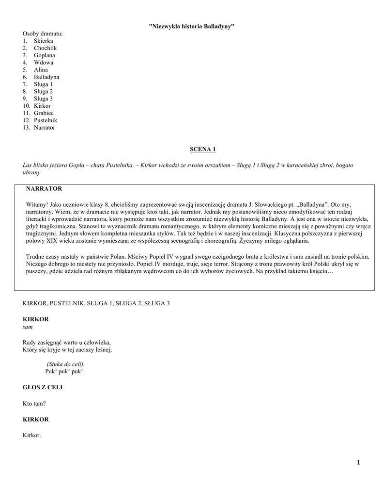 "Niezwykła historia Balladyny" Osoby dramatu: 1. Skierka 2. Chochlik 3. Goplana 4. Wdowa 5. Alina 6. Balladyna 7. Sługa 1 8. Sługa 2 9. Sługa 3 10. Kirkor 11. Grabiec 12. Pustelnik 13. Narrator SCENA 1 Las blisko jeziora Gopła – chata Pustelnika. – Kirkor wchodzi ze swoim orszakiem – Sługą 1 i Sługą 2 w karaceńskiej zbroi, bogato ubrany NARRATOR Witamy! Jako uczniowie klasy 8. chcieliśmy zaprezentować swoją inscenizację dramatu J. Słowackiego pt. „Balladyna”. Oto my, narratorzy. Wiem, że w dramacie nie występuje ktoś taki, jak narrator. Jednak my postanowiliśmy nieco zmodyfikować ten rodzaj literacki i wprowadzić narratora, który pomoże nam wszystkim zrozumieć niezwykłą historię Balladyny. A jest ona w istocie niezwykła, gdyż tragikomiczna. Stanowi to wyznacznik dramatu romantycznego, w którym elementy komiczne mieszają się z poważnymi czy wręcz tragicznymi. Jednym słowem kompletna mieszanka stylów. Tak też będzie i w naszej inscenizacji. Klasyczna polszczyzna z pierwszej połowy XIX wieku zostanie wymieszana ze współczesną scenografią i choreografią. Życzymy miłego oglądania. Trudne czasy nastały w państwie Polan. Mściwy Popiel IV wygnał swego czcigodnego brata z królestwa i sam zasiadł na tronie polskim. Niczego dobrego to niestety nie przyniosło. Popiel IV morduje, truje, sieje terror. Strącony z tronu prawowity król Polski ukrył się w puszczy, gdzie udziela rad różnym zbłąkanym wędrowcom co do ich wyborów życiowych. Na przykład takiemu księciu… KIRKOR, PUSTELNIK, SŁUGA 1, SŁUGA 2, SŁUGA 3 KIRKOR sam Rady zasięgnąć warto u człowieka, Który się kryje w tej zaciszy leśnej; (Stuka do celi). Puk! puk! puk! GŁOS Z CELI Kto tam? KIRKOR Kirkor. 1 PUSTELNIK wychodząc z celi Witaj, synu... Czego chcesz? KIRKOR Rady. PUSTELNIK Zostań pustelnikiem. KIRKOR Gdybym podstarzał dziesiątym krzyżykiem, Może bym w smutne schronił się dąbrowy; Ale ja młody, pan czterowieżowy, Przemyślałem dzisiaj, jak by się ożenić... Poradź mi, starcze! PUSTELNIK Lat dwadzieścia z górą Jak żyję w puszczy... KIRKOR Wskaż mi, o starcze! Mówią, że królewny Słyną wdziękami? PUSTELNIK Nieba! Ród to węża. Żona zbrodniami podobna do męża, O! Bogdaj piorun!... KIRKOR Nie przeklinaj. PUSTELNIK Młody, Przeklinaj ze mną – oni klątwy warci. Bo też ja kiedyś byłem pan nad pany, Żyłem w purpurze, dziś noszę łachmany; Muszę przeklinać. KIRKOR Któż jesteś, starcze? PUSTELNIK 2 Ja... Król Popiel trzeci... KIRKOR schyla kolano Królu mój! PUSTELNIK Któż mię z żebraki rozezna?... KIRKOR (wskazując na swoich rycerzy Sługę 1 i Sługę 2) Uzbrajam chamy i lecę do Gniezna Mścić się za ciebie... SŁUGA 1 Panie, gdzie ty, tam my pomścić koronę biegniemy. Twój brat Popiel skalany twych dzieci krwią niewinną Niegodny rządzić tłumowi rycerzy Niech więc się stanie co się stać powinno, Pod okiem Boga na tej biednej ziemi SŁUGA 2 Ty wiesz o Panie, jak nasza ziemia wszeteczeństwem Króla skalana. Wiesz, jak Popiel krwawy Pastwi sie coraz nowym okrucieństwem Zaczerwienione krwią widziałem stawy Król żywi karpie ciałem niewolników KIRKOR Nim Kirkor w przepaść okropną się rzuci Szukając zemsty – chcę – chciałbym cię badać, Kogo wprowadzić w podwoje zamkowe Z żony imieniem? PUSTELNIK Ani się wahaj, weź pannę ubogą, Żeń się z prostotą, i niechaj ci błogo I lepiej będzie, niżbyś miał z królewną... KIRKOR Starcze, dobrze radzisz... Prowadź, jaskółko! Odchodzi Kirkor a wraz z nim jego słudzy. Pustelnik odchodzi w las. SCENA 2 3 Narrator: Jak w każdym porządnym dramacie romantycznym, również i tu u nas występują postacie fantastyczne. Są nimi Goplana – królowa fali i lasów rezydująca nad jeziorem Gopło oraz jej słudzy – bardziej wierny Skierka i zdecydowanie mniej wierny Chochlik. Niestety Goplana ma poważny problem. Nie grzeszy urodą, zakochała się w człowieku i tenże człowiek nie odwzajemnia jej uczucia… Goplana uknuła pewien podstęp. Zaaranżowała sytuację, w której książę Kirkor będzie miał wypadek na mostku, po którym to wypadku uda się do pobliskiej chaty, gdzie mieszka Wdowa z dwiema córkami. Tam pod wpływem czarów Skierki zamożny książę zakocha się w Balladynie. Niestety Goplana nie tylko nie grzeszy urodą, ale też i rozumem. Obiekt swoich westchnień zamieniła w drzewo, a konkretnie w wierzbę, natomiast swemu słudze zapomniała powiedzieć, w której dziewczynie ma zakochać się Kirkor. Sami zobaczcie co z tego wynikło… Inna część lasu, widać jezioro Gopło. Skierka i Chochlik wchodzą. GOPLANA, SKIERKA, CHOCHLIK SKIERKA Gdzie jest Goplana, nasza królowa? CHOCHLIK Śpi jeszcze w Gople. SKIERKA I woń sosnowa, I woń wiosenna nie obudziła Królowej naszej! woń taka miła! CHOCHLIK Zanadto skoro Zbudzi się jędza i będzie Do pracy nas zaprzęgać. SKIERKA Patrzy na jezioro. Ach, patrz! na słońca promyku Wytryska z wody Goplana; Goplano! Goplano! Goplano! Chochlik Radzę ci uciekajmy mój skierko kochany Wiedźma gotowa zaraz nowa prace zadać Albo obracać młyny skąd woda uciekła Albo leniwego szerszenia wtrącać do piekła Wchodzi Goplana. GOPLANA Narwij mi róż, Chochliku! poleciał mój wianek. CHOCHLIK 4 Już się zaczyna praca. Chochlik odchodzi mrucząc. GOPLANA Czy to jeszcze rano? SKIERKA Pierwsza wiosny godzina. GOPLANA Ach! gdzież mój kochanek? SKIERKA Co mi rozkażesz, królowo? Zadaj piękną jaką pracę. Winąć tęczę kolorową, Albo budować pałace GOPLANA zamyślona Nie! Skierko miły, Ja się kocham. SKIERKA W czym? czy w róży Bezcierniowej? czy w kalinie? W czterolistnej koniczynie? GOPLANA Ach! ja się kocham, kocham się w człowieku! SKIERKA To ludzkie czary. Ktoś idzie tutaj lasem. GOPLANA To on! to on! mój miły. Bądź niewidomym, Skierko. Skierka odchodzi. Wchodzi na scenę Grabiec - rumiany – w ubiorze wieśniaka. GRABIEC 5 Ach, cóż to za