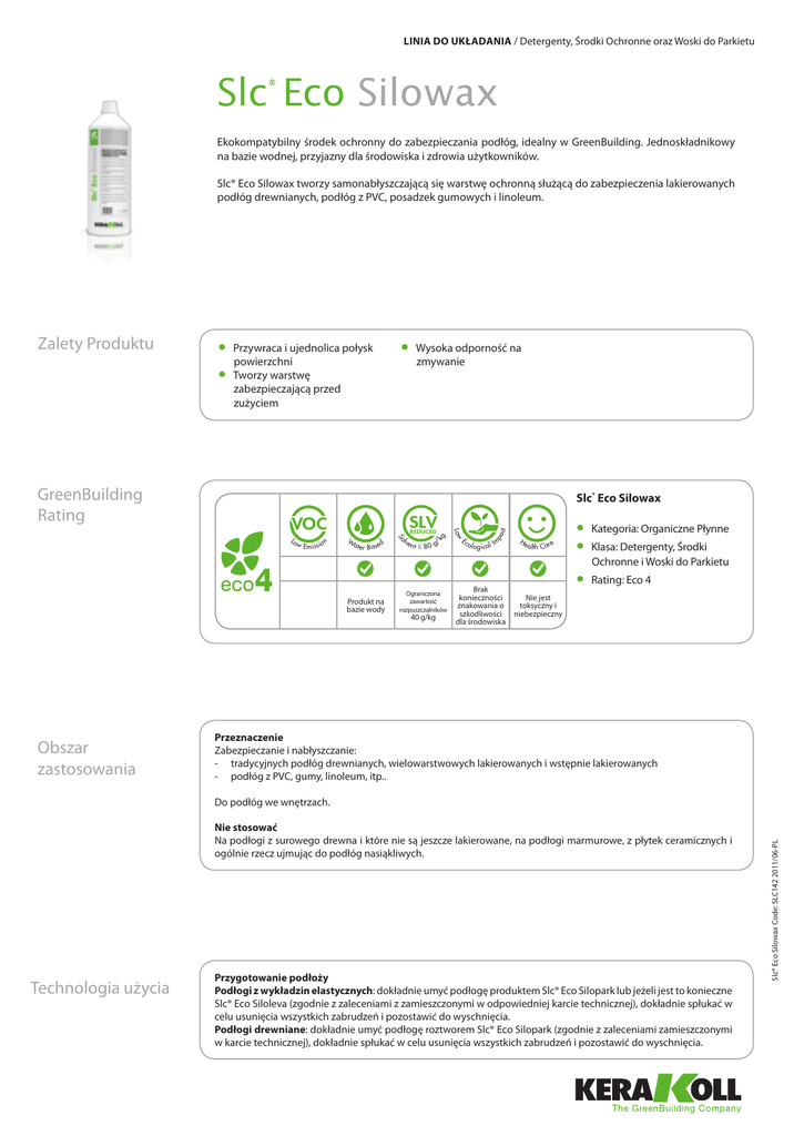 LINIA DO UKŁADANIA / Detergenty, Środki Ochronne oraz Woski do Parkietu Slc Eco Silowax ® Ekokompatybilny środek ochronny do zabezpieczania podłóg, idealny w GreenBuilding. Jednoskładnikowy na bazie wodnej, przyjazny dla środowiska i zdrowia użytkowników. Slc® Eco Silowax tworzy samonabłyszczającą się warstwę ochronną służącą do zabezpieczenia lakierowanych podłóg drewnianych, podłóg z PVC, posadzek gumowych i linoleum. •• Przywraca i ujednolica połysk •• powierzchni Tworzy warstwę zabezpieczającą przed zużyciem •• Wysoka odporność na zmywanie GreenBuilding Rating Obszar zastosowania ater Based lve So 4 W kg REDUCED w Emiss i on n t ≤ 8 0 g/ Low SLV Lo Ec ct Slc® Eco Silowax pa Zalety Produktu ological Im He alth Care •• Kategoria: Organiczne Płynne •• Klasa: Detergenty, Środki Ochronne i Woski do Parkietu Produkt na bazie wody Ograniczona zawartość rozpuszczalników 40 g/kg Brak konieczności znakowania o szkodliwości dla środowiska •• Rating: Eco 4 Nie jest toksyczny i niebezpieczny Przeznaczenie Zabezpieczanie i nabłyszczanie: - tradycyjnych podłóg drewnianych, wielowarstwowych lakierowanych i wstępnie lakierowanych - podłóg z PVC, gumy, linoleum, itp.. Nie stosować Na podłogi z surowego drewna i które nie są jeszcze lakierowane, na podłogi marmurowe, z płytek ceramicznych i ogólnie rzecz ujmując do podłóg nasiąkliwych. Technologia użycia Przygotowanie podłoży Podłogi z wykładzin elastycznych: dokładnie umyć podłogę produktem Slc® Eco Silopark lub jeżeli jest to konieczne Slc® Eco Siloleva (zgodnie z zaleceniami z zamieszczonymi w odpowiedniej karcie technicznej), dokładnie spłukać w celu usunięcia wszystkich zabrudzeń i pozostawić do wyschnięcia. Podłogi drewniane: dokładnie umyć podłogę roztworem Slc® Eco Silopark (zgodnie z zaleceniami zamieszczonymi w karcie technicznej), dokładnie spłukać w celu usunięcia wszystkich zabrudzeń i pozostawić do wyschnięcia. Slc® Eco Silowax Code: SLC142 2011/06-PL Do podłóg we wnętrzach. Technologia użycia Sposób użycia Produkt gotowy do użycia. Nanoszenie Przy pomocy wilgotnej szmatki lub urządzenia do nanoszenia wosku nanieść cienką i jednorodną warstwę Slc® Eco Silowax i pozostawić do wyschnięcia na około 1 godzinę. Jeżeli jest to konieczne, po całkowitym stwardnieniu poprzedniej warstwy, nałożyć drugą i trzecią warstwę, w kierunku prostopadłym do poprzedniej. Czyszczenie Pozostałości Slc® Eco Silowax usuwać przy pomocy wody, gdy produkt jest jeszcze świeży. Po wyschnięciu może być usunięty przy użyciu Slc® Eco Siloleva. Inne wskazówki Dane techniczne wg Normy Jakości Kerakoll Dla uzyskania jednorodnego wykończenia należy nanosić warstwy o takiej samej grubości i przestrzegać zalecanych ilości. W celu oczyszczenia podłóg, na których był zastosowany Slc® Eco Silowax używać Slc® Eco Silopark, zgodnie z zaleceniami zamieszczonymi w odpowiedniej karcie technicznej. W celu przeprowadzenia konserwacji podłóg, na które naniesiono Slc® Eco Silowax, stosować rozcieńczony w proporcji Slc® Eco Silowax : woda = 1 : 5 lub Slc® Eco Silolux rozcieńczonego z wodą w proporcji Slc® Eco Silolux : woda = 1 : 3. Jeżeli jest to konieczne, nanieść powtórnie warstwę Slc® Eco Silowax na miejsca, gdzie jest najbardziej widoczne zużycie i tam, gdzie jest najbardziej intensywny ruch. Po naniesieniu Slc® Eco Silowax można okresowo przeprowadzać konserwację z zastosowaniem Slc® Eco Silolux. W celu usunięcia starych powłok lub zbyt grubych warstw Slc® Eco Silowax używać wyłącznie detergentów usuwających wosk, takich jak Slc® Eco Siloleva. Wygląd Opakowanie Przechowywanie Uwagi Temperatura użycia Wysychanie Wydajność mlecznobiały płyn opakowanie 1 ℓ ≈ 12 miesięcy w oryginalnym opakowaniu i suchym miejscu chronić przed mrozem; chronić przed bezpośrednim nasłonecznieniem i źródłami ciepła od +10 °C do +30 °C ≈1h ≈ 15 ml/m2 Uwagi - Produkt do użytku profesjonalnego - przestrzegać wszelkich norm i przepisów krajowych - w trakcie użycia nie aplikować na powierzchnię nadmiernej ilości wody i/lub roztworu - nie chodzić po podłodze przed jej całkowitym wyschnięciem - nie wstrząsać i unikać pienienia się produktu przed użyciem - w razie potrzeby zażądać karty bezpieczeństwa - w przypadku innych wątpliwości prosimy o kontakt z Kerakoll Worldwide Global Service +48 42 225 17 00 [email protected] Niniejsze informacje zostały uaktualnione w czerwcu 2011; precyzuje się, że mogą one podlegać w miarę upływu czasu uzupełnieniom i/lub zmianom przeprowadzanym przez KERAKOLL SpA; w celu zapoznania się z takimi ewentualnymi uzupełnieniami można wejść na nasze strony internetowe www.kerakoll.com. Dane dotyczące klasyfikacji Eco odnoszą się do GBR Data Report 02/2010. Z tego to powodu firma KERAKOLL SpA jest odpowiedzialna za ważność, aktualność i uaktualnienia własnych informacji jedynie w takim przypadku, gdy zostały one zaczerpnięte z jej własnych stron internetowych. Karta techniczna jest opracowana na podstawie naszej najlepszej wiedzy technicznej i praktycznej. Ponieważ jednak nie możemy bezpośrednio wpływać na warunki budowy i sposób wykonywania prac, zastrzegamy, że są to wskazówki o charakterze ogólnym, które nie zobowiązują w żaden sposób naszej firmy. Dlatego zalecamy przeprowadzenie próby w celu sprawdzenia przydatności produktu do przewidywanego zastosowania. KERAKOLL POLSKA Sp. z o.o. ul. Katowicka 128 – 95-030 Rzgów, Polska Tel. +48 42 225 17 00 – Fax +48 42 225 17 01 e-mail: [email protected] Slc® Eco Silowax Code: SLC142 2011/06-PL Dane uzyskane w temp. +23 °C, przy wilgotności względnej 50% i przy braku wentylacji. Dane mogą ulec zmianie w zależności od warunków panujących na budowie: temperatury, wentylacji i nasiąkliwości podłoża.