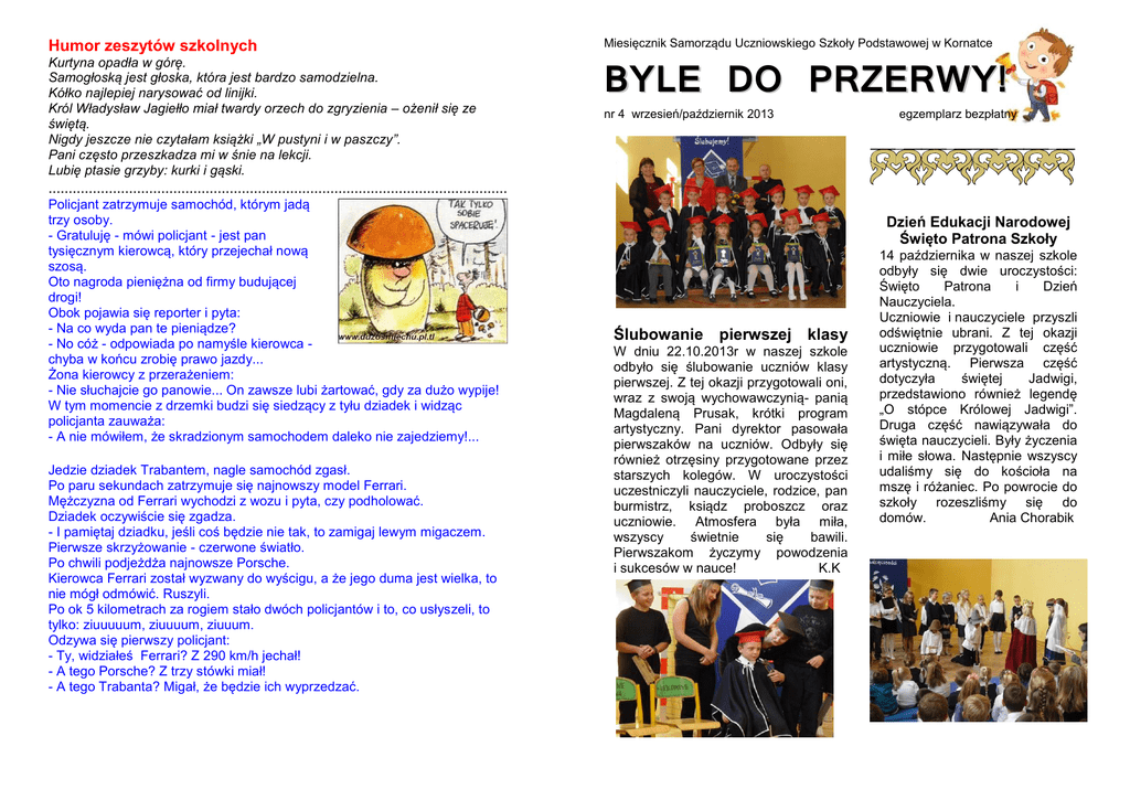 Humor zeszytów szkolnych Miesięcznik Samorządu Uczniowskiego Szkoły Podstawowej w Kornatce Kurtyna opadła w górę. Samogłoską jest głoska, która jest bardzo samodzielna. Kółko najlepiej narysować od linijki. Król Władysław Jagiełło miał twardy orzech do zgryzienia – ożenił się ze świętą. Nigdy jeszcze nie czytałam książki „W pustyni i w paszczy”. Pani często przeszkadza mi w śnie na lekcji. Lubię ptasie grzyby: kurki i gąski. nr 4 wrzesień/październik 2013 BYLE DO PRZERWY! egzemplarz bezpłatny .................................................................................................................. Policjant zatrzymuje samochód, którym jadą trzy osoby. - Gratuluję - mówi policjant - jest pan tysięcznym kierowcą, który przejechał nową szosą. Oto nagroda pieniężna od firmy budującej drogi! Obok pojawia się reporter i pyta: - Na co wyda pan te pieniądze? - No cóż - odpowiada po namyśle kierowca chyba w końcu zrobię prawo jazdy... Żona kierowcy z przerażeniem: - Nie słuchajcie go panowie... On zawsze lubi żartować, gdy za dużo wypije! W tym momencie z drzemki budzi się siedzący z tyłu dziadek i widząc policjanta zauważa: - A nie mówiłem, że skradzionym samochodem daleko nie zajedziemy!... Jedzie dziadek Trabantem, nagle samochód zgasł. Po paru sekundach zatrzymuje się najnowszy model Ferrari. Mężczyzna od Ferrari wychodzi z wozu i pyta, czy podholować. Dziadek oczywiście się zgadza. - I pamiętaj dziadku, jeśli coś będzie nie tak, to zamigaj lewym migaczem. Pierwsze skrzyżowanie - czerwone światło. Po chwili podjeżdża najnowsze Porsche. Kierowca Ferrari został wyzwany do wyścigu, a że jego duma jest wielka, to nie mógł odmówić. Ruszyli. Po ok 5 kilometrach za rogiem stało dwóch policjantów i to, co usłyszeli, to tylko: ziuuuuum, ziuuuum, ziuuum. Odzywa się pierwszy policjant: - Ty, widziałeś Ferrari? Z 290 km/h jechał! - A tego Porsche? Z trzy stówki miał! - A tego Trabanta? Migał, że będzie ich wyprzedzać. Dzień Edukacji Narodowej Święto Patrona Szkoły Ślubowanie pierwszej klasy W dniu 22.10.2013r w naszej szkole odbyło się ślubowanie uczniów klasy pierwszej. Z tej okazji przygotowali oni, wraz z swoją wychowawczynią- panią Magdaleną Prusak, krótki program artystyczny. Pani dyrektor pasowała pierwszaków na uczniów. Odbyły się również otrzęsiny przygotowane przez starszych kolegów. W uroczystości uczestniczyli nauczyciele, rodzice, pan burmistrz, ksiądz proboszcz oraz uczniowie. Atmosfera była miła, wszyscy świetnie się bawili. Pierwszakom życzymy powodzenia i sukcesów w nauce! K.K 14 października w naszej szkole odbyły się dwie uroczystości: Święto Patrona i Dzień Nauczyciela. Uczniowie i nauczyciele przyszli odświętnie ubrani. Z tej okazji uczniowie przygotowali część artystyczną. Pierwsza część dotyczyła świętej Jadwigi, przedstawiono również legendę „O stópce Królowej Jadwigi”. Druga część nawiązywała do święta nauczycieli. Były życzenia i miłe słowa. Następnie wszyscy udaliśmy się do kościoła na mszę i różaniec. Po powrocie do szkoły rozeszliśmy się do domów. Ania Chorabik ,,Już pływam” We wrześniu w naszej szkole rozpoczął się projekt, który pozwoli uczniom klasy V i VI nauczyć się pływać. Odbyło się już siedem wyjazdów do Proszówek w gminie Bochnia. Już prawie wszyscy doskonale radzą sobie w wodzie. Po 90 minutach nauki możemy jeszcze pozjeżdżać na zjeżdżalni i skorzystać z jacuzzi. Projekt potrwa do 20 listopada. M. Mistarz Wybory do Samorządu Uczniowskiego We wrześniu w naszej szkole odbyły się wybory uzupełniające do Samorządu Uczniowskiego. Ostatecznie w skład Zarządu weszły: 2 osoby z szóstej klasy, 3 osoby z piątej, 3 z czwartej i 2 z trzeciej. Najwięcej głosów miał Konrad Banowski z klasy piątej. Przewodniczącą SU została Patrycja Stręk-Sitarz, a zastępcą Michał Mistarz. Na opiekuna wybrano panią Joannę Młynarczyk. Michał Mistarz Konkurs matematyczny Konkurs biblijny 17 X 2013r. odbył się Małopolski Konkurs Biblijny. Wzięło w nim udział 3 uczniów. Zadania były trudne. Wyniki przedstawiają się następująco: Hubert Paluch 24/38 pkt., Michał Mistarz 17/38 pkt., Edyta Kęsek 22/38 pkt. Hubert Paluch Konkurs Samorządu Uczniowskiego na „ Najpiękniejsze życzenia dla Nauczycieli i Pracowników Szkoły” Kategoria kl. I – III I miejsce – Bartek Augustynek, kl. III II miejsce – Amelka Salawa, kl. II Kategoria kl. IV – VI I miejsce – Alicja Kołdras, kl. IV II miejsce – Piotr Krupa, kl. IV III miejsce – Eliza Salawa, kl. IV Gratulujemy zwycięzcom! Dnia 25.10.2013r. odbył się Małopolski Konkurs Matematyczny. Brały w nim udział dwie osoby z szóstej klasy: Edyta Kęsek i Patrycja Stręk-Sitarz, i trzy osoby z klasy piątej: Michał Mistarz, Jasiek Ziemba i Hubert Paluch. Komisji konkursowej przewodniczyła pani Elżbieta Kurek. Konkurs kuratoryjny rozpoczął się o 13:00 i trwał do 14:00 Michał Mistarz Konkurs humanistyczny Dnia 21.10.2013r. o godzinie 13:00 odbył się Małopolski Konkurs Humanistyczny. Udział brali uczniowie z klas V i VI. Uczestnicy musieli rozwiązać zadania związane z lekturami, które należało przeczytać przed konkursem. Test był trudny, chociaż krótki. Uczniowie wyszli zmęczeni, ale ciekawi wyników. Jan Ziemba Kącik literacki *** Ziarno wiedzy raz zasiane już kiełkuje, daje znak. Lecz by nie zostać zdziobane, gdy nadleci wielki ptak, jest potrzebny nauczyciel co podleje i przypomni. Co uśmiechnie się do ucznia, wytłumaczy, przykład da. Gdy już wie, że ten zrozumiał, powie: ”Spróbuj jeszcze raz!” Wtedy ziarno wnet wyrośnie na ogromny wiedzy kwiat! Ala Kołdras Z pamiętnika Agi Drogi Pamiętniku! Nie piszę już dat. Nie chcę wiedzied, kiedy się to wszystko wydarzyło... Porozmawiałam z Izą. Nic to nie dało. Tylko „wysiliłam gardło”. Z 
