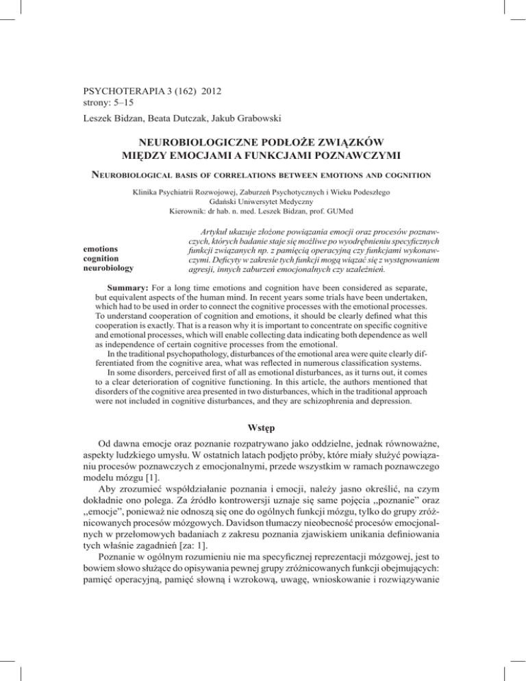 Psychoterapia 3 (162) 2012 strony: 5–15 Leszek Bidzan, Beata Dutczak, Jakub Grabowski Neurobiologiczne podłoże związków między emocjami a funkcjami poznawczymi Neurobiological basis of correlations between emotions and cognition Klinika Psychiatrii Rozwojowej, Zaburzeń Psychotycznych i Wieku Podeszłego Gdański Uniwersytet Medyczny Kierownik: dr hab. n. med. Leszek Bidzan, prof. GUMed emotions cognition neurobiology Artykuł ukazuje złożone powiązania emocji oraz procesów poznawczych, których badanie staje się możliwe po wyodrębnieniu specyficznych funkcji związanych np. z pamięcią operacyjną czy funkcjami wykonawczymi. Deficyty w zakresie tych funkcji mogą wiązać się z występowaniem agresji, innych zaburzeń emocjonalnych czy uzależnień. Summary: For a long time emotions and cognition have been considered as separate, but equivalent aspects of the human mind. In recent years some trials have been undertaken, which had to be used in order to connect the cognitive processes with the emotional processes. To understand cooperation of cognition and emotions, it should be clearly defined what this cooperation is exactly. That is a reason why it is important to concentrate on specific cognitive and emotional processes, which will enable collecting data indicating both dependence as well as independence of certain cognitive processes from the emotional. In the traditional psychopathology, disturbances of the emotional area were quite clearly differentiated from the cognitive area, what was reflected in numerous classification systems. In some disorders, perceived first of all as emotional disturbances, as it turns out, it comes to a clear deterioration of cognitive functioning. In this article, the authors mentioned that disorders of the cognitive area presented in two disturbances, which in the traditional approach were not included in cognitive disturbances, and they are schizophrenia and depression. Wstęp Od dawna emocje oraz poznanie rozpatrywano jako oddzielne, jednak równoważne, aspekty ludzkiego umysłu. W ostatnich latach podjęto próby, które miały służyć powiązaniu procesów poznawczych z emocjonalnymi, przede wszystkim w ramach poznawczego modelu mózgu [1]. Aby zrozumieć współdziałanie poznania i emocji, należy jasno określić, na czym dokładnie ono polega. Za źródło kontrowersji uznaje się same pojęcia ,,poznanie” oraz ,,emocje”, ponieważ nie odnoszą się one do ogólnych funkcji mózgu, tylko do grupy zróżnicowanych procesów mózgowych. Davidson tłumaczy nieobecność procesów emocjonalnych w przełomowych badaniach z zakresu poznania zjawiskiem unikania definiowania tych właśnie zagadnień [za: 1]. Poznanie w ogólnym rozumieniu nie ma specyficznej reprezentacji mózgowej, jest to bowiem słowo służące do opisywania pewnej grupy zróżnicowanych funkcji obejmujących: pamięć operacyjną, pamięć słowną i wzrokową, uwagę, wnioskowanie i rozwiązywanie 6 Leszek Bidzan i wsp. problemów oraz społeczne funkcjonowanie. Tylko rozważanie konkretnych procesów poznawczych umożliwi właściwe odkrycie ich związku z konkretnymi emocjami. Podobnie „emocje” powinno się traktować nie jako pojedynczą funkcję mózgu, ale jako zbiór ściśle powiązanych funkcji mózgowych. Należałoby także w tym aspekcie uwzględnić składowe emocji, takie jak: subiektywne ich doświadczenie, ocenę bodźca, fizjologiczną odpowiedź na stymulację emocjonalną, ekspresję zachowania itp. [2]. Dlatego też prawdziwa natura relacji ,,poznanie–emocje” nigdy nie będzie zrozumiana, jeśli prawa interakcji, które odnoszą się do składowych procesów po obu stronach poznawczo-emocjonalnego równania, nie będą wyszczególnione [1]. Interakcja poznania i emocji musi się odbywać na poziomie neuronalnym, jednak ogólne pojęcia „poznanie” i „emocje” są zbyt oddalone od faktycznych funkcji reprezentowanych w mózgu, aby mogły stanowić użyteczny punkt odniesienia w badaniu tej interakcji. Konieczna jest zatem koncentracja na konkretnych procesach poznawczych i emocjonalnych, co umożliwi zgromadzenie danych wskazujących zarówno na zależność, jak i niezależność pewnego procesu poznawczego od emocjonalnego [2]. Związek emocji z funkcjami poznawczymi Uwzględniając szczegółową charakterystykę emocji oraz funkcji poznawczych nie sposób jest w sposób zwięzły przedstawić całego spektrum związku tych dwóch aspektów ludzkiego umysłu. Dlatego też w niniejszym artykule poświęciliśmy uwagę pamięci operacyjnej i funkcjom wykonawczym, które w ostatnich latach cieszą się szczególnym zainteresowaniem wśród badaczy związku pomiędzy emocjami a funkcjami poznawczymi. Wykazano, że pamięć operacyjna ma szczególne znaczenie dla prawidłowego przebiegu i integracji złożonych procesów poznawczych, w tym także dla kontroli procesów emocjonalnych. Umożliwia ona człowiekowi plastyczne dostosowanie zachowania do zmieniającej się sytuacji, jak również jest podstawą jego poczucia kontroli wewnętrznej i świadomości relacji z otoczeniem [3, 4]. Ponadto ma zasadnicze znaczenie dla prawidłowego przebiegu innych złożonych procesów poznawczych, a mianowicie funkcji wykonawczych. Funkcje wykonawcze, zwane także funkcjami sterowania wykonawczego, to termin określający zespół wyżej zorganizowanych zdolności obejmujących: planowanie strategiczne, elastyczność myślenia, samoregulację oraz zachowanie skierowane na osiąganie celów. Biorą one udział w takich procesach, jak rozwiązywanie problemów, monitorowanie oraz przystosowywanie się do zmian w środowisku. Są związane ze zdolnościami zahamowania reakcji behawioralnych na bodziec, zachowaniami przystosowawczymi czy też skomplikowanymi sekwencjami zachowań [5, 6, 7]. Dzięki tej funkcji potrafimy plastycznie zmienić nasze działanie i dostosowywać reakcje w zależności od zmieniającej się sytuacji [8]. Jesteśmy 