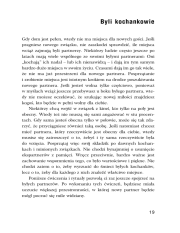 Byli kochankowie Gdy dom jest pełen, wtedy nie ma miejsca dla nowych gości. Jeśli pragniesz nowego związku, nie zaszkodzi sprawdzić, ile miejsca wciąż zajmują byli partnerzy. Niektórzy ludzie często jeszcze po latach mają wiele wspólnego ze swoimi byłymi partnerami: Oni „kochają” ich nadal – lub ich nienawidzą – i dają im tym samym bardzo dużo miejsca w swoim życiu. Czasami dają im go tak wiele, że nie ma już przestrzeni dla nowego partnera. Posprzątanie i zrobienie miejsca jest istotnym krokiem na drodze poszukiwania nowego partnera. Jeśli jesteś wolna tylko częściowo, ponieważ w myślach wciąż jeszcze przebywasz u boku byłego partnera, wtedy nie możesz oczekiwać, że szukając nowej miłości znajdziesz kogoś, kto będzie w pełni wolny dla ciebie. Niektórzy chcą wejść w związek z kimś, kto tylko na poły jest obecny. Wtedy też nie muszą się sami angażować w stu procentach. Gdy sama jesteś obecna tylko w połowie, może się tak zdarzyć, że przyciągniesz również taką osobę. Jeśli natomiast chcesz mieć partnera, który rzeczywiście jest obecny dla ciebie, wtedy musisz się zatroszczyć o to, żebyś i ty sama rzeczywiście była do wzięcia. Posprzątaj więc swój składzik po dawnych kochankach i minionych związkach. Nie chodzi bynajmniej o usunięcie ekspartnerów z pamięci. Wręcz przeciwnie, bardzo ważne jest zachowanie wspomnienia tego, co było wartościowe i piękne. Nie chodzi zatem o to, żeby wyrzucić do śmieci byłych kochanków, lecz o to, żeby dla każdego z nich znaleźć właściwe miejsce. Poniższe ćwiczenia i rytuały pozwolą ci raz jeszcze spojrzeć na byłych partnerów. Po wykonaniu tych ćwiczeń, będziesz miała uczucie większej przestronności, w której nowy partner będzie mógł poczuć się mile widziany. 19 Byli kochankowie Pierwsza pomoc Jeśli jakiś związek się kończy, ponieważ jeden z partnerów nagle odchodzi, to partner, który zostaje sam, może popaść w stan przewlekłego szoku1 . Niespodziewane zerwanie przez odejście partnera nie może zostać właściwie przepracowane, a osoba opuszczona czuje się mniej lub bardziej bezradna. Czasami taki szok trwa wiele dni lub tygodni, ale równie dobrze stan ten może trwać nawet miesiącami czy ciągnąć się latami. Są też osoby, które właściwie nigdy nie wychodzą z szoku bycia opuszczonym. To samo dzieje się także wtedy, gdy jeden z partnerów nagle umiera lub ginie w wypadku. Potrzeba dużo czasu, żeby na nowo rozwinąć w sobie poczucie, że istnieje coś takiego jak bezpieczeństwo i trwałość. Co prawda, jeśli przyjrzeć się temu dokładnie, to nie istnieje ani całkowite bezpieczeństwo, ani prawdziwa trwałość. Mimo to wszyscy potrzebujemy wiary w ostoję, która daje poczucie stabilności. Ważne jest, aby nauczyć się rozwijać to uczucie zaufania i doświadczyć, że określone rzeczy mogą dać nam uczucie spokoju i poczucie bezpieczeństwa. 1 Trudno w języku polskim oddać wielość możliwych perspektyw w poszukiwaniach partnerki/partnera: kobieta szuka mężczyzny, mężczyzna szuka kobiety, kobieta szuka kobiety, mężczyzna szuka mężczyzny. Dla zachowania czytelności przekładu zdecydowałem się stosować naprzemiennie perspektywę kobieta szuka mężczyzny oraz mężczyzna szuka kobiety. Pamiętać jednak należy, że za każdym razem możliwe są wszystkie perspektywy – co zresztą jest wyraźną intencją autora. Czytelniczkom i Czytelnikom pozostawiam wybranie takiej perspektywy, jakiej potrzebują. (Przypis tłumacza – Z.M.). 20 Pierwsza pomoc Jeśli ktoś jest w permanentnym szoku, nie potrafi nawiązać prawdziwego kontaktu ze swoim ciałem i otoczeniem. Ktoś, kto zostaje sam, często nieświadomie unika poczucia niepewności i zwątpienia. Takie unikanie pomaga być może w przetrzymaniu kryzysu, jednak potem utrudnia tej osobie troszczenie się o siebie krok po kroku i stworzenie poczucia bezpieczeństwa. Natomiast ktoś, kto zaczyna szukać nowego partnera zaraz po tym, jak utracił poprzedniego, przeskakuje prawdopodobnie ważny etap wylizywania ran i uczenia się dbania o siebie samego. Kolejny partner obarczony zostaje wtedy całą odpowiedzialnością za troskę o drugiego. Stanowi to ogromne brzemię dla nowego kochanka, które sprawia, że związek się bardzo rzadko dobrze kończy. Gdy twój związek zakończył się całkiem niedawno lub straciłaś swojego partnera, wtedy może lepiej dać sobie najpierw trochę czasu, aby nauczyć się znów dbać o siebie. W ten sposób nauczysz się dostrzegać, czego sama potrzebujesz, zanim całą uwagę skierujesz znów na ewentualnego nowego partnera. Dopiero gdy znów staniesz mocno na własnych nogach, nowy związek będzie miał więcej szans powodzenia. Może ci w tym pomóc bardzo proste ćwiczenie: Æwiczenie Przez tydzień lub dłużej miej pod ręką notes i długopis, zapisuj każdą sytuację, w której coś zrobiłaś, dzięki czemu czujesz się lepiej fizycznie i/lub bardziej zrównoważona. Może to być na przykład odprężająca kąpiel z dodatkiem przyjemnych zapachów, wizyta w saunie, spacer, napisanie kartki do przyjaciela, wysłuchanie muzyki określonego rodzaju lub uporządkowanie gazet… Nie myśl przy tym o wielkich przedsięwzięciach, lecz zupełnie prostych rzeczach, które sama możesz zrobić. O rzeczach, które dają ci poczucie jasności, dzięki którym czujesz się troszkę lepiej, odprężasz się, lub które dają uczucie zadowolenia. Trzymaj ten notes pod ręką i zapisuj od razu, gdy właśnie robisz jakąś małą rzecz, która pozytywnie działa na ciebie. 21 Byli kochankowie Co jeszcze ma lub miało pozytywny wpływ? Wypisz wszystko, co w przeszłości miało dobry wpływ i co teraz też dobrze by ci zrobiło. Zapisuj tylko krótkie i stosunkowo proste działania, które nie wymagają zbyt wiele energii. Na koniec zrób listę wszystkich czynności i powieś ją w miejscu, w którym b