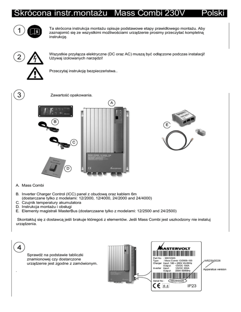 Skrócona instr.monta u Mass Combi 230V Polski Ta skrócona instrukcja monta u opisuje podstawowe etapy prawid owego monta u. Aby zaznajomi si ze wszystkimi mo liwo ciami urz dzenie prosimy przeczyta kompletn instrukcj . Wszystkie przy cza elektryczne (DC oraz AC) musz by od czone podczas instalacji! ywaj izolowanych narz dzi! Przeczytaj instrukcj bezpiecze stwa.. Zawarto opakowania. A. Mass Combi B. Inverter Charger Control (ICC) panel z obudow oraz kablem 6m (dostarczane tylko z modelami: 12/2000, 12/4000, 24/2000 and 24/4000) C. Czujnik temperatury akumulatora D. Instrukcja monta u i obs ugi E. Elementy magistrali MasterBus (dostarczaane tylko z modelami: 12/2500 and 24/2500) Skontaktuj si z dostawc je li brakuje którego z elementów. Je li Mass Combi jest uszkodzony nie instaluj urz dzenia. Sprawd na podstawie tabliczki znamionowej czy dostarczone urz dzenie jest zgodne z zamówionym. . yj rub M6 do pionowego zamocowania urz dzenia na stabilnym, solidnym pod u. Pozostaw przynajmniej 10cm przestrzeni wokó urz dzenia. Combi 2000 Combi 1200 Combi 2500 ______________________________ Combi 4000_____ A 300mm / 11.8 inch 300mm / 11.8 inch B 316.5mm / 15.5 inch 405.5mm / 16 inch Aby uzyska dost p do pod cze nale y: 1 Poluzuj 2-3 obroty ruby mocuj ce pokryw . 2 Wysu pokryw z obudowy Wymagane przekroje kabli oraz warto ci bezpieczników: 230 V AC 12 / 24V DC Nat enie pradu _____ Minimalny przekrój w mm2 ____________________ ________________________ 6-12 Amp ___________ 1.5 mm2 12-20 Amp __________ 2.5 mm2 20-32 Amp __________ 4 mm2 32-48 Amp __________ 6 mm2 2 48-80 Amp __________ 10 mm Model Mass Combi Przekrój kabli DC: 12/1200-60 __________ 2x 50mm2______________ 12/2000-100 _________ 2x 70mm2______________ 12/2500-100 _________ 2x 70mm2______________ 2 12/4000-200 _________ 4x 70mm _____________ 2 24/1200-35 __________ 2x 35mm ______________ 2 24/2000-60 __________ 2x 50mm ______________ 2 24/2500-60 __________ 2x 50mm ______________ 24/4000-120 _________ 2x 70mm2______________ Maksymalny pr d przep ywaj cy przez Mass Combi musi by ograniczony bezpiecznikiem Model Mass Combi Maksymalna warto ____________________ bezpiecznika na wej ciu: Wszystkie modele_____ 50A_______________ Zalecane kolory kabli (zgodne z lokalnymi warunkami): Kolor kabla ______Znaczenie ___ Br zowy Faza _______ Niebieski ________ Neutralny____ to-zielony _____ Ziemia______ Musi by pod czony: L1 ___________ N ___________ PE / GND _____ Model Mass Combi Zalecany bezpiecznik DC 12/1200-60 ___________ 160A _________________ 12/2000-100 _________ 250A _________________ 12/2500-100 _________ 250A _________________ 12/4000-200 _________ 2 x 250A _______________ 24/1200-35 __________ 80A __________________ 24/2000-60 ___________ 125A__________________ 24/2500-60 ___________ 125A__________________ 24/4000-120 _________ 250A__________________ Schemat pod czenia Mass Combi (+) akumulatora Wy cznik ró nicowopr dowy RCD Max. 50Amps 30mA (-) akumulatora Wej cie 230V AC L NHb POWER (napi cie tylko wtedy gdy pod czone jest napi cie na AC Input ) SHORT BREAK (prze cza odbiorniki z wej cia AC input na napi cie z inwertera przy braku napi cia na wejsciu Service Batteries Ustawienia mikroprze czników. Zalecane ustawienie mikroprze czników (DIP-switch): DIP Switch Bank A: • Pojedynczy inwerter: Sw 1 – OFF; Sw 2 - OFF. • Cz stotliwo : 50Hz: Sw 3 - OFF. • Tryb moc ca kowitej ci ej (tryb oszcz dno ciowy wy czony): Sw 4 - OFF, Sw 5 - OFF. • Rodzaj akumulatorów . Kwasowe: Sw 6 - OFF, Sw 7 - OFF; elowe lub AGM: Sw 6 - ON, Sw 7 - OFF. • Pzeka nik uziemiaj cy: Sw 8- ON. Podczas pracy przetwornicy kabel neutralny (N) na wyj ciu inwertera b dzie wewn trznie po czony do uziemienia (PE / GND) DIP Switch Bank B: • Przy nie u ywaniu specjalnych funkcji urz dzenia wszystkie mikroprze czniki grupy B powinny by ustawione na OFF Sprawd pod czenia. • • • • Je li wszystkie s poprawne to: Dokr d awice kabli; Przykr pokryw przy cze ; W bezpiecznik DC; UWAGA: mo e powsta iskra! Pod cz urz dzenie do ród a pradu 230V AC. cz Mass Combi.Diody LED zaczn mruga kilka razy; urz dzenie zacznie pracowac po kilku sekundach. Je li urz dzenie nie w czy si , niezw ocznie od cz akumulatory oraz napi cie wej ciowe 230V AC i sprawd powód usterki.