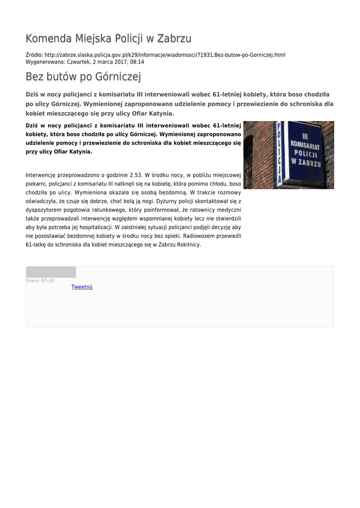 Komenda Miejska Policji w Zabrzu Źródło: http://zabrze.slaska.policja.gov.pl/k29/informacje/wiadomosci/71931,Bez-butow-po-Gorniczej.html Wygenerowano: Czwartek, 2 marca 2017, 08:14 Bez butów po Górniczej Dziś w nocy policjanci z komisariatu III interweniowali wobec 61-letniej kobiety, która boso chodziła po ulicy Górniczej. Wymienionej zaproponowano udzielenie pomocy i przewiezienie do schroniska dla kobiet mieszczącego się przy ulicy Ofiar Katynia. Dziś w nocy policjanci z komisariatu III interweniowali wobec 61-letniej kobiety, która boso chodziła po ulicy Górniczej. Wymienionej zaproponowano udzielenie pomocy i przewiezienie do schroniska dla kobiet mieszczącego się przy ulicy Ofiar Katynia. Interwencję przeprowadzono o godzinie 2.53. W środku nocy, w pobliżu miejscowej piekarni, policjanci z komisariatu III natknęli się na kobietę, która pomimo chłodu, boso chodziła po ulicy. Wymieniona okazała się osobą bezdomną. W trakcie rozmowy oświadczyła, że czuje się dobrze, choć bolą ją nogi. Dyżurny policji skontaktował się z dyspozytorem pogotowia ratunkowego, który poinformował, że ratownicy medyczni także przeprowadzali interwencję względem wspomnianej kobiety lecz nie stwierdzili aby była potrzeba jej hospitalizacji. W zaistniałej sytuacji policjanci podjęli decyzję aby nie pozostawiać bezdomnej kobiety w środku nocy bez opieki. Radiowozem przewieźli 61-latkę do schroniska dla kobiet mieszczącego się w Zabrzu Rokitnicy. Ocena: 0/5 (0) Tweetnij