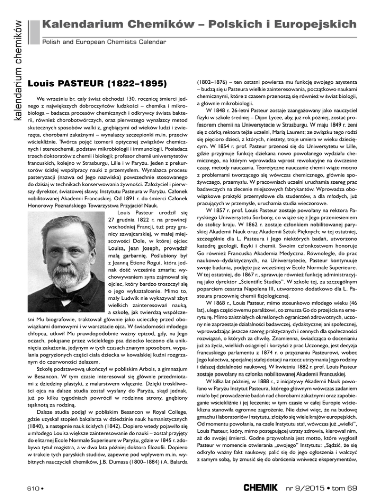 kalendarium chemików Kalendarium Chemików – Polskich i Europejskich Polish and European Chemists Calendar Louis PASTEUR (1822–1895) We wrześniu br. cały świat obchodzi 130. rocznicę śmierci jednego z największych dobroczyńców ludzkości – chemika i mikrobiologa – badacza procesów chemicznych i odkrywcy świata bakterii, również chorobotwórczych, oraz pierwszego wynalazcy metod skutecznych sposobów walki z, gnębiącymi od wieków ludzi i zwierzęta, chorobami zakaźnymi – wynalazcy szczepionki m.in. przeciw wściekliźnie. Twórca pojęć izomerii optycznej związków chemicznych i stereochemii, podstaw mikrobiologii i immunologii. Posiadacz trzech doktoratów z chemii i biologii; profesor chemii uniwersytetów francuskich, kolejno w Strasburgu, Lille i w Paryżu. Jeden z prekursorów ścisłej współpracy nauki z przemysłem. Wynalazca procesu pasteryzacji (nazwa od Jego nazwiska) powszechnie stosowanego do dzisiaj w technikach konserwowania żywności. Założyciel i pierwszy dyrektor, światowej sławy, Instytutu Pasteura w Paryżu. Członek nobilitowanej Akademii Francuskiej. Od 1891 r. do śmierci Członek Honorowy Poznańskiego Towarzystwa Przyjaciół Nauk. Louis Pasteur urodził się 27 grudnia 1822 r. na prowincji wschodniej Francji, tuż przy granicy szwajcarskiej, w małej miejscowości Dole, w której ojciec Louisa, Jean Joseph, prowadził małą garbarnię. Poślubiony był z Jeanną Etiene Rogui, która jednak dość wcześnie zmarła; wychowywaniem syna zajmował się ojciec, który bardzo troszczył się o jego wykształcenie. Mimo to, mały Ludwik nie wykazywał zbyt wielkich zainteresowań nauką, a szkołę, jak twierdzą współcześni Mu biografowie, traktował głównie jako ucieczkę przed obowiązkami domowymi i w warsztacie ojca. W świadomości młodego chłopca, utkwił Mu prawdopodobnie ważny epizod, gdy, na Jego oczach, pokąsane przez wściekłego psa dziecko leczono dla uniknięcia zakażenia, jedynym w tych czasach znanym sposobem, wypalania pogryzionych części ciała dziecka w kowalskiej kuźni rozgrzanym do czerwoności żelazem. Szkołę podstawową ukończył w pobliskim Arbois, a gimnazjum w Besancon. W tym czasie interesował się głównie przedmiotami z dziedziny plastyki, z malarstwem włącznie. Dzięki troskliwości ojca na dalsze studia został wysłany do Paryża, skąd jednak, już po kilku tygodniach powrócił w rodzinne strony, gnębiony tęsknotą za rodziną. Dalsze studia podjął w pobliskim Besancon w Royal College, gdzie uzyskał stopień bakalarza w dziedzinie nauk humanistycznych (1840), a następnie nauk ścisłych (1842). Dopiero wtedy pojawiło się u młodego Louisa większe zainteresowanie do nauki – został przyjęty do elitarnej Ecole Normale Superieure w Paryżu, gdzie w 1845 r. zdobywa tytuł magistra, a w dwa lata później doktora filozofii. Dopiero w trakcie tych paryskich studiów, zapewne pod wpływem m.in. wybitnych nauczycieli chemików, J.B. Dumasa (1800–1884) i A. Balarda 610 • (1802–1876) – ten ostatni powierza mu funkcję swojego asystenta – budzą się u Pasteura wielkie zainteresowania, początkowo naukami chemicznymi, które z czasem przenoszą się również w świat biologii, a głównie mikrobiologii. W 1848 r. 26-letni Pasteur zostaje zaangażowany jako nauczyciel fizyki w szkole średniej – Dijon Lycee, aby, już rok później, zostać profesorem chemii na Uniwersytecie w Strasburgu. W maju 1849 r. żeni się z córką rektora tejże uczelni, Marią Laurent; ze związku tego rodzi się pięcioro dzieci, z których, niestety, troje umiera w wieku dziecięcym. W 1854 r. prof. Pasteur przenosi się do Uniwersytetu w Lille, gdzie przyjmuje funkcję dziekana nowo powołanego wydziału chemicznego, na którym wprowadza wprost rewolucyjne na ówczesne czasy, metody nauczania. Teoretyczne nauczanie chemii wiąże mocno z problemami tworzącego się wówczas chemicznego, głównie spożywczego, przemysłu. W pracowniach uczelni uruchamia szereg prac badawczych na zlecenie miejscowych fabrykantów. Wprowadza obowiązkowe praktyki przemysłowe dla studentów, a dla młodych, już pracujących w przemyśle, uruchamia studia wieczorowe. W 1857 r. prof. Louis Pasteur zostaje powołany na rektora Paryskiego Uniwersytetu Sorbony, co wiąże się z Jego przeniesieniem do stolicy kraju. W 1862 r. zostaje członkiem nobilitowanej paryskiej Akademii Nauk oraz Akademii Sztuk Pięknych; w tej ostatniej, szczególnie dla L. Pasteura i Jego niektórych badań, utworzono katedrę geologii, fizyki i chemii. Swoim członkostwem honoruje Go również Francuska Akademia Medyczna. Równolegle, do prac naukowo–dydaktycznych, na Uniwersytecie, Pasteur kontynuuje swoje badania, podjęte już wcześniej w Ecole Normale Superieure. W tej ostatniej, do 1867 r., sprawuje również funkcję administracyjną jako dyrektor „Scientific Studies”. W szkole tej, za szczególnym poparciem cesarza Napolena III, utworzono dodatkowo dla L. Pasteura pracownię chemii fizjologicznej. W 1868 r., Louis Pasteur, mimo stosunkowo młodego wieku (46 lat), ulega częściowemu paraliżowi, co zmusza Go do przejścia na emeryturę. Mimo zaistniałych określonych ograniczeń zdrowotnych, uczony nie zaprzestaje działalności badawczej, dydaktycznej ani społecznej, wprowadzając jeszcze szereg praktycznych i cennych dla społeczności rozwiązań, o których za chwilę. Znamienna, świadcząca o docenianiu już za życia, wielkich osiągnięć i korzyści z prac Uczonego, jest decyzja francuskiego parlamentu z 1874 r. o przyznaniu Pasteurowi, wobec Jego kalectwa, specjalnej stałej dotacji na rzecz utrzymania Jego rodziny i dalszej działalności naukowej. W kwietniu 1882 r. prof. Louis Pasteur zostaje powołany na członka nobilitowanej Akademii Francuskiej. W kilka lat później, w 1888 r., z inicjatywy Akademii Nauk powołano w Paryżu Instytut Pasteura, którego głównym wówczas zadaniem miało być prowadze