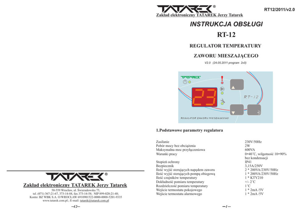 RT12/2011/v2.0 Zakład elektroniczny TATAREK Jerzy Tatarek INSTRUKCJA OBSŁUGI RT-12 REGULATOR TEMPERATURY ZAWORU MIESZAJĄCEGO V2.0 (24.05.2011 program 2v0) 1.Podstawowe parametry regulatora Zasilanie Pobór mocy bez obciążenia Maksymalna moc przyłączeniowa Warunki pracy Zakład elektroniczny TATAREK Jerzy Tatarek 50-559 Wrocław, ul. Świeradowska 75, tel. (071) 367-21-67, 373-14-88, fax 373-14-58; NIP 899-020-21-48; Konto: BZ WBK S.A. O/WROCŁAW 6910901522-0000-0000-5201-9335 www.tatarek.com.pl.; E-mail: [email protected] 12 230V/50Hz 2W 600VA 0÷40 oC, wilgotność 10÷90% bez kondensacji IP41 3,15A/250V 2 * 200VA/230V/50Hz 1 * 200VA/230V/50Hz 1 * KTY210 o +/- 2 C o 1C 1 * 2mA /5V 1 * 2mA /5V Stopień ochrony Bezpiecznik Ilość wyjść sterujących napędem zaworu Ilość wyjść sterujących pompą obiegową Ilość czujników temperatury Dokładność pomiaru temperatury Rozdzielczość pomiaru temperatury Wejście termostatu pokojowego Wejście termostatu alarmowego 1 2. Zasada działania Regulator steruje zaworem mieszającym, utrzymując zadaną przez użytkownika temperaturę na wyjściu zaworu. Zawór mieszający musi być wyposażony w odpowiedni napęd z silnikiem prądu zmiennego 230V i posiadać wbudowane wyłączniki krańcowe. Silnik napędu zaworu posiada dwa uzwojenia. Podanie napięcia na jedno uzwojenie „zamyka” zawór mieszający powodując obniżenie temperatury za zaworem, napięcie na drugim uzwojeniu „otwiera” zawór mieszający i podnosi temperaturę za nim. Regulator RT-12 wyposażony jest w czujnik temperatury do zamocowania na rurociągu za zaworem mieszającym oraz dwa wyjścia do sterowania napędem zaworu. Dodatkowo regulator RT-12 posiada wyjście do sterowania pompą obiegową. Możliwa jest także współpraca regulatora z termostatem pokojowym. Po osiągnięciu w danym pomieszczeniu temperatury zadanej na termostacie pokojowym, regulator automatycznie obniży temperaturę za zaworem mieszającym. Wartość tego obniżenia należy ustalić podczas instalacji o regulatora. Nastawa fabryczna to 15 C. Regulator RT-12 chroni odbiorniki ciepła podłączone za zaworem mieszającym przed wysoką temperaturą. Jeśli temperatura wzrośnie powyżej ustawionego progu zawór zostanie „zamknięty” i włączy się sygnał alarmowy. Regulator RT-12 pozwala także na podłączenie dodatkowego termostatu zabezpieczającego. Jeżeli instalacja odbierająca ciepło podłączona za zaworem mieszającym jest wrażliwa na zbyt wysoką temperaturę (np. niektóre typy ogrzewania podłogowego), można dołączyć do regulatora dodatkowy termostat alarmowy. Zadziałanie tego termostatu spowoduje „zamknięcie” zaworu mieszającego, wyłączenie i włączenie sygnału alarmowego. Naciśnięciem jednego klawisza można w łatwy sposób wyłączyć regulator (np. w sezonie letnim). Pompa obiegowa zostanie wtedy wyłączona a zawór mieszający „zamknięty”. Data przyjęcia Data wykonania Termostat pokojowy Regulator RT12 Zasilanie 230V AC Napęd zaworu Termostat alrmowy M KOCIOŁ Zawór mieszający Pompa obiegowa Czujnik temperatury Odbiorniki ciepła lub ogrzewanie podłogowe Rys.1 Układ pracy regulatora 2 11 Podpis UWAGI 2.1Praca regulatora DEKLARACJA ZGODNOŚCI CE Nr ref. 58.RT.01.2007/1/B ZAKŁAD ELEKTRONICZNY TATAREK Jerzy Tatarek ul. Świeradowska 75, 50-559 Wrocław deklaruje z pełną odpowiedzialnością, że: wyrób: Regulator temperatury zaworu mieszającego model: RT-12 Gdy napięcie zasilania zostanie doprowadzone do regulatora lub nastąpi jego załączenie z klawiatury, pompa obiegowa jest załączana. Regulator najpierw „zamyka” zawór mieszający. Procedura „zamykania” trwa 120 sekund. Następnie rozpoczyna się właściwa procedura regulacji. Algorytm porównuje zadaną temperaturę (ustawioną przez użytkownika) z temperaturą zmierzoną przez czujnik. Jeśli zmierzona temperatura jest za niska, regulator odpowiednim impulsem trochę „otwiera” zawór mieszający. Gdy zmierzona temperatura jest za wysoka, nastąpi lekkie „przymknięcie” zaworu mieszającego. Sprawdzanie temperatury i korekcję ustawienia zaworu mieszającego regulator wykonuje cyklicznie przez cały czas swojej pracy. Wielkość impulsów „otwierających” i „zamykających” oraz przerwa między nimi jest ustalana na podstawie różnicy miedzy temperaturą zadaną i zmierzoną, a także na podstawie szybkości zmian temperatury mierzonej. 2.2 Współpraca z termostatem pokojowym spełnia wymagania zasadnicze zawarte w postanowieniach Dyrektywy EMC 2004/108/WE z 15 grudnia 2004 (Ustawa z dnia 13 kwietnia 2007 o kompatybilności elektromagnetycznej) oraz Dyrektywy LVD 2006/95/WE z dnia 21 sierpnia 2007 r (Dz. U. z 2007 Nr 155 poz. 1089) w sprawie zasadniczych wymagań dla sprzętu elektrycznego. Do oceny zgodności zastosowano następujące normy zharmonizowane: PN-EN 60730-2-1: 2002 PN-EN 60730-1: 2012 PN-EN 55022: 2011 - Automatyczne regulatory elektryczne do użytku domowego i podobnegoCzęść 2-1: Wymagania szczegółowe dotyczące regulatorów elektrycznych do elektrycznych urządzeń domowych. Automatyczne regulatory elektryczne do użytku domowego i podobnego Część 1: Wymagania ogólne. Kompatybilność elektromagnetyczna (EMC)- Urządzenia informatyczne Charakterystyki zaburzeń radioelektrycznych Poziomy dopuszczalne i metody pomiaru. Zakład Elektroniczny TATAREK ma wdrożony system zarządzania i spełnia wymagania normy: ISO9001: 2000 CERTYFIKAT nr 133/2004 z 01.2004 Polska Izba Handlu Zagranicznego Regulator RT-12 może współpracować z termostatem pokojowym. Fabrycznie na zaciskach regulatora, gdzie należy podłączyć termostat pokojowy, wstawiona jest zwora, która umożliwia jego pracę bez termostatu. Po usunięciu zwory i podłączeniu termostatu (szczegóły rozdział: Instalowanie regulatora) algorytm działania regulatora ulegnie zmianie. Gdy temperatura w pokoju jest za niska (styk termostatu pokojowego jest zwarty) re