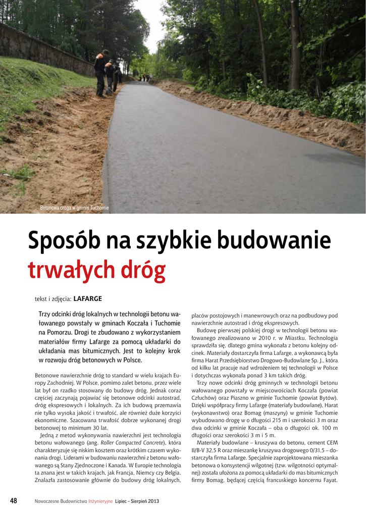 Betonowa droga w gminie Tuchomie Sposób na szybkie budowanie trwałych dróg tekst i zdjęcia: Lafarge Trzy odcinki dróg lokalnych w technologii betonu wałowanego powstały w gminach Koczała i Tuchomie na Pomorzu. Drogi te zbudowano z wykorzystaniem materiałów firmy Lafarge za pomocą układarki do układania mas bitumicznych. Jest to kolejny krok w rozwoju dróg betonowych w Polsce. Betonowe nawierzchnie dróg to standard w wielu krajach Europy Zachodniej. W Polsce, pomimo zalet betonu, przez wiele lat był on rzadko stosowany do budowy dróg. Jednak coraz częściej zaczynają pojawiać się betonowe odcinki autostrad, dróg ekspresowych i lokalnych. Za ich budową przemawia nie tylko wysoka jakość i trwałość, ale również duże korzyści ekonomiczne. Szacowana trwałość dobrze wykonanej drogi betonowej to minimum 30 lat. Jedną z metod wykonywania nawierzchni jest technologia betonu wałowanego (ang. Roller Compacted Concrete), która charakteryzuje się niskim kosztem oraz krótkim czasem wykonania drogi. Liderami w budowaniu nawierzchni z betonu wałowanego są Stany Zjednoczone i Kanada. W Europie technologia ta znana jest w takich krajach, jak Francja, Niemcy czy Belgia. Znalazła zastosowanie głównie do budowy dróg lokalnych, 48 Nowoczesne Budownictwo Inżynieryjne Lipiec – Sierpień 2013 placów postojowych i manewrowych oraz na podbudowy pod nawierzchnie autostrad i dróg ekspresowych. Budowę pierwszej polskiej drogi w technologii betonu wałowanego zrealizowano w 2010 r. w Miastku. Technologia sprawdziła się, dlatego gmina wykonała z betonu kolejny odcinek. Materiały dostarczyła firma Lafarge, a wykonawcą była firma Harat Przedsiębiorstwo Drogowo-Budowlane Sp. J., która od kilku lat pracuje nad wdrożeniem tej technologii w Polsce i dotychczas wykonała ponad 3 km takich dróg. Trzy nowe odcinki dróg gminnych w technologii betonu wałowanego powstały w miejscowościach Koczała (powiat Człuchów) oraz Piaszno w gminie Tuchomie (powiat Bytów). Dzięki współpracy firmy Lafarge (materiały budowlane), Harat (wykonawstwo) oraz Bomag (maszyny) w gminie Tuchomie wybudowano drogę w o długości 215 m i szerokości 3 m oraz dwa odcinki w gminie Koczała – oba o długości ok. 100 m długości oraz szerokości 3 m i 5 m. Materiały budowlane – kruszywa do betonu, cement CEM II/B-V 32,5 R oraz mieszankę kruszywa drogowego 0/31,5 – dostarczyła firma Lafarge. Specjalnie zaprojektowana mieszanka betonowa o konsystencji wilgotnej (tzw. wilgotności optymalnej) została ułożona za pomocą układarki do mas bitumicznych firmy Bomag, będącej częścią francuskiego koncernu Fayat. Nawierzchnie POLSKA Za produkcję mieszanki betonu wałowanego oraz wykonanie odcinków dróg odpowiedzialna była firma Harat. Inwestycji przyglądali się przedstawiciele obu gmin. „Drogi betonowe buduje się w całej Europie, dlatego też dobrze, że zaczęto je budować również u nas. Technologia betonu wałowanego daje duże możliwości, tak wykonana nawierzchnia jest bardzo trwała, a jej realizacja dużo szybsza. Szczególnie, że pojawiły się specjalistyczne maszyny, dzięki którym można to zrobić naprawdę solidnie. Z pewnością będziemy myśleć o kolejnych betonowych drogach w naszej gminie” – stwierdził Jerzy Lewi Kiedrowski, wójt gminy Tuchomie. „Budowanie dróg lokalnych z betonu wałowanego to technologia bardzo perspektywiczna, dlatego staramy się ją propagować i mamy nadzieję, że zrewolucjonizuje ona podejście władz lokalnych do budowy dróg. Ważne, by samorządy miały wiedzę o zaletach nawierzchni betonowych – powiedział Dariusz Bocheńczyk, dyrektor ds. badań i standaryzacji Lafarge. – Jako producent materiałów dla tego typu inwestycji systematycznie rozwijamy naszą ofertę handlową. Rozwój nowych produktów, zarówno spoiw, jak i mieszanek kruszywowych do budowy dróg, to jeden z naszych najważniejszych celów”. Konrad Harat, właściciel firmy Harat Przedsiębiorstwo Drogowo-Budowlane Sp. J., zwrócił uwagę na istotną cechę betonu wałowanego, a mianowicie czas wiązania. „Już po ułożeniu można po nim chodzić, a dwa, trzy dni później droga nadaje się w pełni do użytku. Zainteresowane są nią przede wszystkim gminy, naprawiające drogi lokalne i nadleśnictwa, bo to szybki sposób na utwardzenie i wzmocnienie dróg gruntowych. Jestem przekonany, że pod względem ekonomicznym i jakościowym budowa trwałych dróg lokalnych z betonu wałowanego jest dla samorządów optymalnym rozwiązaniem” – powiedział Konrad Harat. Układanie pierwszego metra betonowej drogi Ekipa na etapie 50. metra Maszyny dostarczyła firma Bomag, za wykonanie odpowiedzialna była firma Harat Lipiec – Sierpień 2013 Nowoczesne Budownictwo Inżynieryjne 49 POLSKA Nawierzchnie Mirosław Król, dyrektor generalny Fayat Bomag Polska, podkreślił znaczenie dobrej współpracy partnerów i rolę wysoko wydajnych maszyn. „Wszystko udało się świetnie dzięki pozytywnemu nastawieniu i współpracy stron uczestniczących w przedsięwzięciu oraz władz lokalnych. Nasza flagowa rozkładarka BF 800C została z powodzeniem przetestowana przez firmę Harat. Drogi miały szerokość 3 m i 5 m, lecz model układarki BF 800C daje możliwość ustawienia szerokości rozkładania nawierzchni nawet do 10 m. Niezawodny silnik Deutza o mocy 201 KM pracuje z wydajnością 800 t/h. Rozkładarka Bomag potwierdziła swoją klasę i jestem przekonany, że znajdzie swoje miejsce we flocie firmy Harat i innych firm z branży drogowej” – podsumował Mirosław Król. Zalety wykonywania nawierzchni z betonu wałowanego Podawanie betonu na układarkę Budowanie dróg lokalnych z betonu wałowanego to technologia bardzo perspektywiczna, dlatego staramy się ją propagować i mamy nadzieję, że zrewolucjonizuje ona podejście władz lokalnych do budowy dróg. Krótki czas realizacji – droga jest przejezdna dla samochodów osobowych n