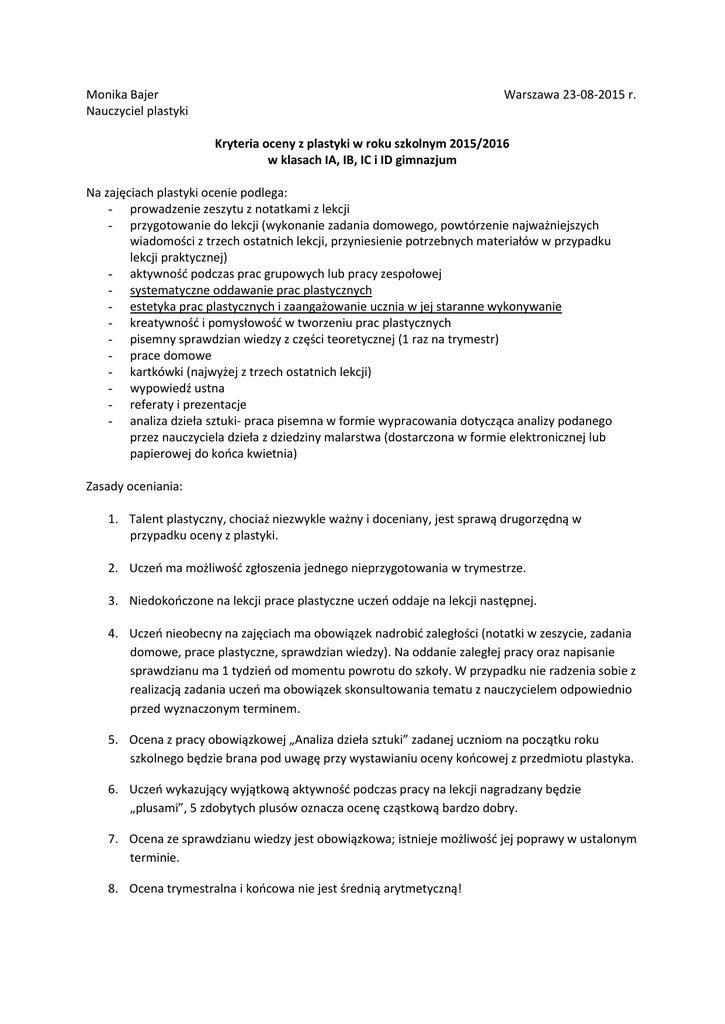 Monika Bajer Nauczyciel plastyki Warszawa 23-08-2015 r. Kryteria oceny z plastyki w roku szkolnym 2015/2016 w klasach IA, IB, IC i ID gimnazjum Na zajęciach plastyki ocenie podlega: - prowadzenie zeszytu z notatkami z lekcji - przygotowanie do lekcji (wykonanie zadania domowego, powtórzenie najważniejszych wiadomości z trzech ostatnich lekcji, przyniesienie potrzebnych materiałów w przypadku lekcji praktycznej) - aktywność podczas prac grupowych lub pracy zespołowej - systematyczne oddawanie prac plastycznych - estetyka prac plastycznych i zaangażowanie ucznia w jej staranne wykonywanie - kreatywność i pomysłowość w tworzeniu prac plastycznych - pisemny sprawdzian wiedzy z części teoretycznej (1 raz na trymestr) - prace domowe - kartkówki (najwyżej z trzech ostatnich lekcji) - wypowiedź ustna - referaty i prezentacje - analiza dzieła sztuki- praca pisemna w formie wypracowania dotycząca analizy podanego przez nauczyciela dzieła z dziedziny malarstwa (dostarczona w formie elektronicznej lub papierowej do końca kwietnia) Zasady oceniania: 1. Talent plastyczny, chociaż niezwykle ważny i doceniany, jest sprawą drugorzędną w przypadku oceny z plastyki. 2. Uczeń ma możliwość zgłoszenia jednego nieprzygotowania w trymestrze. 3. Niedokończone na lekcji prace plastyczne uczeń oddaje na lekcji następnej. 4. Uczeń nieobecny na zajęciach ma obowiązek nadrobić zaległości (notatki w zeszycie, zadania domowe, prace plastyczne, sprawdzian wiedzy). Na oddanie zaległej pracy oraz napisanie sprawdzianu ma 1 tydzień od momentu powrotu do szkoły. W przypadku nie radzenia sobie z realizacją zadania uczeń ma obowiązek skonsultowania tematu z nauczycielem odpowiednio przed wyznaczonym terminem. 5. Ocena z pracy obowiązkowej „Analiza dzieła sztuki” zadanej uczniom na początku roku szkolnego będzie brana pod uwagę przy wystawianiu oceny końcowej z przedmiotu plastyka. 6. Uczeń wykazujący wyjątkową aktywność podczas pracy na lekcji nagradzany będzie „plusami”, 5 zdobytych plusów oznacza ocenę cząstkową bardzo dobry. 7. Ocena ze sprawdzianu wiedzy jest obowiązkowa; istnieje możliwość jej poprawy w ustalonym terminie. 8. Ocena trymestralna i końcowa nie jest średnią arytmetyczną! 9. Każda praca pisemna i plastyczna pozostaje do wglądu ucznia. Prace są przechowywane w pracowni plastycznej przez cały rok w wyznaczonym dla klasy segregatorze, do którego uczeń ma dostęp za wiedzą nauczyciela. 10. Każda ocena z pracy pisemnej i plastycznej jest uzasadniona przyznaną punktacją lub pisemnym komentarzem. 11. Jeśli pisemne uzasadnienie oceny z pracy pisemnej nie jest wystarczające dla ucznia (rodzica/prawnego opiekuna), to nauczyciel, na prośbę zainteresowanych, udziela dodatkowego uzasadnienia w formie ustnej. 12. Waga: waga 1 - praca domowa, aktywność, zeszyt, odpowiedzi ustne, prace plastyczne; waga 2 – kartkówki , referaty i inne prezentacje; waga 3 – pisemne prace kontrolne, poprawa pracy kontrolnej, analiza obrazu. O wyższą niż przewidywana ocenę trymestralną/końcową ubiegać mogą się uczniowie, którzy: prowadzą notatki, uzupełniając je za czas nieobecności; systematycznie oddają wszystkie zadane prace; w określonym terminie oddają kolejno 3 prace z Ligii Naukowej (ocenione na minimum ocenę bardzo dobry) mają zaliczone prace obowiązkowe (2 sprawdziany wiedzy i analiza dzieła sztuki) WYMAGANIA NA POSZCZEGÓLNE OCENY Ocena celująca: Uczeń opanował wiedzę i umiejętności przewidziane na ocenę bardzo dobrą w stopniu pełnym. posiada imponujący zasób wiedzy i wysoki poziom umiejętności, uczestniczy w konkursach plastycznych wykorzystywał wiedzę i umiejętności w nowych sytuacjach poznawczych pracował systematycznie, zawsze był przygotowany i aktywny na lekcjach, wykorzystywał dodatkowe zadania wykraczające poza obowiązkowe czynności lekcyjne, widać jego pasję w rozwijaniu swoich zainteresowań wykonał prace z zakresu Ligii Naukowej z plastyki wykonał wystawę wytworów swojej twórczości Ocena bardzo dobra: Uczeń opanował wiedzę i umiejętność w zakresie treści określonych programem: posiada wiedzę uzyskaną w wyniku rozwijania zainteresowań przedmiotem i umiejętność zastosowania jej w swojej pracy twórczej, aktywnie pracował indywidualnie i zespołowo, uczestniczył w konkursach przedmiotowych, stosował swoją wiedzę w nowych sytuacjach poznawczych, dobrowolnie wykorzystywał prace związane ze zdobywaniem i z zastosowaniem wiedzy i umiejętności. Ocena dobra: Uczeń opanował treści najważniejsze w strukturze przedmiotu/ wykazał się umiejętnością zastosowania wiadomości w sytuacjach typowych, według wzorów i schematów z lekcji i podręczników, jest aktywny na lekcjach i zadowalająco wykonuje zadania związane z procesem lekcyjnym, czasami podejmuje dodatkowe zadania plastyczne. Ocena dostateczna: Uczeń opanował wiadomości i umiejętności na poziomie nie przekraczającym wymagań określonych w podstawie programowej. Wykazywał się niewielką aktywnością na lekcjach, często był nieprzygotowany, Ćwiczenia plastyczne wykonywał niestarannie, niewielkim nakładem pracy. Ocena dopuszczająca: Uczeń opanował zakres wiedzy i umiejętności w nikłym zakresie, nie przekreśla to jednak szansy na uzyskanie podstawowej wiedzy z przedmiotu w ciągu dalszej nauki. Poza tym: Nie był aktywny na lekcjach, Niedbale wykonywał prace plastyczne, Wyraża chęć poprawy. Ocena niedostateczna: Uczeń nie opanował zakresu wiadomości i umiejętności przewidzianych w podstawie programowej. Poza tym: Ostentacyjnie wyraża lekceważący stosunek do przedmiotu, nauczyciela lub kolegów Przeszkadza w prowadzeniu lekcji Odmawia wykonywania zadań praktycznych i teoretycznych Nie wykazuje chęci poprawy, więc nie rokuje nadziei na uzyskanie podstawowej wiedzy z danego przedmiotu w ciągu dalszej nauki.