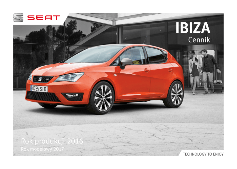 IBIZA Cennik Rok produkcji 2016 Rok modelowy 2017 TECHNOLOGY TO ENJOY MOCNO WYPOSAŻONA IBIZA / ŚWIATŁA LED / CZUJNIKI PARKOWANIA / FELGI ALUMINIOWE JUŻ ZA 470 zł/mc SPRAWDŹ INNE FORMY FINANSOWANIA NA WWW.SEAT-AUTO.PL TECHNOLOGY TO ENJOY SEAT FINANCIAL SERVICES Rzeczywista Roczna Stopa Oprocentowania (RRSO) wynosi 5,36% dla reprezentatywnego przykładu: cena samochodu: 62 055 zł; wkład własny: 18 617 zł; całkowita kwota kredytu: 43 439 zł; stopa oprocentowania kredytu: 0%; całkowity koszt kredytu: 4 797 zł obejmuje: prowizję bankową: 0 zł, odsetki: 0 zł, składkę ubezpieczenia komunikacyjnego: 1 862 zł, składkę ubezpieczenia spłaty kredytu: 2 935 zł; rzeczywista roczna stopa oprocentowania: 5,36%; czas obowiązywania umowy: 48 miesięcy; całkowita kwota do zapłaty przez konsumenta: 48 236 zł; wysokość raty: 1 005 zł. Produkt każdorazowo dostępny jest w wariancie 0% odsetek, 0% prowizji, 0% wkładu własnego, wówczas pozostałe dane dotyczące kosztów kredytu (podane powyżej) mogą ulec zmianie. Oferta Volkswagen Bank Polska S.A. na wybrane modele przy skorzystaniu z ubezpieczenia komunikacyjnego i ubezpieczenia spłaty kredytu oferowanych przez Volkswagen Serwis Ubezpieczeniowy Sp. z o.o. Niniejsza informacja nie stanowi oferty w rozumieniu kodeksu cywilnego. Dostępność i warunki produktu mogą ulec zmianie. Warunki produktu określa umowa. s Wyposażenie standardowe, – Niedostępne, –/ s Standard z wybranym silnikiem Seria specjalna IBIZA COLOUR EDITION Pakiet LED: podwójne reflektory ze światłami do jazdy dziennej LED i tylne światła LED Klimatyzacja automatyczna Climatronic Media System Plus: 6,5-calowy kolorowy ekran dotykowy, Radio z odtwarzaczem CD/MP3/ WMA, złącza USB, SD, Aux-in, 6 głośników, Bluetooth, sterowanie głosowe Czujniki parkowania z przodu i z tyłu 16-calowe felgi aluminiowe „DESIGN VELVET” lub „DESIGN BISMUTH” oraz inne elementy stylistyczne w kolorze VELVET lub BISMUTH Bismuth cena od: 53 700zł Velvet PAKIETY PROMOCYJNE Pakiet COMFORT+ dla wersji Style Pakiet COMFORT+ dla wersji FR / Czujniki parkowania z tyłu / 15-calowe felgi aluminiowe IBIA / Pakiet LED: Podwójne reflektory ze światłami do jazdy dziennej LED i tylne światła LED / Czujniki parkowania z tyłu 1 zł COMFORT+ cena pakietu / Przyciemniane szyby / Pakiet elektroniczny: el. składane lusterka, czujnik deszczu, czujnik zmierzchu (automatyczne światła), funkcja opóźnionego wyłączania świateł "Coming and Leaving Home", automatycznie ściemniające się lusterko wsteczne 1 zł COMFORT+ cena pakietu Zyskujesz 3745 zł Zestaw felg aluminiowych za 1zł dla wersji Reference Zyskujesz 2636 zł Zyskujesz 2457 zł W pakiecie Comfort+ tylko dla wersji FR istnieje możliwość zamiany czujników parkowania z tyłu na czujniki parkowania z przodu i z tyłu za dopłatą 662 zł do ceny pakietu. W pakietach Comfort+ nie ma możliwości wymiany felg na inny rodzaj. Pakiety wykluczają się ze wszystkimi innymi pakietami zawierającymi inny rodzaj felg. Pakiet Comfort+ jest niedostępny z silnikiem 1.0 EcoTSI Start&Stop 110 KM z manualną skrzynią biegów. W wersji Reference możesz zyskać 2 457 zł kupując zestaw felg aluminiowych za 1 zł. s Wyposażenie standardowe, – Niedostępne, –/ s Standard z wybranym silnikiem CENNIK obowiązuje od 28.09.2016 PRODUKCJI 2016 IBIZAROKSC (wersja 3-drzwiowa) WERSJA WYPOSAŻENIA już od 380 zł miesięcznie * ROK MODELOWY 2017 SILNIK SKRZYNIA BIEGÓW CENY 1.0 MPI 75 KM manualna 5-biegowa 45 800 zł Wybierz promocyjny pakiet Comfort+ za 1 zł 1.2 TSI 90 KM manualna 5-biegowa 49 900 zł REFERENCE Wybierz promocyjny zestaw felg aluminiowych za 1 zł STYLE FR 1.2 TSI 110 KM manualna 6-biegowa 62 300 zł Wybierz promocyjny pakiet Comfort+ za 1 zł 1.4 EcoTSI Start&Stop 150 KM manualna 6-biegowa 70 600 zł CUPRA 1.8 TSI Start&Stop 192 KM manualna 6-biegowa 78 100 zł TSI – Turbo Stratified Injection (silnik benzynowy), CR – Common Rail (diesel) Wszystkie modele objęte są 4-letnią Ochroną Gwarancyjną SEAT. (2 lata gwarancji podstawowej + 2 lata przedłużonej gwarancji SEAT do limitu 120 tyś km przebiegu) W wersji Style możesz zyskać 3 745 zł kupując promocyjny pakiet Comfort+ za 1 zł. W wersji FR możesz zyskać 2636 zł wybierając pakiet Comfort+ zł za 1 zł. W wersji Reference możesz zyskać 2 457 zł kupując zestaw felg aluminiowych za 1 zł * Podana kwota stanowi miesięczną ratę brutto Kredytu Moc Niskich Rat. Parametry przyjęte do kalkulacji raty: cena samochodu: 45 800 zł, opłata wstępna: 13 740 zł, okres kredytu: 48 miesięcy, roczny przebieg 20 000 km, finalna rata określona w umowie. SEAT KREDYT MOC NISKICH RAT 0% - Rzeczywista Roczna Stopa Oprocentowania (RRSO) wynosi 5,99%, całkowita kwota kredytu (bez kredytowanych kosztów) 97 200 zł, całkowita kwota do zapłaty 115 492 zł, oprocentowanie zmienne 0,8%, całkowity koszt kredytu 18 292 zł (w tym: prowizja 5 369 zł, odsetki 2 743 zł, ubezpieczenie komunikacyjne na 1. rok 3 645 zł, ubezpieczenie spłaty kredytu 6 535 zł, 47 miesięcznych rat równych po 1 214 zł; rata finalna 57 227 zł. Oferta na wybrane modele SEATA przy skorzystaniu z ubezpieczenia komunikacyjnego i ubezpieczenia spłaty kredytu oferowanych przez Volkswagen Serwis Ubezpieczeniowy Sp. z o.o. Niniejsza informacja nie stanowi oferty w rozumieniu kodeksu cywilnego. Dostępność i warunki produktu mogą ulec zmianie. Warunki produktu określa umowa. CENNIK obowiązuje od 28.09.2016 IBIZA (wersja 5-drzwiowa) WERSJA WYPOSAŻENIA REFERENCE Wybierz promocyjny zestaw felg aluminiowych za 1 zł STYLE Wybierz promocyjny pakiet Comfort+ za 1 zł COLOUR EDITION FR Wybierz promocyjny pakiet Comfort+ za 1 zł już od 385 zł miesięcznie * ROK MODELOWY 2017 SILNIK SKRZYNIA BIEGÓW CENY 1.0 MPI 75 KM manualna 5-biegowa 47 300 zł 1.2 TSI 90 KM manualna 5-biegowa 49 400 zł 1.4 TDI CR 90 KM manualna 5-biegowa 63 700 zł 1.0 MPI 75 KM manualna 5-biegowa 49 200 