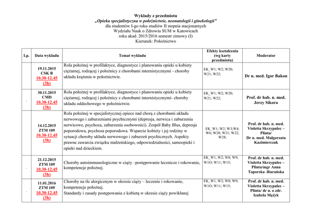 Wykłady z przedmiotu „Opieka specjalistyczna w położnictwie, neonatologii i ginekologii” dla studentów I-go roku studiów II stopnia stacjonarnych Wydziału Nauk o Zdrowiu SUM w Katowicach roku akad. 2015/2016 semestr zimowy (I) Kierunek: Położnictwo Lp. Data wykładu 19.11.2015 CSK B 10.30-12.45 (3h) . 30.11.2015 CMD 10.30-12.45 (3h) 14.12.2015 ZTM 109 10.30-12.45 (3h) . . 21.12.2015 ZTM 109 10.30-12.45 (3h) 11.01.2016 ZTM 109 10.30-12.45 (3h) Temat wykładu Efekty kształcenia (wg karty przedmiotu) Rola położnej w profilaktyce, diagnostyce i planowaniu opieki u kobiety ciężarnej, rodzącej i położnicy z chorobami internistycznymi - choroby układu krążenia w położnictwie. EK_W1; W2; W20; W21; W22; Rola położnej w profilaktyce, diagnostyce i planowaniu opieki u kobiety ciężarnej, rodzącej i położnicy z chorobami internistycznymi- choroby układu oddechowego w położnictwie. EK_W1; W2; W20; W21; W22; Rola położnej w specjalistycznej opiece nad chorą z chorobami układu nerwowego i zaburzeniami psychicznymi (depresja, nerwica i zaburzenia nerwicowe, psychoza, zaburzenia osobowości). Zespół Baby Blus, depresja poporodowa, psychoza poporodowa. Wsparcie kobiety i jej rodziny w sytuacji choroby układu nerwowego i zaburzeń psychicznych. Aspekty prawne zawarcia związku małżeńskiego, odpowiedzialności, samoopieki i opieki nad dzieckiem. Choroby autoimmunologiczne w ciąży –postępowanie lecznicze i rokowanie, kompetencje położnej. Choroby na tle alergicznym w okresie ciąży – leczenie i rokowanie, kompetencje położnej. Standardy i zasady postępowania z kobietą w okresie ciąży powikłanej EK_W1; W2; W3;W4; W6; W20; W21; W22; W28; Moderator Dr n. med. Igor Bakon Prof. dr hab. n. med. Jerzy Sikora Prof. dr hab. n. med. Violetta Skrzypulec – Plinta/ Dr n. med. Małgorzata Kazimierczak EK_W1, W2; W8; W9; W1O; W11; W15; Prof. dr hab. n. med. Violetta Skrzypulec – Plinta/mgr Anna Toporska -Rurańska EK_W1, W2; W8; W9; W1O; W11; W15; Prof. dr hab. n. med. Violetta Skrzypulec – Plinta/ dr n. o zdr. Izabela Mężyk schorzeniami onkologicznymi. 18.01.2016 ZTM 109 10.30-12.45 (3h) 25.01.2016 ZTM 109 10.30 – 12.00 (2h) Profilaktyka wad wrodzonych u płodu, edukacja przedkoncepcyjna. Zabiegi inwazyjne w położnictwie, rola położnej w specjalistycznej opiece nad ciężarną i rodzącą. Badania w kierunku ustalenia biologicznego ojcostwa, macierzyństwa oraz pokrewieństwa dalszego stopnia. Niezgodność i konflikt serologiczny. Diagnostyka i leczenie. Komplikacje kliniczne. EK_W15; W16; W23; W24; W25; EK_W85 Prof. dr hab. n. med. Violetta Skrzypulec – Plinta/ mgr Anna Toporska -Rurańska Prof. dr hab. n. med. Violetta Skrzypulec – Plinta/ mgr Anna Toporska Rurańska CMD – Centrum Medycyny Doświadczalnej Katowice ul. Medyków 4 Zajęcia praktyczne z przedmiotu „Opieka specjalistyczna w położnictwie, neonatologii i ginekologii” dla studentów I-go roku studiów II stopnia stacjonarnych Wydziału Nauk o Zdrowiu SUM w Katowicach roku akad. 2015/2016 semestr zimowy (I) Kierunek: Położnictwo godz. 7.00-14.30 (10h) L.p. Data Temat zajęć praktycznych 1. 06.10.2015 1.Rola położnej w specjalistycznej opiece nad ciężarną, rodząca i położnicą z chorobami układu nerwowego i zaburzeniami psychicznymi (depresja, nerwica i zaburzenia nerwicowe, psychoza, zaburzenia osobowości). Planowanie opieki, ocena stanu zdrowia psychicznego. Tworzenie planu wsparcia kobiety i jej rodziny w sytuacji choroby układu nerwowego i zaburzeń psychicznych. 7.00-14.30 (10h) 2.Choroby autoimmunologiczne w ciąży –postępowanie lecznicze i rokowanie, kompetencje położnej. Choroby na tle alergicznym w okresie ciąży – leczenie i rokowanie, kompetencje położnej. Standardy i zasady postępowania z kobietą w okresie ciąży powikłanej Efekty kształcenia (wg karty przedmiotu) Moderator EK_U11;U1; U2; U3; U4; U6; U7; U8; U12; U16; U44; Z 5 dr n. o zdr. Izabela Mężyk – Bytom Z 6 dr n. med. Małgorzata Kazimierczak – BOG. EK_U1; U2; U3; U4; U6; U7; U8; U44; schorzeniami onkologicznymi. ocena stanu zdrowia ciężarnej. tworzenie planu opieki na podstawie postawionej diagnozy położniczo-pielęgniarskiej. 2. 13.10.2015 7.00-14.30 (10h) 1.Rola położnej w specjalistycznej opiece nad ciężarną, rodząca i położnicą z chorobami układu nerwowego i zaburzeniami psychicznymi (depresja, nerwica i zaburzenia nerwicowe, psychoza, zaburzenia osobowości). Planowanie opieki, ocena stanu zdrowia psychicznego. Tworzenie planu wsparcia kobiety i jej rodziny w sytuacji choroby układu nerwowego i zaburzeń psychicznych. 2.Choroby autoimmunologiczne w ciąży –postępowanie lecznicze i rokowanie, kompetencje położnej. Choroby na tle alergicznym w okresie ciąży – leczenie i rokowanie, kompetencje położnej. Standardy i zasady postępowania z kobietą w okresie ciąży powikłanej schorzeniami onkologicznymi. ocena stanu zdrowia ciężarnej. tworzenie planu opieki na podstawie postawionej diagnozy położniczo-pielęgniarskiej. 3. 20.10.2015 7.00-14.30 (10h) 1.Rola położnej w specjalistycznej opiece nad ciężarną, rodząca i położnicą z chorobami układu nerwowego i zaburzeniami psychicznymi (depresja, nerwica i zaburzenia nerwicowe, psychoza, zaburzenia osobowości). Planowanie opieki, ocena stanu zdrowia psychicznego. Tworzenie planu wsparcia kobiety i jej rodziny w sytuacji choroby układu nerwowego i zaburzeń psychicznych. 2.Choroby autoimmunologiczne w ciąży –postępowanie lecznicze i rokowanie, kompetencje położnej. Choroby na tle alergicznym w okresie ciąży – leczenie i rokowanie, kompetencje położnej. Standardy i zasady postępowania z kobietą w okresie ciąży powikłanej schorzeniami onkologicznymi. ocena stanu zdrowia ciężarnej. tworzenie planu opieki na podstawie EK_U11;U1; U2; U3; U4; U6; U7; U8; U12; U16; U44; Z 7 dr n. o zdr. Izabela Mężyk – Bytom Z 8 dr n. med. EK_U1; U2; U3; U4; U6; Małgorzata Kazimier