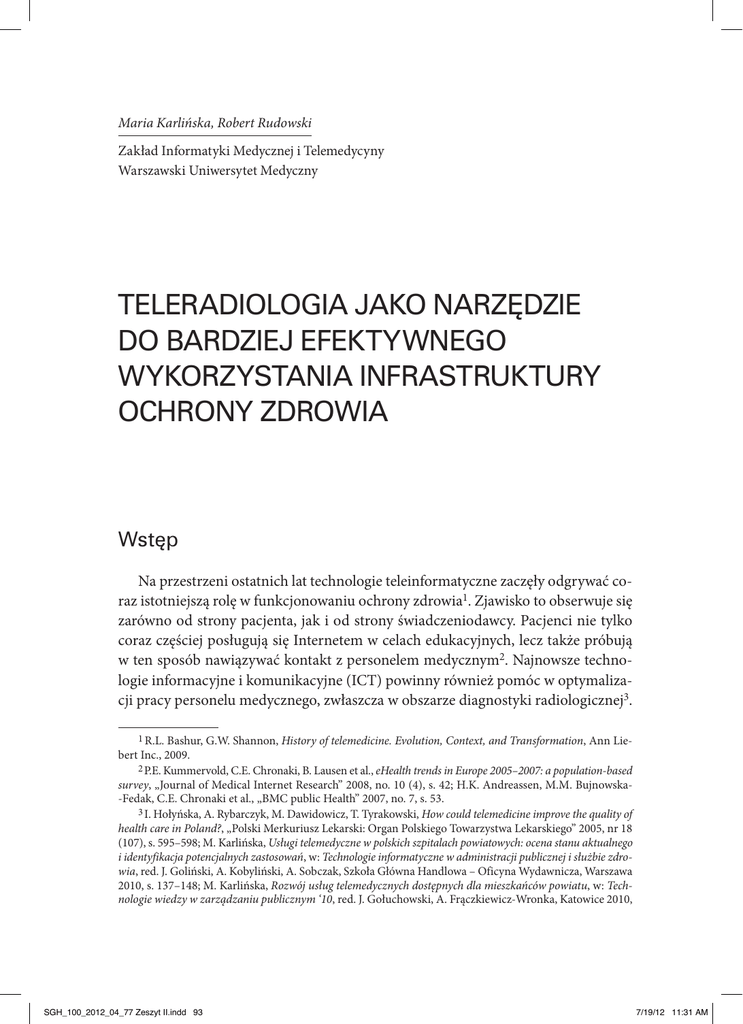Maria Karlińska, Robert Rudowski Zakład Informatyki Medycznej i Telemedycyny Warszawski Uniwersytet Medyczny Teleradiologia jako narzędzie do bardziej efektywnego wykorzystania infrastruktury ochrony zdrowia Wstęp Na przestrzeni ostatnich lat technologie teleinformatyczne zaczęły odgrywać co‑ raz istotniejszą rolę w funkcjonowaniu ochrony zdrowia1. Zjawisko to obserwuje się zarówno od strony pacjenta, jak i od strony świadczeniodawcy. Pacjenci nie tylko coraz częściej posługują się Internetem w celach edukacyjnych, lecz także próbują w ten sposób nawiązywać kontakt z personelem medycznym2. Najnowsze techno‑ logie informacyjne i komunikacyjne (ICT) powinny również pomóc w optymaliza‑ cji pracy personelu medycznego, zwłaszcza w obszarze diagnostyki radiologicznej3. 1 R.L. Bashur, G.W. Shannon, History of telemedicine. Evolution, Context, and Transformation, Ann Lie‑ bert Inc., 2009. 2 P.E. Kummervold, C.E. Chronaki, B. Lausen et al., eHealth trends in Europe 2005–2007: a population‑based survey, „Journal of Medical Internet Research” 2008, no. 10 (4), s. 42; H.K. Andreassen, M.M. Bujnowska ‑Fedak, C.E. Chronaki et al., „BMC public Health” 2007, no. 7, s. 53. 3 I. Hołyńska, A. Rybarczyk, M. Dawidowicz, T. Tyrakowski, How could telemedicine improve the quality of health care in Poland?, „Polski Merkuriusz Lekarski: Organ Polskiego Towarzystwa Lekarskiego” 2005, nr 18 (107), s. 595–598; M. Karlińska, Usługi telemedyczne w polskich szpitalach powiatowych: ocena stanu aktualnego i identyfikacja potencjalnych zastosowań, w: Technologie informatyczne w administracji publicznej i służbie zdro‑ wia, red. J. Goliński, A. Kobyliński, A. Sobczak, Szkoła Główna Handlowa – Oficyna Wydawnicza, Warszawa 2010, s. 137–148; M. Karlińska, Rozwój usług telemedycznych dostępnych dla mieszkańców powiatu, w: Tech‑ nologie wiedzy w zarządzaniu publicznym ‘10, red. J. Gołuchowski, A. Frączkiewicz‑Wronka, Katowice 2010, SGH_100_2012_04_77 Zeszyt II.indd 93 7/19/12 11:31 AM Maria Karlińska, Robert Rudowski Nowoczesne techniki obrazowania są wykorzystywane w codziennej praktyce kli‑ nicznej w szpitalach uniwersyteckich, ale stają się dostępne również w małych szpi‑ talach powiatowych. Wynika to z upowszechnienia się technologii oraz możliwości refinansowania tego typu inwestycji z funduszy Unii Europejskiej (Program Opera‑ cyjny „Infrastruktura i środowisko” oraz Regionalne Programy Operacyjne), budżetu państwa (np. Narodowy program zwalczania chorób nowotworowych) oraz środków organizacji pozarządowych (np. Fundacja Wielkiej Orkiestry Świątecznej Pomocy)4. Ocenia się, że wartość rynku diagnostyki obrazowej w Polsce osiągnęła w 2009 roku wartość blisko 674 mln zł, a w 2012 roku najprawdopodobniej prze‑ kroczy 1 mld zł5. Przy tak dużej dynamice wzrostu kluczowe wydaje się dążenie do optymalizacji procesu udzielania świadczeń. Świadczeniodawcy muszą liczyć się z kosztami wynikającymi z potrzeby zatrudnienia dodatkowej wysoko kwalifiko‑ wanej kadry medycznej. Dlatego też coraz więcej małych ośrodków decyduje się na instalowanie systemów teleinformatycznych, umożliwiających transmisję obrazu w celu zdalnej interpretacji wyniku lub przeprowadzenia specjalistycznej konsultacji6. Sprawna i bezpieczna wymiana informacji powinna przekładać się na wzrost wy‑ dajności przy jednoczesnej poprawie jakości świadczeń i zmniejszaniu ryzyka błędów lekarskich. Należy jednak pamiętać, że telemedycyna nie jest panaceum na wszystko i w wielu obszarach jej kosztowa efektywność pozostaje wątpliwa7. Co więcej, ist‑ nieje wiele formalno‑ekonomicznych przeszkód utrudniających jej implementację w warunkach polskich8. Wydaje się jednak, że upowszechnienie konsultacji teleradiologicznych w celu optymalizacji wykorzystania dostępnej aparatury i pracy lekarzy radiologów może poprawić efektywność całego systemu ochrony zdrowia w Polsce. W piśmiennictwie brakuje opracowań dotyczących tego obszaru. Dlatego też celem niniejszej pracy jest ocena potrzeb oraz możliwości szerszej implementacji teleradiologii w oparciu o ist‑ niejącą infrastrukturę i zasoby informatyczne szpitali w Polsce. s. 201–209; G. Boland, Review Teleradiology: Another Revolution in Radiology?, „Technology” 1998, no. 53, s. 547–553; R. Tadeusiewicz, Systemowe podejście do wybranych zagadnień telemedycyny, w: Techniki infor‑ macyjne w badaniach systemowych, red. O. Hryniewicz, J. Kacprzyk, P. Kulczycki, Wydawnictwa Naukowo‑ -Techniczne, Warszawa 2007, s. 341–360; P. Ruotsalainen, Privacy and security in teleradiology, „European Journal of Radiology” 2010, no. 73 (1), s. 31–35; F.H. Barneveld Binkhuysen, E.R. Ranschaert, Teleradiology: evolution and concepts, „European Journal of Radiology” 2011, no. 78 (2), s. 205–209. 4 A. Bęben, Sieci bardzo obrazowe, Rynek Zdrowia, http://www.rynekzdrowia.pl/Rynek‑Zdrowia/Sieci ‑bardzo‑obrazowe,52169.html [dostęp 15.11.2011]. 5 A. Stawarska, M. Stefańczyk, Rynek diagnostyki obrazowej w Polsce 2010. Prognozy rozwoju na lata 2010–2012, PMR Publications, Kraków 2010. 6 M. Karlińska, Usługi telemedyczne, op.cit.; M. Karlińska, Rozwój usług, op.cit. 7 R. Sarin, Telemedicine Complements Effective Health‑Care Delivery but Is Not a Panacea, „PLoS Medi‑ cine” 2006, no. 3 (8), s. 2. 8 Ibidem; P. Ruotsalainen, op.cit.; R. Rudowski, Telemedicine in the context of different medical specialties. The Polish perspective, „Polish Journal of Pathology: Official Journal of the Polish Society of Pathologists” 2003, no. 54 (3), s. 219–221. 94 SGH_100_2012_04_77 Zeszyt II.indd 94 7/19/12 11:31 AM Teleradiologia jako narzędzie do bardziej efektywnego wykorzystania infrastruktury ochrony zdrowia Materiał i metoda W niniejszej pracy wykorzystano najnowsze dane oficjalnej statystyki publicz‑ nej udostępniane przez 