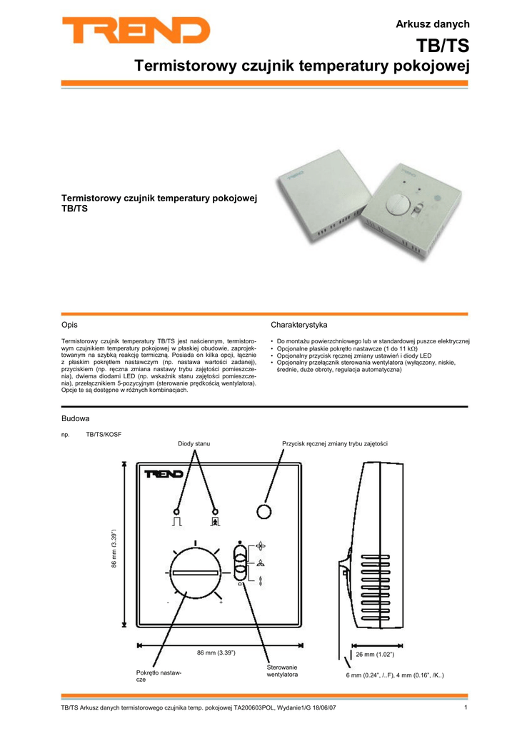 Arkusz danych TB/TS Termistorowy czujnik temperatury pokojowej Termistorowy czujnik temperatury pokojowej TB/TS Opis Charakterystyka Termistorowy czujnik temperatury TB/TS jest naściennym, termistorowym czujnikiem temperatury pokojowej w płaskiej obudowie, zaprojektowanym na szybką reakcję termiczną. Posiada on kilka opcji, łącznie z płaskim pokrętłem nastawczym (np. nastawa wartości zadanej), przyciskiem (np. ręczna zmiana nastawy trybu zajętości pomieszczenia), dwiema diodami LED (np. wskaźnik stanu zajętości pomieszczenia), przełącznikiem 5-pozycyjnym (sterowanie prędkością wentylatora). Opcje te są dostępne w róŜnych kombinacjach. • • • • Do montaŜu powierzchniowego lub w standardowej puszce elektrycznej Opcjonalne płaskie pokrętło nastawcze (1 do 11 kΩ) Opcjonalny przycisk ręcznej zmiany ustawień i diody LED Opcjonalny przełącznik sterowania wentylatora (wyłączony, niskie, średnie, duŜe obroty, regulacja automatyczna) Budowa np. TB/TS/KOSF Przycisk ręcznej zmiany trybu zajętości 86 mm (3,39”) Diody stanu - + 86 mm (3.39”) Pokrętło nastawcze 26 mm (1.02”) Sterowanie wentylatora TB/TS Arkusz danych termistorowego czujnika temp. pokojowej TA200603POL, Wydanie1/G 18/06/07 6 mm (0.24”, /..F), 4 mm (0.16”, /K..) 1 TB/TS Arkusz danych FUNKCJONALNOŚĆ Obudowa TB/TS jest zaprojektowany do montaŜu w ścianie, ale moŜna go montować w standardowej puszce albo na płaskiej powierzchni. TB/TS Podstawowy czujnik TB/TS składa się ze standardowego, termistorowego elementu czujnika Trend (10 kΩ przy 25°C, 77°F) do pomieszczeniowego pomiaru temperatury. Istnieją opcje dla wejścia pokrętła, wejścia przycisku ręcznej zmiany zajętości, wyjścia wskaźnika stanu i wejścia sterowania wentylatorem. Istnieją trzy wersje konstrukcyjne; wersja, jaka zostanie zastosowana zaleŜy od wybranego zestawu opcji: Dwa zaciski: TB/TS Połówka płytki z 3 zaciskami: TB/TS/K Pełna płytka z 6 zaciskami: TB/TS/OS, /KO, /KOS, /KOF, /KOSF, /KE, /KEF PoniŜszy schemat elektryczny ilustruje pełen zestaw opcji. TB/TS wykorzystuje 2 nieoznaczone zaciski, gdyŜ biegunowość nie jest istotna, TB/TS/K wykorzystuje połówkę płytki ze złączem 3zaciskowym, a wszystkie inne opcje wykorzystują pełną płytkę ze złączem 6zaciskowym. Na płytce pełnej znajdują się fabrycznie wykonane łącza, które określają wykorzystanie płytki do współpcay z IQ lub IQL. TB/TS/OS, /KO, /KOS, /KOF, /KOSF są połączone na zastosowanie dla IQ, podczas, gdy TB/TS/KE i /KEF są połączone dla IQL. Opcja z pokrętłem, /K Opcja z pokrętłem, /K, ma moŜliwość zmiany rezystancji potencjometrem w zakresie 1 do 11 kΩ. Minimalna rezystancja 1 kΩ eliminuje moduł czujnika, wysyłając alarm „Out of Limits”, gdyŜ wejście termistorowe sterownika wskazuje 0V. (Jest to zwykle stosowane do wykrywania wadliwych termistorów). Schemat połączeń TB/TS Auto 10K 3 2 1 Wył 18K 5 24V (z IQ) Łącza dla IQ 6K6 /F Auto 3K3 3 2 6 1 4K7 3K3 Sterowanie wentylatorem Wył 3K3 Nie zajęte Detektor poziomu /S Zajęte IQL /O /E IQ IQL Łącza dla IQ lub IQL IQ Przycisk zmiany trybu IQ 4 Diody stanu z IQ/ Zasilanie przycisku zmiany zajętości (10 V) zasilanie Generator impulsów IQL (0 to 10K) 1K /K 3 Pokrętło (1 do 11 kΩ ) 2 TB/TS Termistor temperaturowy Termistor temperaturowy 1 0V Opcje TB/TS 2 TB/TS Arkusz danych termistorowego czujnika temp. pokojowej TA200603POL, Wydanie1/G 18/06/07 Arkusz danych TB/TS FUNKCJONALNOŚĆ (c.d.) Opcja z przyciskiem zmiany wartości, /O (IQ), /E (IQL) Opcja ręcznej zmiany trybu zajętości pozwala na przełączanie lub ręczne wydłuzenie stanu zajętości pomieszczenia. W sterownikach IQL, detektor poziomu stanu i zespół obwodów LED nie są zamontowane w płytce TB/TS, a łącza oddzielają zacisk 5 tak, Ŝe przycisk zmiany trybu zajetości zapewnia zamknięcie styków między zaciskami 4 i 5. W sterownikach IQ, ten przycisk nie wymaga Ŝadnego dedykowanego okablowania, gdyŜ działa przez otwarcie obwodu okablowania pokrętła przez ok. siedem sekund. Oznacza to jednak, Ŝe wyjście pokrętła musi być zawsze podłączone, nawet dla opcji /OS, która nie ma pokrętła. Podobnie, generator impulsów wersji z przyciskiem ręcznej zmiany trybu zajętości zasilany jest poprzez zacisk 4 (Stan/Zasilanie), czyli jest on takŜe podłączony dla opcji /KO lub /KOF. W przypadku IQ, naleŜy podłączyć do 10V= lub 24V=; jeśli czujnik ma wskazanie stanu wykonane, ale nieuŜywane (/KOS, /OS, /KOSF uŜywane, jako /KO lub /KOF), wtedy wejście powinno być zasilane z 10V= (np. z fikcyjnego wyjścia analogowego dla wersji IQ). Wprowadzenie zmiany wartości moŜna uzyskać przez pokazaną obok strategię sterowania IQ. Istnieje róŜnica pomiędzy działaniem przycisku i problemem w obwodzie z pokrętłem nastawczym. Alarm „przekroczenia wartości granicznych” (Out of Limits) czujnika wejściowego (S2) uŜywany jest do detekcji stanu otwartego obwodu i ten alarm nie powinien być odblokowany, gdyŜ wówczas alarm będzie generowany przy kaŜdym zadziałaniu przycisku ręcznej zmiany trybu zajętości. Kolejność kroków sekwencji czujnika i trzech modułów logicznych jest istotna, gdyŜ strategia dokonuje sprawdzenia pod względem występowania bitu alarmu "przekroczenia wartości granicznych" (OofL) S2 (IQ2, bit 42.2), powracając do zera po jednym kroku sekwencji od przejścia w stan alarmu. Wyjściem strategii jest impuls, trwający jeden cykl sekwencji programu w komórce 21,2, która moŜe być uŜywany wewnątrz jakiejś większej strategii. Dalszy moduł logiczny, G4, moŜna stosować do zatrzaśnięcia tego impulsu i wygenerowania stanu zajętości pomieszczenia. Moduł bramki (Gate) jest uŜywany dla uniknięcia tego, by wartość pomiaru otwartego obwodu nastawnika przeszła przez kolejne moduły poprzez zatrzaśnięcie poprzedniej wartości, w czasie, gdy czujnik jest w stanie alarmu. Strategia ręcznej zmiany wartości