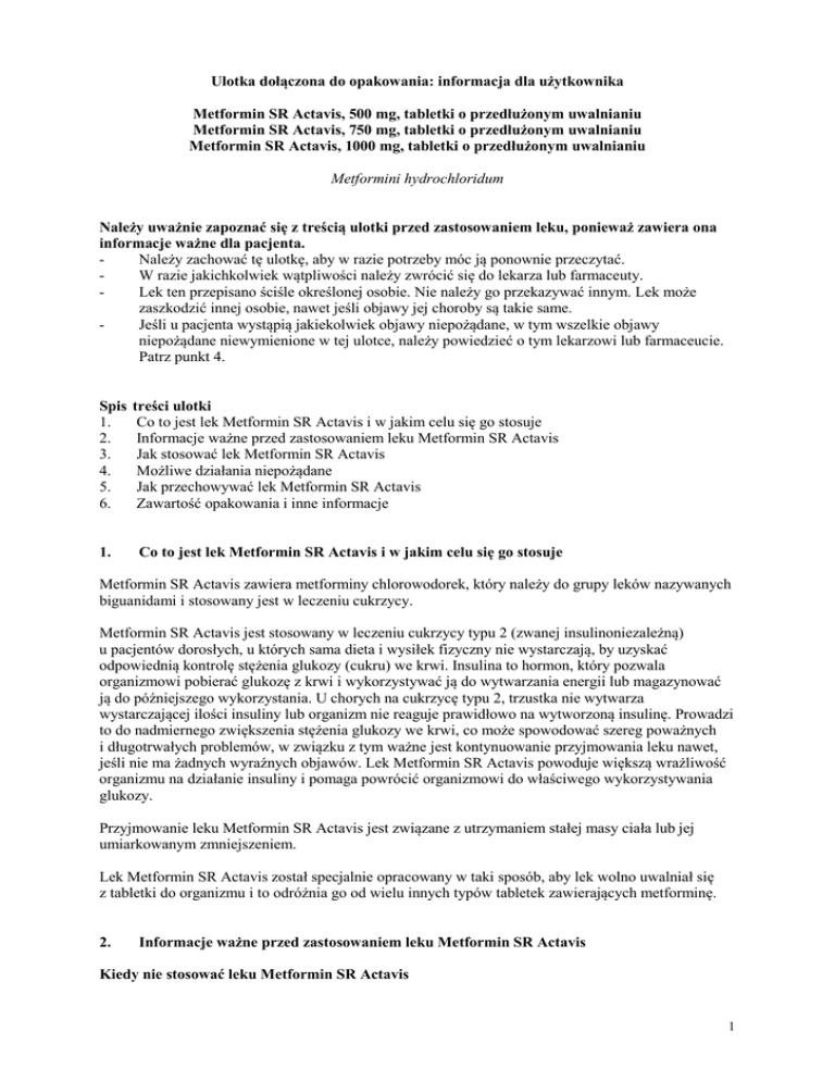 Ulotka dołączona do opakowania: informacja dla użytkownika Metformin SR Actavis, 500 mg, tabletki o przedłużonym uwalnianiu Metformin SR Actavis, 750 mg, tabletki o przedłużonym uwalnianiu Metformin SR Actavis, 1000 mg, tabletki o przedłużonym uwalnianiu Metformini hydrochloridum Należy uważnie zapoznać się z treścią ulotki przed zastosowaniem leku, ponieważ zawiera ona informacje ważne dla pacjenta. Należy zachować tę ulotkę, aby w razie potrzeby móc ją ponownie przeczytać. W razie jakichkolwiek wątpliwości należy zwrócić się do lekarza lub farmaceuty. Lek ten przepisano ściśle określonej osobie. Nie należy go przekazywać innym. Lek może zaszkodzić innej osobie, nawet jeśli objawy jej choroby są takie same. Jeśli u pacjenta wystąpią jakiekolwiek objawy niepożądane, w tym wszelkie objawy niepożądane niewymienione w tej ulotce, należy powiedzieć o tym lekarzowi lub farmaceucie. Patrz punkt 4. Spis 1. 2. 3. 4. 5. 6. 1. treści ulotki Co to jest lek Metformin SR Actavis i w jakim celu się go stosuje Informacje ważne przed zastosowaniem leku Metformin SR Actavis Jak stosować lek Metformin SR Actavis Możliwe działania niepożądane Jak przechowywać lek Metformin SR Actavis Zawartość opakowania i inne informacje Co to jest lek Metformin SR Actavis i w jakim celu się go stosuje Metformin SR Actavis zawiera metforminy chlorowodorek, który należy do grupy leków nazywanych biguanidami i stosowany jest w leczeniu cukrzycy. Metformin SR Actavis jest stosowany w leczeniu cukrzycy typu 2 (zwanej insulinoniezależną) u pacjentów dorosłych, u których sama dieta i wysiłek fizyczny nie wystarczają, by uzyskać odpowiednią kontrolę stężenia glukozy (cukru) we krwi. Insulina to hormon, który pozwala organizmowi pobierać glukozę z krwi i wykorzystywać ją do wytwarzania energii lub magazynować ją do późniejszego wykorzystania. U chorych na cukrzycę typu 2, trzustka nie wytwarza wystarczającej ilości insuliny lub organizm nie reaguje prawidłowo na wytworzoną insulinę. Prowadzi to do nadmiernego zwiększenia stężenia glukozy we krwi, co może spowodować szereg poważnych i długotrwałych problemów, w związku z tym ważne jest kontynuowanie przyjmowania leku nawet, jeśli nie ma żadnych wyraźnych objawów. Lek Metformin SR Actavis powoduje większą wrażliwość organizmu na działanie insuliny i pomaga powrócić organizmowi do właściwego wykorzystywania glukozy. Przyjmowanie leku Metformin SR Actavis jest związane z utrzymaniem stałej masy ciała lub jej umiarkowanym zmniejszeniem. Lek Metformin SR Actavis został specjalnie opracowany w taki sposób, aby lek wolno uwalniał się z tabletki do organizmu i to odróżnia go od wielu innych typów tabletek zawierających metforminę. 2. Informacje ważne przed zastosowaniem leku Metformin SR Actavis Kiedy nie stosować leku Metformin SR Actavis 1 - - jeśli pacjent ma uczulenie na metforminę lub którykolwiek z pozostałych składników tego leku (wymienionych w punkcie 6) jeśli u pacjenta występuje kwasica ketonowa (jest to objaw niekontrolowanej cukrzycy, w której substancje zwane „ciałami ketonowymi” kumulują się we krwi – pacjent może zauważyć niezwykłą, owocową woń oddechu) jeśli u pacjenta występują długotrwające zaburzenia nerek i wątroby jeśli u pacjenta występowały poważne powikłania cukrzycy lub inne poważne stany powodujące gwałtowną utratę masy ciała, nudności, wymioty lub odwodnienie jeśli u pacjenta występuje ciężkie zakażenie lub pacjent niedawno przebył ciężki uraz jeśli pacjent był leczony z powodu niewydolności serca lub niedawno przebył zawał mięśnia sercowego, lub ma ciężkie zaburzenia krążenia albo trudności w oddychaniu jeśli pacjent nadużywa alkoholu. Ostrzeżenia i środki ostrożności Po rozpoczęciu przyjmowania leku: Jeśli pacjent choruje na cukrzycę, powinien regularnie badać krew i mocz na obecność glukozy. Należy zgłaszać się na kontrolę do lekarza, co najmniej jeden raz w roku, aby ocenić czynność nerek (częściej na kontrolę powinni zgłaszać się pacjenci w podeszłym wieku lub pacjenci z zaburzeniami czynności nerek). Jeśli u pacjenta wystąpi nieoczekiwany spadek masy ciała lub silne nudności albo wymioty, niekontrolowany przyspieszony oddech, bóle brzucha, uczucie zimna lub skurcze mięśni, należy przerwać przyjmowanie leku i niezwłocznie zgłosić się do lekarza. Mogą to być objawy rzadkiego ale bardzo poważnego powikłania cukrzycy, zwanego „kwasicą mleczanową”, co oznacza, że we krwi znajduje się za dużo kwasu (patrz także punkt 4 „Możliwe działania niepożądane”). Pacjent może w stolcu zauważyć resztki tabletek. Nie należy się tym martwić, ponieważ w przypadku tego typu tabletek jest to normalne. Jeśli konieczne jest wykonanie badania radiologicznego wymagającego wstrzyknięcia do krwi środka kontrastującego, należy poinformować lekarza o przyjmowaniu leku Metformin SR Actavis, ponieważ pacjent może wymagać przerwania leczenia na kilka dni po po badaniu. Należy poinformować lekarza, jeśli pacjent zamierza poddać się zabiegowi w znieczuleniu ogólnym, ponieważ może to wymagać przerwania przyjmowania leku Metformin SR Actavis na kilka dni przed i kilka dni po po zabiegu. Należy kontynuować wszelkie zalecenia lekarza dotyczące diety i upewnić się, że pacjent spożywa węglowodany regularnie w ciągu dnia. Nie należy przerywać stosowania tego leku bez porozumienia z lekarzem. Dzieci i młodzież Nie należy stosować tego leku u dzieci i młodzieży. Nie wiadomo, czy lek ten jest bezpieczny i skuteczny, jeśli jest stosowany u dzieci i młodzieży w wieku poniżej 18 lat. Lek Metformin SR Actavis a inne leki Należy powiedzieć lekarzowi lub farmaceucie o wszystkich lekach przyjmowanych przez pacjenta obecnie lub ostatnio, a także o lekach, które pacjent planuje przyjmować. Jeśli pacjent jed