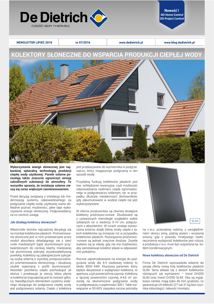 Nowość ! DD Home Control DD Project Control NEWSLETTER LIPIEC 2016 nr 07/2016 www.dedietrich.pl www.blog.dedietrich.pl KOLEKTORY SŁONECZNE DO WSPARCIA PRODUKCJI CIEPŁEJ WODY Wykorzystanie energii słonecznej jest najbardziej opłacalną technologią produkcji ciepłej wody użytkowej. Panele solarne pozwalają także znacznie ograniczyć emisję szkodliwych substancji do atmosfery. To wszystko sprawia, że instalacje solarne cieszą się coraz większym zainteresowaniem. Przed decyzją związaną z instalacją lub modernizacją systemu odpowiedzialnego za podgrzanie ciepłej wody użytkowej warto dokładnie poznać możliwości, jakie daje wykorzystanie energii słonecznej. Podpowiadamy, na co zwrócić uwagę. Jak działają kolektory słoneczne? Właściciele domów najczęściej decydują się na montaż kolektorów płaskich. Promieniowanie słoneczne jest w nich przetwarzane przez moduł absorbera składającego się z sieci rurek miedzianych bądź aluminiowych przytwierdzonych do cienkiej blachy miedzianej lub aluminiowej pokrytej wysokoselektywną powłoką. Kolektory są zabezpieczone specjalną szybą solarną o wysokiej przepuszczalności promieniowania słonecznego i obudową, zwykle wykonaną z profili aluminiowych. Absorber pochłania ciepło pochodzące ze słońca i przekazuje je cieczy, która płynie w kolektorze (najczęściej jest to roztwór glikolu). Nieodłącznym elementem systemu solarnego służącego do podgrzania ciepłej wody jest podgrzewacz solarny. Ciepło z kolektora jest przekazywane do wymiennika w podgrzewaczu, który magazynuje podgrzaną w ten sposób wodę. Przydatną funkcją kolektorów płaskich jest tzw. schładzanie rewersyjne, czyli możliwość odprowadzania nadmiaru ciepła zgromadzonego w podgrzewaczu solarnym, np. w przypadku dłuższej nieobecności domowników, gdy zakumulowane w wodzie ciepło nie jest wykorzystywane. W ofercie producentów są również dostępne kolektory próżniowo-rurowe. Zbudowane są z ustawionych równolegle względem siebie szklanych rur o średnicy 5-10 cm, połączonych z absorberem. W rurach zostaje wytworzona próżnia, dzięki której straty ciepła z takich kolektorów są mniejsze niż w przypadku kolektorów płaskich. Rozwiązania próżniowo-rurowe są jednak znacznie droższe. Zwykle wybiera się je wtedy, gdy nie ma możliwości, aby zainstalować kolektor płaski w odpowiednim położeniu. Roczne zapotrzebowanie na energię do podgrzania wody dla 4-5 osobowej rodziny to około 3000 kWh. Kluczowy parametr, który będzie decydował o wydajności kolektora, to apertura, czyli powierzchnia czynna. Kolektory o łącznej powierzchni czynnej 4-4,5 m2 pozwolą na ekonomiczne podgrzanie wody w podgrzewaczu o pojemności 300 l. Takie rozwiązanie w 50-60% zaspokoi roczne potrzeby SLIM na c.w.u. przeciętnej rodziny, z uwzględnieniem okresu zimy, późnej jesieni i wczesnej wiosny, gdy z powodu mniejszego nasłonecznienia wydajność kolektorów jest niższa, a produkcja c.w.u. musi być wspierana np. kotłem kondensacyjnym. Nowe kolektory słoneczne od De Dietrich Firma De Dietrich wprowadziła właśnie do swojej oferty nową linię kolektorów płaskich SLIM. Seria składa się z dwóch kolektorów różniących się wymiarami – Inisol DH200 SLIM oraz Inisol CH250 SLIM. Oba są wyjątkowo cienkie, mają tylko 46 mm grubości, co gwarantuje ich lekkość (27 lub 31 kg bez czynnika roboczego) i łatwość montażu. Powierzchnia czynna kolektora Inisol DH200 SLIM to 1,92 m2, a kolektora Inisol CH250 SLIM 2,4 m2. Zespół dwóch kolektorów w pełni zaspokoi potrzeby przeciętnej rodziny na ciepłą wodę. – Kolektory SLIM to obecnie jedna z ciekawszych propozycji rynkowych z uwagi na zminimalizowaną grubość i ciężar. Sprawność kolektorów z serii SLIM jest co prawda poniżej 80%, ale biorąc pod uwagę jego przeznaczenie, jakim jest produkcja c.w.u, jest do przyjęcia w kontekście wielu innych zalet, w tym ceny – mówi Waldemar Matuszyński, Product Manager z firmy De Dietrich Technika Grzewcza. Kolektor jest dostarczany z aluminiowym absorberem powierzchniowym z powłoką selektywną, z wymiennikiem miedzianym typu „harfa”. Ma przezroczystą szybę z bezpiecznego szkła o grubości 3,2 mm i przezroczystości powyżej 91%. Obudowa kolektora jest wykonana z profilu aluminiowego, z rowkiem mocującym na obwodzie i aluminiową tylną pokrywą zamykającą. Kolektory będą dostępne w sprzedaży w pakietach solarnych z podgrzewaczami lub bez nich, a także z regulatorami komunikującymi się z automatyką kotłową DIEMATIC, dzięki czemu będzie można zoptymalizować proces wytwarzania c.w.u. i ograniczyć wytwarzanie ciepłej wody przez kocioł. DD ASSISTANCE – PROGRAM PRZEDŁUŻONEJ GWARANCJI 5 CJ I E A De Dietrich Thermique, firma o ponad 330 latach tradycji i właściciel najstarszego znaku LA N TG A przemysłowego (róg R A W myśliwski) należy do Grupy BDR Thermea zatrudniającej na całym świecie ponad 6 000 osób w 70 krajach. Jakość, trwałość i innowacja to kluczowe wartości Grupy BDR Thermea, która od wielu lat jest liderem w technice kondensacyjnej, dostarczając klientom i użytkownikom nowoczesne urządzenia grzewcze. ISTANC SS W celu zwiększenia komfortu życia i niezależności użytkowników urządzeń grzewczych De Dietrich Technika Grzewcza Sp. z o. o. wprowadza na polski rynek program przedłużonej gwarancji pod nazwą DE DIETRICH ASSISTANCE. De Dietrich Assistance (DD Assistance) to program dodatkowej, przedłużonej gwarancji na wybrane urządzenia grzewcze marki De Dietrich i BAXI. Oferowany jest w Polsce dla tych użytkowników, którym nie wystarcza podstawowy okres gwarancji (np. 2 lata) bezawaryjnego działania urządzeń, przewidziany przez Producenta. Założenia i wymogi programu DD Assistance zawarte są w pisemnej Umowie którą użytkownik zawiera z De Dietrich Technika Grzewcza Sp. z o. o. Umowa gwarantuje dalszą opiekę nad właściwym fun