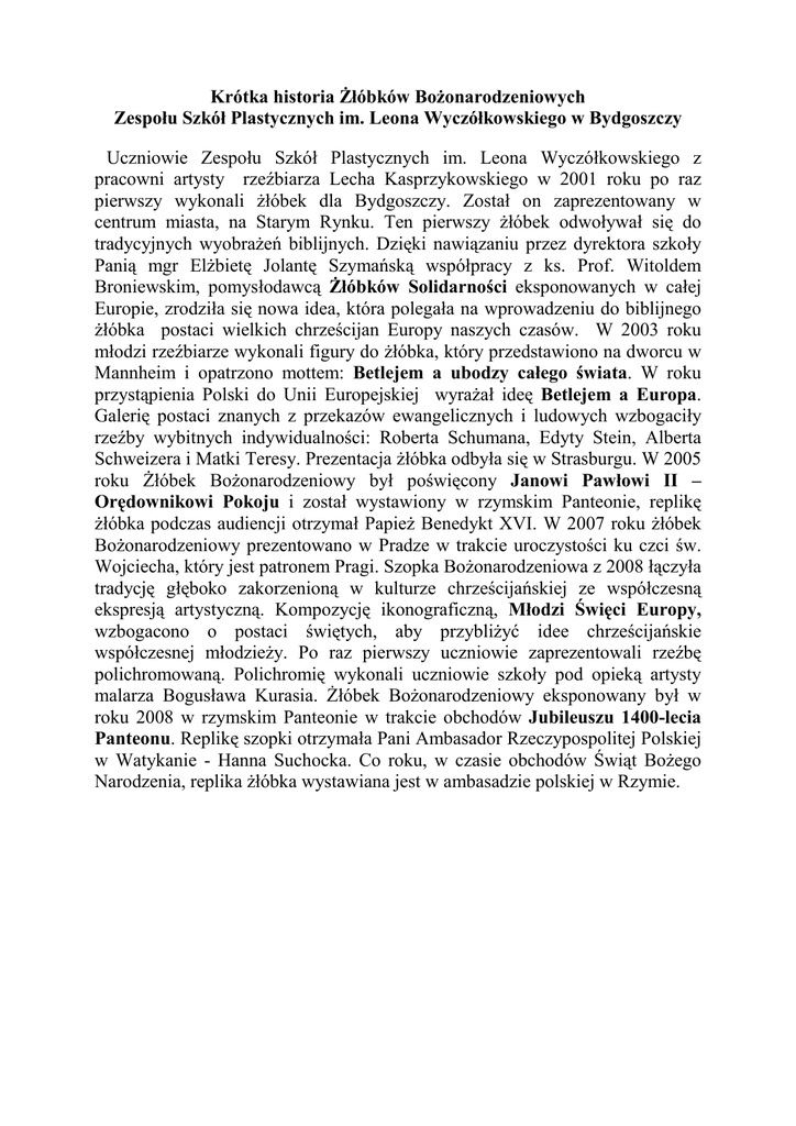 Krótka historia śłóbków BoŜonarodzeniowych Zespołu Szkół Plastycznych im. Leona Wyczółkowskiego w Bydgoszczy Uczniowie Zespołu Szkół Plastycznych im. Leona Wyczółkowskiego z pracowni artysty rzeźbiarza Lecha Kasprzykowskiego w 2001 roku po raz pierwszy wykonali Ŝłóbek dla Bydgoszczy. Został on zaprezentowany w centrum miasta, na Starym Rynku. Ten pierwszy Ŝłóbek odwoływał się do tradycyjnych wyobraŜeń biblijnych. Dzięki nawiązaniu przez dyrektora szkoły Panią mgr ElŜbietę Jolantę Szymańską współpracy z ks. Prof. Witoldem Broniewskim, pomysłodawcą śłóbków Solidarności eksponowanych w całej Europie, zrodziła się nowa idea, która polegała na wprowadzeniu do biblijnego Ŝłóbka postaci wielkich chrześcijan Europy naszych czasów. W 2003 roku młodzi rzeźbiarze wykonali figury do Ŝłóbka, który przedstawiono na dworcu w Mannheim i opatrzono mottem: Betlejem a ubodzy całego świata. W roku przystąpienia Polski do Unii Europejskiej wyraŜał ideę Betlejem a Europa. Galerię postaci znanych z przekazów ewangelicznych i ludowych wzbogaciły rzeźby wybitnych indywidualności: Roberta Schumana, Edyty Stein, Alberta Schweizera i Matki Teresy. Prezentacja Ŝłóbka odbyła się w Strasburgu. W 2005 roku śłóbek BoŜonarodzeniowy był poświęcony Janowi Pawłowi II – Orędownikowi Pokoju i został wystawiony w rzymskim Panteonie, replikę Ŝłóbka podczas audiencji otrzymał PapieŜ Benedykt XVI. W 2007 roku Ŝłóbek BoŜonarodzeniowy prezentowano w Pradze w trakcie uroczystości ku czci św. Wojciecha, który jest patronem Pragi. Szopka BoŜonarodzeniowa z 2008 łączyła tradycję głęboko zakorzenioną w kulturze chrześcijańskiej ze współczesną ekspresją artystyczną. Kompozycję ikonograficzną, Młodzi Święci Europy, wzbogacono o postaci świętych, aby przybliŜyć idee chrześcijańskie współczesnej młodzieŜy. Po raz pierwszy uczniowie zaprezentowali rzeźbę polichromowaną. Polichromię wykonali uczniowie szkoły pod opieką artysty malarza Bogusława Kurasia. śłóbek BoŜonarodzeniowy eksponowany był w roku 2008 w rzymskim Panteonie w trakcie obchodów Jubileuszu 1400-lecia Panteonu. Replikę szopki otrzymała Pani Ambasador Rzeczypospolitej Polskiej w Watykanie - Hanna Suchocka. Co roku, w czasie obchodów Świąt BoŜego Narodzenia, replika Ŝłóbka wystawiana jest w ambasadzie polskiej w Rzymie. śłóbek BoŜonarodzeniowy 2010 Wielcy Twórcy Europy Idea Ŝłóbka, w którym znaleźli się twórcy kultury z róŜnych epok w dziejach cywilizacji śródziemnomorskiej wyraŜa z jednej strony ideę o wszechobecności wartości chrześcijańskich w wyobraźni Europejczyków, z drugiej zaś jest świadectwem głęboko zakorzenionego przekonania o związkach sztuki ze świętością, sacrum. Przedstawia fundamentalne zdarzenie, jakim były w religii chrześcijańskiej narodziny Boga-człowieka. Pokłon w Ŝłóbku składają Jezusowi: Imhotep, jeden z twórców kultury staroŜytnego Egiptu, Michał Anioł – malarz i rzeźbiarz renesansu, wielcy malarze: Vincent van Gogh, Gustav Klimt, Salvador Dali, Pablo Picasso, a takŜe polski rzeźbiarz Xawery Dunikowski. Nie ma tradycyjnych figur Trzech Króli ofiarowujących dary: mirrę, kadzidło i złoto. W odmienny sposób przedstawiono postaci Świętej Rodziny: Matka Boska tuli w ramionach Dzieciątko, te dwie postaci, przedstawiane oddzielnie, tu są połączone ze sobą, stanowią jedność. Treść zawarta w takim właśnie wizerunku wyraŜa archetypiczny i nierozerwalny związek Matki z Dzieckiem, w sugestywny sposób przedstawia człowieczeństwo Nowonarodzonego. Obok znajduje się postać Św. Józefa, straŜnika i opiekuna Marii i Jezusa. Za nimi, w tle, umieszczono postaci trzech Aniołów, Posłańców Boga Ojca, wędrujących MęŜów, w duchowych i realnych przestrzeniach. Te postaci odnieść moŜna do Tajemnicy BoŜoczłowieczeństwa, Tajemnicy Losu, Opieki, Miłości, Nadziei i Śmierci, a przede wszystkim Prawdy. Ci Trzej Aniołowie to takŜe postaci symbolizujące Tajemnicę i Prawdę Sztuki. Figury ozdobiono polichromią. Cześć Nowonarodzonemu składają postaci dotąd nieobecne w Ŝadnej BoŜonarodzeniowej Szopce, a pomysł jest wyłącznie artystyczną wizją rzeźbiarską uczniów Zespołu Szkół Plastycznych im. Leona Wyczółkowskiego w Bydgoszczy. Postaci śłóbka BoŜonarodzeniowego 2010 Święta Rodzina Trzej Aniołowie : Gabriel; w tradycji chrześcijańskiej jeden z dwóch najwaŜniejszych rangą aniołów, pojawia się w Ewangelii św. Łukasza we fragmencie dotyczącym Zwiastowania. Los; anioł Boskiej Opatrzności, symbol poezji, twórcy świata, artysta, powołał do istnienia miasto sztuk. Metatron; najwyŜszy w hierarchii niebiańskiej, król aniołów, ksiąŜę boŜego oblicza, pośrednik między światem ludzkim a boskim. Imhotep pierwszy architekt i lekarz znany ze źródeł historycznych, twórca piramidy schodkowej w Sakkarze w Egipcie datowanej na ok. 2630-2611 p.n.e. za panowania III dynastii, naleŜał do rodziny królewskiej; kanclerz faraona i najwyŜszy kapłan boga Ra w Heliopolis; był uwaŜany za syna boga Ptaha; tradycja utrwalana przez wieki historii i niezwykły intelekt, jaki mu przypisywano, przyczyniły się do jego ubóstwienia; w Egipcie zwracano się do niego w modlitwach. Michał Anioł Buonarroti (1475 – 1564); włoski malarz, rzeźbiarz, poeta i architekt Renesansu; autor między innymi fresków w Kaplicy Sykstyńskiej; spośród rzeźb najbardziej znane są Pietà , Dawid i MojŜesz, z dzieł architektonicznych – projekt kopuły bazyliki świętego Piotra. Vincent van Gogh (1853 – 1890); holenderski malarz związany z postimpresjonizmem; Mając lat trzydzieści siedem namalował ostatni obraz w Ŝyciu; po dziesięciu latach pracy artystycznej pozostało po nim prawie 900 płócien, kilkaset rysunków, szkiców i litografii; autor m.in. Jedzących kartofle, Słoneczników, Autoportretu. Gustav 
