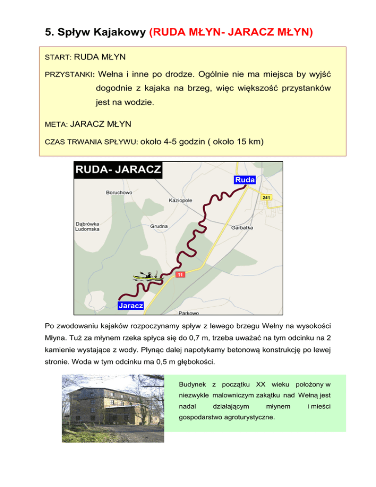 5. Spływ Kajakowy (RUDA MŁYN- JARACZ MŁYN) START: RUDA MŁYN PRZYSTANKI: Wełna i inne po drodze. Ogólnie nie ma miejsca by wyjść dogodnie z kajaka na brzeg, więc większość przystanków jest na wodzie. META: JARACZ MŁYN CZAS TRWANIA SPŁYWU: około 4-5 godzin ( około 15 km) Po zwodowaniu kajaków rozpoczynamy spływ z lewego brzegu Wełny na wysokości Młyna. Tuż za młynem rzeka spłyca się do 0,7 m, trzeba uważać na tym odcinku na 2 kamienie wystające z wody. Płynąc dalej napotykamy betonową konstrukcję po lewej stronie. Woda w tym odcinku ma 0,5 m głębokości. Budynek z początku XX wieku położony w niezwykle malowniczym zakątku nad Wełną jest nadal działającym młynem gospodarstwo agroturystyczne. i mieści Początek spływu. Na trasie mijamy ostrożnie zniszczony jaz w Gródnie. Kolejnym charakterystycznym punktem który spotykamy na rzece jest Most kolejowy w Żołędzinie oddalony od Rudy o jakieś 4,4 km. Z tego punktu zostało nam 5,4 km, aby dotrzeć do wsi Wełna. Jeden z najcenniejszych zabytków budownictwa drewnianego w Wielkopolsce- kościół filialny p.w. Podwyższenia Krzyża Świętego. Kawałek dalej tablica informuje spływowiczów że, przepływają przez Rezerwat "Wełna". Piękne widoki na trasie. Ostatni odcinek trasy ma 4,2 km, po jego pokonaniu docieramy do Jaracza, gdzie czeka nas dużo miejscowych atrakcji. Przed nami widać młyn z czerwonej cegły i znaki dla kajakarzy. Płyniemy na prawo i wyciągamy kajaki na terenie Muzeum Młynarstwa i Wodnych Urządzeń Przemysłu Wiejskiego w Jaraczu. Na cele ekspozycyjne przeznaczono młyn, zrekonstruowaną stajnię przymłyńską i XIX wieczny Dom Młynarza. W Muzeum działa również elektrownia wodna na rzece Wełnie. Ekspozycja plenerowa muzeum. Godziny otwarcia muzeum: wtorek- sobota 9.00- 15.00 niedziele: 10.00- 16.00 Muzeum proponuje: - zwiedzanie muzeum, - przejście znakowanymi szlakami turystycznymi, - organizację ogniska- osoba (kiełbasa, karkówka, smalec, chleb, sól, herbata) - grzybobranie z piknikiem lub ogniskiem, - wynajem pokoi hotelowych- koszt ok. 90 zł. osoba, - usługi gastronomiczne – wg uznaniowości - organizacje plenerów artystycznych, - przystań dla uczestników spływów kajakowych. ponadto zasłyszane ale do ustalenia: - własnoręczne mielenie mąki w muzeum, - zwiedzanie rybakówki z możliwością własnoręcznego łowienia ryb, - pieczenie prosiaka lub strusia, - zwiedzanie fermy strusi. - wyprawa piesza do rezerwatu Wełna. - przejażdżka konna po okolicy
