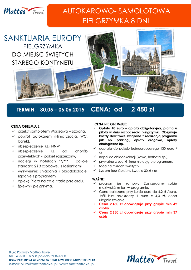 AUTOKAROWO- SAMOLOTOWA PIELGRZYMKA 8 DNI SANKTUARIA EUROPY PIELGRZYMKA DO MIEJSC ŚWIĘTYCH STAREGO KONTYNETU TERMIN: 30.05 – 06.06.2015 CENA OBEJMUJE: przelot samolotem Warszawa – Lizbona, powrót autokarem (klimatyzacja, WC, barek), ubezpieczenie KL i NNW, ubezpieczenie KL od chorób przewlekłych - pakiet rozszerzony, noclegi w hotelach **/*** , pokoje standard 2 i 3 osobowe, z łazienkami, wyżywienie: śniadania i obiadokolacje, zgodnie z programem, opiekę Pilota na całej trasie przejazdu, śpiewnik pielgrzyma, CENA: od 2 450 zł CENA NIE OBEJMUJE: Opłata 40 euro – opłata obligatoryjna, płatna u pilota w dniu rozpoczęcia pielgrzymki. Obejmuje koszty dewizowe związane z realizacją programu jak np. parkingi, opłaty drogowe, opłaty ekologiczne itp. dopłata do pokoju jednoosobowego 130 euro / os. napoi do obiadokolacji (kawa, herbata itp.), prywatne wydatki i inne nie objęte programem, taca na mszach świętych. System Tour Guide w kwocie 30 zł / os. WAŻNE: program jest ramowy. Zastrzegamy sobie możliwość zmian w programie. Cena obliczona przy kursie euro do 4,2 zł /euro. Jeśli kurs przekroczy 1 euro = 4,3 zł, cena ulegnie zmianie Cena 2 450 zł obowiązuje przy grupie min 42 osoby Cena 2 650 zł obowiązuje przy grupie min 37 osób Biuro Podróży Matteo Travel tel. +48 504 189 508, pn.-sob. 9:00–17:00 Bank PKO BP SA nr konta 87 1020 4391 0000 6402 0108 7113 e-mail: [email protected], www.matteotravel.pl więcej na 1. DZIEŃ (sb) 30.05.2015 www.matteotravel.pl PODRÓŻ Zbiórka uczestników w godzinach wczesnoporannych. Wyjazd autokarem i przejazd nocny w kierunku Francji. 2. DZIEŃ (ndz) 31.05.2015 LA SALETTE Przyjazd w godzinach południowych do La Salette, gdzie znajduje się sanktuarium związane z objawieniami Matki Boskiej z 1846 r. Zwiedzanie sanktuarium, czas na osobistą modlitwę. Przejazd do hotelu w okolicach Grenoble. Zakwaterowanie w hotelu, obiadokolacja. Nocleg. 3. DZIEŃ (pn) 01.06.20015 AVINION - LOURDES Śniadanie. Następnie wyjazd i przejazd do Avinion - miasta papieży, zwanego drugim Rzymem. Spacer po mieście – pałac papieski, Katedra Notre Dame, Ogrody papieskie, Most St. Benezet z XIV wieczny, zwany mostem złamanym Przejazd do Lourdes, jednego z największych na świecie ośrodków kultu Maryjnego i miejsca objawień Matki Boskiej. Zakwaterowanie w hotelu, obiadokolacja. Następnie ok. godziny 21.00 udział w procesji Maryjnej. Nocleg. 4. DZIEŃ (wt) 02.06.2015 LOURDES Śniadanie, następnie zwiedzanie Sanktuarium, krypty, kaplica Adoracji, Grota Objawień, muzeum uzdrowień i miasta - Moulin Boly, gdzie znajduje się dom rodzinny św. Bernadetty, Le Cachot - kościół parafialny, hospicjum, muzeum objawień, cmentarz. Czas wolny, następnie Procesja Eucharystyczna z błogosławieństwem chorych. Powrót do hotelu na obiadokolacje. Ok. 21.00 wieczorny udział w Nabożeństwach. Nocleg. 5. DZIEŃ (śr) 03.06.2015 OVIEDO, SANTIAGO DE COMPOSTELA Śniadanie. Przejazd do Oviedo. Zwiedzanie Oviedo – Katedra San Salvador gdzie według tradycji przechowywana jest chusta z Oviedo czyli sudarium, w które zawinięto w grobie głowę Jezusa Chrystusa. Nastepnie przejazd do Santiago de Compostela zakwaterowanie w hotelu. Obiadokolacja i nocleg. 6. DZIEŃ (czw) 04.06.2015 SANTIAGO DE COMPOSTELA, FATIMA Śniadanie. Zwiedzanie sanktuarium - miejsca spoczynku św. Jakuba Apostoła. Czas na osobistą modlitwę. Przyjazd do Fatimy, – gdzie znajduje się Sanktuarium kultu Maryjnego, jednego z najczęściej uczęszczanych miejsc przez pielgrzymów z całego świata. Zakwaterowanie w hotelu w Fatimie. Obiadokolacja. O godz. 21.30 udział w procesji. Powrót do hotelu, nocleg. 7. DZIEŃ (pt) 05.06.2015 FATIMA, NAZARE Śniadanie. Aljustrel – wioska narodzin św. Franciszka i Łucji, gdzie znajdują się ich rodzinne domy, czas na prywatną modlitwę. Przejazd do Nazare - Kościół Nossa Senhora da Nazaré, plażowanie. Obiadokolacja. Przejazd na lotnisko w Lizbonie, odprawa bagażu oraz odprawa celna. Wylot do Polski o godz. 01.15 8. DZIEŃ (sb) 06.06.2015 POWRÓT Przylot do Warszawy o godz. 06.10. Zakończenie pielgrzymki. Biuro Podróży Matteo Travel tel. +48 504 189 508, pn.-sob. 9:00–17:00 Bank PKO BP SA nr konta 87 1020 4391 0000 6402 0108 7113 e-mail: [email protected], www.matteotravel.pl