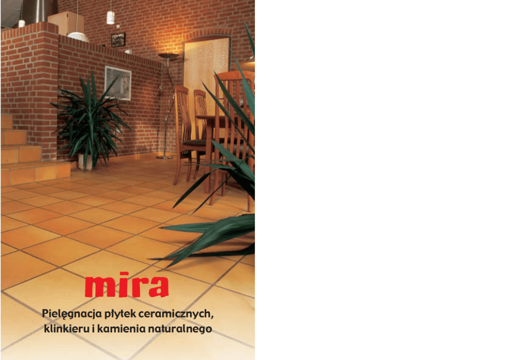 Piel´gnacja p∏ytek ceramicznych, klinkieru i kamienia naturalnego Glazura i terakota darem natury x Glazura i terakota z materia∏u ceramicznego lub kamienia naturalnego wytwarzane sà od tysi´cy lat. Materia∏ ten jest wyjàtkowy nie tylko ze wzgl´du na trwa∏oÊç lecz równie˝ dlatego, ˝e z biegiem lat proces starzenia si´ i Êcierania nadaje mu patyny i charakteru. Pod∏oga i Êciany stajà si´ pi´kniejsze nabierajàc szlachetnego wyglàdu. Lecz aby tak si´ sta∏o niezb´dne jest stosowanie dobrych Êrodków oraz w∏aÊciwych sposobów piel´gnacji. Bogata oferta na rynku p∏ytek ceramicznych i klinkierowych mo˝e stwarzaç trudnoÊci w dokonaniu wyboru p∏ytki, a tak˝e w okreÊleniu jaki typ mira piel´gnacja p∏ytek - produkty profesjonalne x p∏ytek czy klinkieru zosta∏ u∏o˝ony w naszej ∏azience, holu, kuchni czy pralni. Wybór Êrodków do piel´gnacji zale˝y od rodzaju p∏ytki. P∏ytki szkliwione, polerowany kamieƒ naturalny oraz twarde nienasiàkliwe p∏ytki nale˝y czyÊciç i piel´gnowaç Êrodkami dostosowanymi do tego rodzaju materia∏u. Nieszkliwione oraz nasiàkliwe p∏ytki ceramiczne i klinkierowe wymagajà Êrodków nasàczajàcych i wype∏niajàcych pory. Niniejsza broszura zawiera porady i wskazówki dotyczàce gruntownego czyszczenia, konserwacji i codziennej piel´gnacji ró˝nych typów p∏ytek ceramicznych, klinkierowych oraz kamienia naturalnego. mira 7110 base cleaner Skuteczny Êrodek czyszczàcy do usuwania brudu, oleju, resztek myd∏a, t∏uszczu, wosku itp. ze wszystkich typów pod∏o˝y. Stosuje si´ do czyszczenia wszystkich powierzchni przed dalszym ich wykaƒczaniem lub ponownym zakonserwowaniem olejem. 7110 base cleaner jest na bazie wodnej w zwiàzku z czym jest przyjemny w u˝yciu. Zaleca si´ jednak, ze wzgl´du na dzia∏anie odt∏uszczajàce, u˝ywanie r´kawic przy pracy. mira 7120 ceramic cleaner Ârodek czyszczàcy do usuwania pozosta∏oÊci po spoinowaniu, szlamu cementowego i wapiennego, osadu kamiennego, rdzy z p∏ytek ceramicznych, klinkierowych, powierzchni murowanych, armatury chromowanej, ceramiki sanitarnej itd. Ârodek ten nie wolno stosowaç do kamienia naturalnego zawierajàcego wapieƒ np. marmuru. 7120 ceramic cleaner nie wydziela dra˝niàcych oparów dlatego te˝ mo˝na go stosowaç w pomieszczeniach zamkni´tych bez ryzyka uszkodzenia wyposa˝enia jak np. surowego drewna, klamek, zawiasów, armatury itd. 7120 ceramic cleaner jest na bazie wodnej dlatego te˝ jest przyjemny w u˝yciu. Zaleca si´ jednak, ze wzgl´du na zawartoÊç kwasu, u˝ywanie r´kawic przy pracy. mira 7130 ceramic oil Gotowy do u˝ycia, bezzapachowy olej do konserwacji nieglazurowanego klinkieru, kamienia naturalnego itp. 7130 ceramic oil nasyca p∏ytki podkreÊlajàc ich naturalny kolor oraz zabezpiecza powierzchni´ przed wnikaniem brudu. mira 7210 ceramic wash Specjalny Êrodek do mycia nieglazurowanych p∏ytek pod∏ogowych, klinkieru, marmuru i kamionki. 7210 ceramic wash zawiera m.in. aktywne substancje myjàce, piel´gnujàcy olej kokosowy, które wià˝à brud w roztworze wody i Êrodka 7210 ceramic wash. Ârodek tworzy na powierzchni ochronnà b∏on´ podkreÊlajàc jednoczeÊnie naturalny kolor materia∏u. mira 7220 sanitary wash Neutralny Êrodek do mycia wszystkich p∏ytek nienasiàkliwych I szkliwionych, granitowych, polerowanego klinkieru, granitu oraz ceramiki sanitarnej. 7220 sanitary wash usuwa brud, kamieƒ i in. oraz przeciwdzia∏a szarzeniu si´ p∏ytek i spoin. 3 Olej, t∏uszcz, brud na p∏ytkach ceramicznych, klinkierowych i kamieniu naturalnym mira 7110 base cleaner mira 7120 ceramic cleaner 7110 base cleaner wymieszaç z wodà w proporcji /2 litra Êrodka na 10 litrów ciep∏ej wody. Roztwór rozprowadziç jednoczeÊnie wcierajàc go w powierzchni´ za pomocà ostrej gàbki lub poduszki padmaster, a nast´pnie pozostawiç na kilka minut aby zaczà∏ dzia∏aç. 7120 ceramic cleaner miesza si´ z wodà w proporcji 1 cz´Êç ceramic cleaner na 2 cz´Êci wody. Na powierzchniach mocno zabrudzonych Êrodek mo˝na stosowaç w postaci nierozcieƒczonej. Pod∏o˝e nale˝y zwil˝yç wodà, nast´pnie rozprowadziç Êrodek po powierzchni dobrze wcierajàc go szczotkà lub poduszkà padmaster. Zetrzeç Êrodek z powierzchni, a nast´pnie zmyç dok∏adnie ca∏à powierzchni´ czystà wodà. Pozostawiç Êrodek na kilka minut aby zaczà∏ dzia∏aç, nast´pnie zetrzeç gàbkà lub szmatkà i sp∏ukaç czystà wodà. Staraj si´ dok∏adnie usunàç lu˝ny brud. JeÊli masz mo˝liwoÊç u˝yj odkurzacza na wod´ do usuwania rozpuszczonego brudu i wody z mytej powierzchni. W przypadku armatury i umywalek zanieczyszczonych osadem kamiennym zwil˝yç szmatk´ lub gàbk´ Êrodkiem 7120 ceramic cleaner po czym dobrze wetrzeç w zabrudzonà powierzchni´ i pozostawiç na kilka minut. Nast´pnie zetrzeç Êrodek i sp∏ukaç ca∏à powierzchni´ czystà wodà. 1 4 Nalot fugowy, resztki cementu, kamieƒ na p∏ytkach ceramicznych, klinkierze i kamieniu naturalnym 5 Konserwacja p∏ytek nieszkliwionych, klinkieru i kamienia naturalnego mira 7130 ceramic oil Mycie i piel´gnacja p∏ytek nieszkliwionych, klinkieru i kamienia naturalnego mira 7210 ceramic wash Codzienne usuwanie wolnych zaneczyszczeƒ z powierzchni nie wymaga mycia. Wystarczy powierzchni´ odkurzyç lub tak jak pokazano na zdj´ciu zamieÊç specjalnym mopem. Brud zwiàzany na powierzchni najlepiej zmyç Êrodkiem 7210 ceramic wash wymieszanym z ciep∏à wodà w proporcji 0,10 litra ceramic wash na 10 litrów wody. U˝ywaj dwóch wiader – jeden z roztworem wody i Êrodka a drugi z czystà wodà. 7130 ceramic oil rozprowadziç p´dzlem lub szmatkà z wiskozy, która nie pozostawia w∏osków na powierzchni. Olej nale˝y nanosiç do momentu ca∏kowitego nasycenia powierzchni p∏ytek. 6 Powierzchni´ pozostawiç do schni´cia na min. 6 godzin. Nast´pnie zmyç Êrodkiem mira 7210 ceramic wash aby usunàç ewentualny nadmiar ole