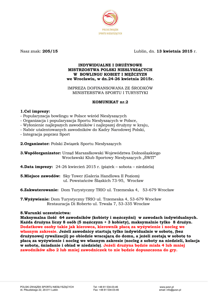 Nasz znak: 205/15 Lublin, dn. 13 kwietnia 2015 r. INDYWIDUALNE I DRUŻYNOWE MISTRZOSTWA POLSKI NIESŁYSZĄCYCH W BOWLINGU KOBIET I MĘŻCZYZN we Wrocławiu, w dn.24-26 kwietnia 2015r. IMPREZA DOFINANSOWANA ZE ŚRODKÓW MINISTERSTWA SPORTU I TURYSTYKI KOMUNIKAT nr.2 1.Cel imprezy: - Popularyzacja bowlingu w Polsce wśród Niesłyszących - Organizacja i popularyzacja Sportu Niesłyszących w Polsce, - Wyłonienie najlepszych zawodników i najlepszej drużyny w kraju, - Nabór utalentowanych zawodników do Kadry Narodowej Polski, - Integracja poprzez Sport 2.Organizator: Polski Związek Sportu Niesłyszących 3.Współorganizator: Urząd Marszałkowski Województwa Dolnośląskiego Wrocławski Klub Sportowy Niesłyszących „ŚWIT” 4.Data imprezy: 24-26 kwiecień 2015 r. (piątek – sobota – niedziela) 5.Miejsce zawodów: Sky Tower (Galeria Handlowa II Poziom) ul. Powstańców Śląskich 73-95, Wrocław 6.Zakwaterowanie: Dom Turystyczny TRIO ul. Trzemeska 4, 53-679 Wrocław 7.Wyżywienie: Dom Turystyczny TRIO ul. Trzemeska 4, 53-679 Wrocław Restauracja Di Roberto ul. Trwała 7, 53-335 Wrocław 8.Warunki uczestnictwa: Maksymalna ilość 64 zawodników (kobiety i mężczyźni) w zawodach indywidualnych. Każda drużyna liczy 8 osób (5 mężczyzn + 3 kobiety), maksymalnie tylko 8 drużyn. Dodatkowe osoby takie jak kierowca, kierownik płacą za wyżywienie i nocleg we własnym zakresie. Jeżeli zawodnicy startują tylko indywidualnie w sobotę, (bez drużynowej rywalizacji) po obiedzie wracającą do domu, a jeżeli zostają w sobotę to płacą za wyżywienie i nocleg we własnym zakresie (nocleg z soboty na niedzieli, kolacja w sobotę, śniadanie i obiad w niedzielę). Jeżeli drużyna będzie miała 4 lub mniej zawodników albo 2 lub mniej zawodniczek to nie będzie dopuszczona do gry. POLSKI ZWIĄZEK SPORTU NIESŁYSZĄCYCH Al. Piłsudskiego 22, 20-011 Lublin Tel: +48 81 534-03-46 Fax: +48 81 534-03-46 www.pzsn.pl email: [email protected] 9.System rozgrywek: Zawody w dniach 25.04.2015r.: Indywidualne Mistrzostwa Polski Niesłyszących Kobiet i Mężczyzn Mężczyźni 08:30 – 11:30, po 2 osoby na każdym torze Kobiety 12:00 – 14:30, 2 tory po 3 osoby Każdy zawodnik po 3 grach przechodzi o 4 tory w lewo 10.Zawody w dniach 26.04.2015r.: Drużynowe Mistrzostwa Polski Niesłyszących Kobiet i Mężczyzn Mężczyźni - 8 torów i Kobiety - 8 torów po 4 gry Mężczyźni każde tory po 5 osób Kobiety każde tory po 3 osoby Każda drużyna po 2 grach przechodzi o 4 tory w lewo 11.Sprawy finansowe: Organizator pokrywa koszty związane z zawodami: zakwaterowanie, wyżywienie i napoje, wynajem toru do bowlingu, obsługę sędziowską, techniczną i medyczną oraz ubezpieczenie imprezy. Koszty podróży zwróci PZSN po wystawieniu faktury – koszty wg. planu w ilości 70-80%. Faktura ma być wystawiona na: Polski Związek Sportu Niesłyszących, Al. Piłsudskiego 22, 20-011 Lublin, NIP: 946-263-87-76 12.Zgłoszenia: do 17 kwietnia 2015 r., w zgłoszeniu musi być podana ilość osób. Zgłoszenie imiennie należy wysłać na 7 dni przed imprezą (liczy się data wpływu) na adres PZSN – [email protected] i WKSN „ŚWIT” na wypełnionym formularzu (obowiązek !!!). Program zawodów Piątek 24.04.2015 r. Godz. 16:00 Godz. 20:00 Godz. 21:00 Przyjazd i zakwaterowanie Kolacja (DOM TRIO) Odprawa techniczna (losowanie torów) Sobota 25.04.2015 r. Godz. 6:30 Godz. 7:30 Godz. 08:15 Godz. 08:30 – 15:00 Godz. 15:00 Zakończenie Godz. 13:00 – 16:00 Godz. 20:30 Śniadanie (DOM TRIO) Wyjazd z hotelu do hali Otwarcie zawodów Zawody zawodów i rozdanie pucharów, medali oraz statuetek Obiad (RESTAURACJA) dla mężczyzn o 13:00, dla kobiet o 16:00 Kolacja (DOM TRIO) Niedziela 26.04.2015 r. Godz. 06:30 Śniadanie (DOM TRIO) Godz. 07:30 Wyjazd z hotelu do hali Godz. 08:30 – 13:00 Zawody Godz. 13:00 Zakończenie zawodów i rozdanie pucharów, medali oraz statuetek Godz. 14:30 Obiad (RESTAURACJA) i wyjazd ekip Organizator ma prawo zastrzegać zmiany w regulaminie imprezy sportowej!! POLSKI ZWIĄZEK SPORTU NIESŁYSZĄCYCH Al. Piłsudskiego 22, 20-011 Lublin Tel: +48 81 534-03-46 Fax: +48 81 534-03-46 www.pzsn.pl email: [email protected] Dom Turystyczny TRIO ul. Trzemeska 4, 53-679 Wrocław SkyBowling ul. Powstańców Śląskich 73-95 Wrocław POLSKI ZWIĄZEK SPORTU NIESŁYSZĄCYCH Al. Piłsudskiego 22, 20-011 Lublin Tel: +48 81 534-03-46 Fax: +48 81 534-03-46 www.pzsn.pl email: [email protected]