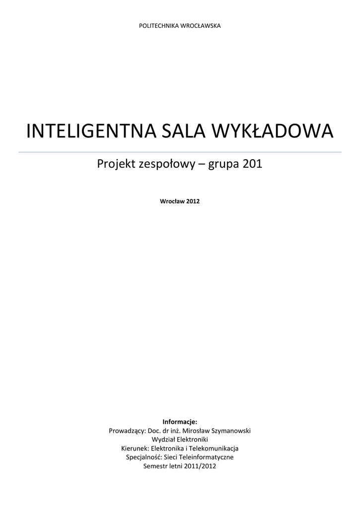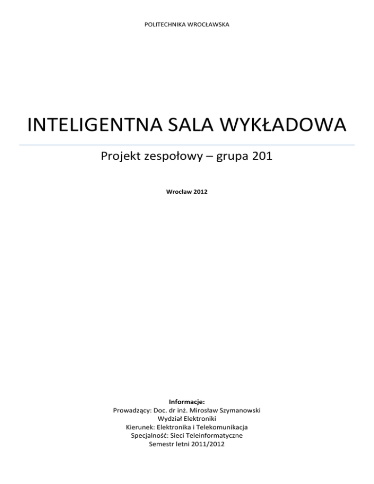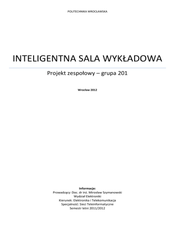 POLITECHNIKA WROCŁAWSKA INTELIGENTNA SALA WYKŁADOWA Projekt zespołowy – grupa 201 Wrocław 2012 Informacje: Prowadzący: Doc. dr inż. Mirosław Szymanowski Wydział Elektroniki Kierunek: Elektronika i Telekomunikacja Specjalnośd: Sieci Teleinformatyczne Semestr letni 2011/2012 1. INFORMACJE WSTĘPNE Projekt został zrealizowany w ramach zajęd podczas 6 semestru na kierunku Elektronika i Telekomunikacja, specjalnośd Sieci Teleinformatyczne. Celem było zaprojektowanie inteligentnej sali wykładowej, a bazą do projektowania systemów miała byd sala 201 w budynku C1 Politechniki Wrocławskiej. 1.1. Skład zespołu Funkcja Kierownik Audytor Członek Członek Członek Członek Członek Członek Członek Nazwisko i Imię Pizoo Barbara Dmochowski Paweł Iwach Krystian Liczbik Bartosz Lis Michał Moszczyoski Paweł Urbaniak Piotr Uzarowicz Mateusz Waligóra Michał Nr albumu 180646 171399 180813 182583 180804 180955 171260 171416 180879 Tab. 1. Skład zespołu wraz z opisem wykonywanych funkcji W skład zespołu wchodziło łącznie 9 osób. Zadaniem kierownika było prowadzenie pracy grupy, wyznaczanie zadao oraz prezentacja wyników pracy na cotygodniowych zajęciach. Rolą audytora było czuwanie nad sprawnym przebiegiem spotkao zespołu, zastępowaniem kierownika w przypadku nieobecności na spotkaniach grupy lub zajęciach dydaktycznych. Spotkania zespołu miały charakter wirtualny(za pośrednictwem czatu w Google Docs). Używaliśmy grupy dyskusyjnej Google oraz dokumentu Google Docs, w którym kontrolowaliśmy postęp prac i zapisywaliśmy poszczególne uwagi. 1.2. Podział zadao Na początku naszej wspólnej pracy zostały rozdzielone zadania wyszczególnieniem konkretnych systemów, jakie będą znajdowały się w sali. Nazwisko Imię Dmochowski Paweł, Moszczyoski Paweł Iwach Krystian Liczbik Bartosz Lis Michał Pizoo Barbara Urbaniak Piotr Uzarowicz Mateusz Waligóra Michał do opracowania z System Audiowizualny, nawigacyjny, ujednolicenie wymagao systemów Oświetlenia, eksploatacja systemów Sprawdzania obecności, eksploatacja systemów Okablowanie, integracja z salą 205 Inne Przeciwpożarowy/alarmowy, archiwizacja danych System klimatyzacji, integracja z salą 205 Sied komputerowa/internetowa, archiwizacja danych Tab. 2. Podział zadao w zespole 2|Strona 2. ZAŁOŻENIA PROJEKTOWE Inteligentna sala wykładowa w naszym wyobrażeniu powinna zawierad kilka systemów, które przedstawiamy poniżej wraz z krótkim opisem: 1) System sprawdzania obecności Wyposażenie ławek studentów w czytniki legitymacji, które będę pobierad dane o studentach i wysyład je do wiadomości prowadzącego; Możliwośd zapisu ocen w pamięci legitymacji; Dane dostępne jedynie prowadzącemu. 2) System oświetlenia Oświetlenie sali podzielone na strefy; Autoregulacja naświetlenia sali względem warunków atmosferycznych. 3) System klimatyzacji Klimatyzacja sali podzielona na strefy; Wymiana powietrza na „świeże” po zakooczonych zajęciach. 4) System audio-wizualny Stały mikrofon dla prowadzącego zamieszczony przy katedrze; Mikrofony wbudowane w panele przy stanowiskach dla studentów sterowane przez prowadzącego; Mikrofon krtaniowy dla wykładowcy; Interaktywna tablica; Możliwośd podłączenia słuchawek (także słuchawki bezprzewodowej) do wejścia zintegrowanego z mikrofonem prowadzącego; Organizacja wideokonferencji. 5) System nawigacyjny Sterowanie wszystkimi systemami dostępnymi na sali z panelu prowadzącego; Wizualizacja stanu wszystkich czujników i odczytów na sali. 6) System przeciwpożarowy, alarmowy Zainstalowanie czujników przeciwpożarowych(czad, gaz), zraszaczy; Umieszczenie przy katedrze przycisków wzywających Straż Politechniki Wrocławskiej, umożliwiające kontakt z Policją, Pogotowiem, Strażą Pożarną. 7) Sied komputerowa/internetowa Udostępnianie wykładów w czasie rzeczywistym(dla niepełnosprawnych); Wyposażenie sali w panele dotykowe przy każdym stanowisku dla studentów i prowadzącego; Zainstalowanie sieci komputerowej umożliwiającej przesyłanie danych między prowadzącym a studentami(między panelami), a także pozwalającej na wysłanie danych do urządzeo zewnętrznych; Dostęp do poczty studenckiej; Dostosowanie systemu do organizacji elektronicznych testów, kolokwiów i egzaminów ze sterowaniem w panelu prowadzącego; Sied dostępna tylko dla danej sali, ograniczenie liczby użytkowników; Zastosowanie ekranów, które umożliwiają wgląd w wyświetlane dane wyłącznie osobom siedzącym na wprost ekranu. 3|Strona 8) Inne Dostosowanie pierwszego rzędu siedzeo na sali oraz wejścia do użytkowania przez niepełnosprawnych; Wykonanie i wyprofilowanie siedzeo w taki sposób, aby były one wygodne dla słuchaczy; Oprócz paneli dotykowych stanowiska dla studentów wyposażone są w miejsce do notowania ręcznego. 3. OPIS PARAMETRÓW SALI 201 Aby uzyskad dostęp do sali, w celu zebrania wymiarów podjęliśmy kontakt z administracją budynku C1. Uzyskaliśmy również dostęp do archiwów budowlanych i projektowych, dzięki którym udało nam się uzyskad kilka rysunków potrzebnych w dalszej części projektowania. Rys. 1. Rozmieszczenie poszczególnych stanowisk w projektowanej sali 201 4|Strona 3.1. Wymiary sali Tab. 3. Zmierzone wymiary sali 201 Nazwa Strona Wymiar [m] Długośd Szerokośd Długośd dolnej ławki Odległośd dolnej ławki od ściany przedniej --------dół góra ----lewa --lewa/prawa lewa/prawa lewa/prawa lewa prawa 13,53 17,40 9,13 4,36 5,73 4,34 5,50 11,42 7,38 3,03 12,85 3,05 2,38 3,03 2,95 Wysokośd sali Odległośd rzutnika od ściany Szerokośd sali bez korytarzy Długośd podjazdu dla niepełnosprawnych Szerokośd kabiny administratora Długośd korytarzy Wysokośd korytarzy Wysokośd korytarzy na schodach Szerokośd korytarza (max) 3.2. Przekrój sali --- Sala 201 --- Fragment sali 205 --- Pierwsze piętro bud. C1 --- Parter bud. C1 Rys. 2. Przekrój budynku C1 z widokiem na salę 201 Na wyżej prze