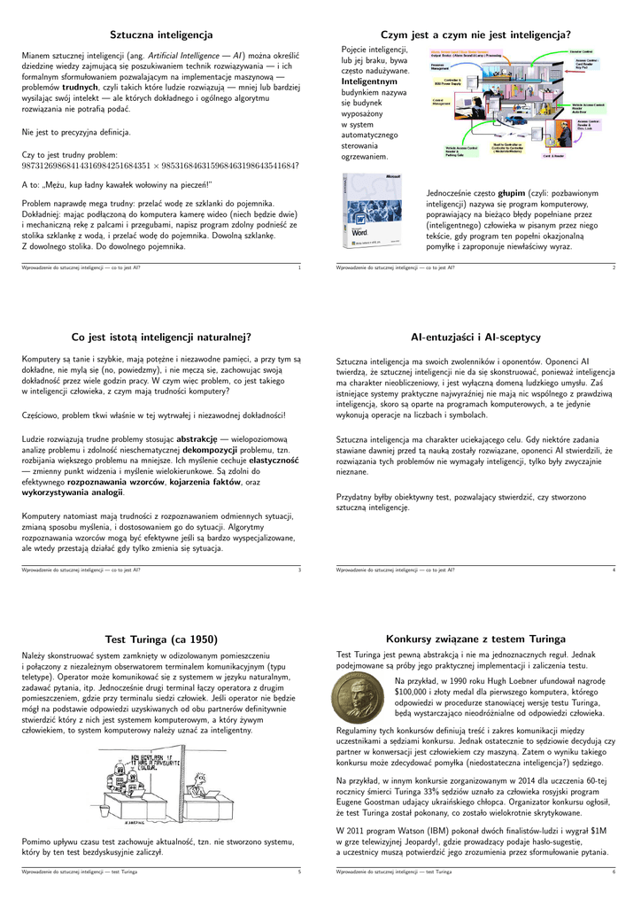Sztuczna inteligencja Czym jest a czym nie jest inteligencja? Mianem sztucznej inteligencji (ang. Artificial Intelligence — AI ) można określić dziedzine֒ wiedzy zajmuja֒ca֒ sie֒ poszukiwaniem technik rozwia֒zywania — i ich formalnym sformulowaniem pozwalaja֒cym na implementacje֒ maszynowa֒ — problemów trudnych, czyli takich które ludzie rozwia֒zuja֒ — mniej lub bardziej wysilaja֒c swój intelekt — ale których dokladnego i ogólnego algorytmu rozwia֒zania nie potrafia֒ podać. Nie jest to precyzyjna definicja. Czy to jest trudny problem: 98731269868414316984251684351 × 985316846315968463198643541684? A to: Meż u, kup ladny kawalek wolowiny na pieczeń!” ” ֒ Jednocześnie cze֒ sto glupim (czyli: pozbawionym inteligencji) nazywa sie֒ program komputerowy, poprawiaja֒cy na bieża֒co ble֒ dy popelniane przez (inteligentnego) czlowieka w pisanym przez niego tekście, gdy program ten popelni okazjonalna֒ pomylke֒ i zaproponuje niewlaściwy wyraz. Problem naprawde֒ mega trudny: przelać wode֒ ze szklanki do pojemnika. Dokladniej: maja֒c podla֒czona֒ do komputera kamere֒ wideo (niech be֒ dzie dwie) i mechaniczna֒ reke֒ z palcami i przegubami, napisz program zdolny podnieść ze stolika szklanke֒ z woda֒, i przelać wode֒ do pojemnika. Dowolna֒ szklanke֒ . Z dowolnego stolika. Do dowolnego pojemnika. Wprowadzenie do sztucznej inteligencji — co to jest AI? Poje֒ cie inteligencji, lub jej braku, bywa cze֒ sto nadużywane. Inteligentnym budynkiem nazywa sie֒ budynek wyposażony w system automatycznego sterowania ogrzewaniem. 1 Wprowadzenie do sztucznej inteligencji — co to jest AI? 2 Co jest istota֒ inteligencji naturalnej? AI-entuzjaści i AI-sceptycy Komputery sa֒ tanie i szybkie, maja֒ poteż ֒ ne i niezawodne pamie֒ ci, a przy tym sa֒ dokladne, nie myla֒ sie֒ (no, powiedzmy), i nie me֒ cza֒ sie֒ , zachowuja֒c swoja֒ dokladność przez wiele godzin pracy. W czym wie֒ c problem, co jest takiego w inteligencji czlowieka, z czym maja֒ trudności komputery? Sztuczna inteligencja ma swoich zwolenników i oponentów. Oponenci AI twierdza֒, że sztucznej inteligencji nie da sie֒ skonstruować, ponieważ inteligencja ma charakter nieobliczeniowy, i jest wyla֒czna֒ domena֒ ludzkiego umyslu. Zaś istnieja֒ce systemy praktyczne najwyraźniej nie maja֒ nic wspólnego z prawdziwa֒ inteligencja֒, skoro sa֒ oparte na programach komputerowych, a te jedynie wykonuja֒ operacje na liczbach i symbolach. Cześ ֒ ciowo, problem tkwi wlaśnie w tej wytrwalej i niezawodnej dokladności! Ludzie rozwia֒zuja֒ trudne problemy stosuja֒c abstrakcje֒ — wielopoziomowa֒ analize֒ problemu i zdolność nieschematycznej dekompozycji problemu, tzn. rozbijania wie֒ kszego problemu na mniejsze. Ich myślenie cechuje elastyczność — zmienny punkt widzenia i myślenie wielokierunkowe. Sa֒ zdolni do efektywnego rozpoznawania wzorców, kojarzenia faktów, oraz wykorzystywania analogii. Komputery natomiast maja֒ trudności z rozpoznawaniem odmiennych sytuacji, zmiana֒ sposobu myślenia, i dostosowaniem go do sytuacji. Algorytmy rozpoznawania wzorców moga֒ być efektywne jeśli sa֒ bardzo wyspecjalizowane, ale wtedy przestaja֒ dzialać gdy tylko zmienia sie֒ sytuacja. Wprowadzenie do sztucznej inteligencji — co to jest AI? 3 Sztuczna inteligencja ma charakter uciekaja֒cego celu. Gdy niektóre zadania stawiane dawniej przed ta֒ nauka֒ zostaly rozwia֒zane, oponenci AI stwierdzili, że rozwia֒zania tych problemów nie wymagaly inteligencji, tylko byly zwyczajnie nieznane. Przydatny bylby obiektywny test, pozwalaja֒cy stwierdzić, czy stworzono sztuczna֒ inteligencje֒ . Wprowadzenie do sztucznej inteligencji — co to jest AI? 4 Konkursy zwiazane z testem Turinga ֒ Test Turinga jest pewna֒ abstrakcja֒ i nie ma jednoznacznych regul. Jednak podejmowane sa֒ próby jego praktycznej implementacji i zaliczenia testu. Test Turinga (ca 1950) Należy skonstruować system zamknie֒ ty w odizolowanym pomieszczeniu i pola֒czony z niezależnym obserwatorem terminalem komunikacyjnym (typu teletype). Operator może komunikować sie֒ z systemem w je֒ zyku naturalnym, zadawać pytania, itp. Jednocześnie drugi terminal la֒czy operatora z drugim pomieszczeniem, gdzie przy terminalu siedzi czlowiek. Jeśli operator nie be֒ dzie mógl na podstawie odpowiedzi uzyskiwanych od obu partnerów definitywnie stwierdzić który z nich jest systemem komputerowym, a który żywym czlowiekiem, to system komputerowy należy uznać za inteligentny. Na przyklad, w 1990 roku Hugh Loebner ufundowal nagrode֒ $100,000 i zloty medal dla pierwszego komputera, którego odpowiedzi w procedurze stanowia֒cej wersje֒ testu Turinga, be֒ da֒ wystarczaja֒co nieodróżnialne od odpowiedzi czlowieka. Regulaminy tych konkursów definiuja֒ treść i zakres komunikacji mie֒ dzy uczestnikami a se֒ dziami konkursu. Jednak ostatecznie to se֒ dziowie decyduja֒ czy partner w konwersacji jest czlowiekiem czy maszyna֒. Zatem o wyniku takiego konkursu może zdecydować pomylka (niedostateczna inteligencja?) se֒ dziego. Na przyklad, w innym konkursie zorganizowanym w 2014 dla uczczenia 60-tej rocznicy śmierci Turinga 33% se֒ dziów uznalo za czlowieka rosyjski program Eugene Goostman udaja֒cy ukraińskiego chlopca. Organizator konkursu oglosil, że test Turinga zostal pokonany, co zostalo wielokrotnie skrytykowane. W 2011 program Watson (IBM) pokonal dwóch finalistów-ludzi i wygral $1M w grze telewizyjnej Jeopardy!, gdzie prowadza֒cy podaje haslo-sugestie֒ , a uczestnicy musza֒ potwierdzić jego zrozumienia przez sformulowanie pytania. Pomimo uplywu czasu test zachowuje aktualność, tzn. nie stworzono systemu, który by ten test bezdyskusyjnie zaliczyl. Wprowadzenie do sztucznej inteligencji — test Turinga 5 Wprowadzenie do sztucznej inteligencji — test Turinga 6 Szachy komputerowe Inne gry Szachy sa֒ gra֒ wymagaja֒ca֒ inteligencji i od zawsze stano
