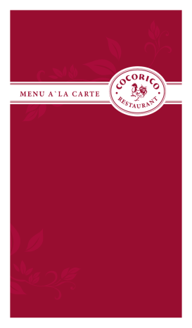 ŚNIADANIA / BREAKFAST Cocorico / Cocorico breakfast 28,00 PLN jajecznica na szynce, ser żółty, twarożek ze szczypiorkiem, pieczywo, masło, konfitura, miód, kawa lub herbata scrambled eggs with ham, cheese, cottage cheese with chives, bread, butter, fruit preserves, honey, coffee or tea 1. Zestaw Śniadanie angielskie / English breakfast 25,00 PLN pieczone pomidory, frankfurterka, bekon, jajka sadzone, tost roasted tomatoes, wienerwurst, bacon, fried eggs, toast 2. Omlet ze szpinakiem i kozim serem / Omelette with spinach and goat cheese 18,00 PLN 3. Domowa granola / Homemade muesli 16,00 PLN płatki owsiane, migdały, pestki słonecznika, orzechy włoskie, jogurt, miód, owoce oatmeal, almonds, sunflower seeds, walnuts, yoghurt, honey, fruits 4. 5. Jajecznica na maśle z trzech jaj / Scrambled eggs on butter pieczywo, masło / bread, butter 12,00 PLN SAŁATY / SALADS 1. Sałata Cezar / Ceasar salad 28,00 PLN sałata rzymska, filet z kurczaka kukurydzianego, pieczarki, grzanki, parmezan, sos z anchois romaine lettuce, grilled chicken, champignons, crouton, parmesan cheese, anchovy dressing 2. Sałata z serem pleśniowym / Blue cheese salad 27,00 PLN ser gorgonzola, karmelizowana gruszka, pestki dyni, cykoria, szpinak baby, sos pomarańczowo-limonkowy gorgonzola, caramelized pear, pumpkin seeds, chicory, baby spinach, orange-lime sauce 3. Sałata z polędwicą wołową / Beef tenderloin salad 32,00 PLN pomidory cherry, prażone orzechy włoskie, piklowana czerwona cebula, balsamico cherry tomatoes, roasted walnuts, pickled red onion, balsamic dressing 4. Sałata z czarną soczewicą / Black lentil salad 22,00 PLN ciecierzyca, dynia, kalafior, szalotka, musztarda, oliwa ziołowa chickpea, pumpkin, cauliflower, scallion, mustard, herb oil DANIA DLA DZIECI / KIDS MENU 1. Filet z kurczaka kukurydzianego / Chicken fillet 22,00 PLN kasza kuskus, rodzynki, marchewka, espuma beszamelowa couscous, raisins, carrot, béchamel foam 2. Spaghetti z sosem ze świeżych pomidorów i mozarellą / Spaghetti with fresh tomatoe sauce and mozzarella 18,00 PLN PRZYSTAWKI / APPETIZERS 1. Tatar wołowy / Beef tartar 32,00 PLN żółtko gotowane w 63 °C, szalotka, kurka piklowana, oliwa lubczykowa egg yolk boiled in 63 °C, shallot, pickled chanterelle, lovage oil 2. Croque Monsieur 16,00 PLN grzanka z pieczywa pełnoziarnistego, szynka, ser żółty, espuma z beszamelu, sałata wholemeal bread, ham, cheese, béchamel foam, salad 3. Croque Madame 18,00 PLN / 16,00 PLN grzanka z pieczywa pełnoziarnistego, szynka, ser żółty, jajko sadzone, espuma z beszamelu, sałata wholemeal bread, ham, cheese, fried egg, béchamel foam, salad 4. Ravioli z kaszą gryczaną i grzybami / Ravioli with buckwheat and mushrooms 22,00 PLN espuma z borowików, oliwa rozmarynowa porcini mushrooms mousse, rosemary oil 5. Deska polskich serów / Polish cheese platter 22,00 PLN ZUPY / SOUPS 1. Krem z kurek / Chanterelle cream soup 15,00 PLN olej lniany, słonina wędzona, crème fraîche, zioła linseed oil, smoked bacon, crème fraîche, herbs możliwa opcja wege 2. Zupa dnia / Soup of the Day DANIA GŁÓWNE / MAIN COURSES 1. Żeberka wieprzowe / Pork ribs 32,00 PLN puree ziemniaczane, miód, piwo, confitowane warzywa korzeniowe, sos śliwkowy potato puree, honey, beer, confit spice vegetables, plum sauce 2. Filet z kaczki sous vide / Sous vide duck fillet 38,00 PLN pieczony burak, kasza bulgur, puree z jabłka roasted beetroot, bulgur groats, apple puree 3. Pierogi z cielęciną / Dumplings stuffed with veal 26,00 PLN mus z selera, seler naciowy, confitowana cebula, zioła celery mousse, celery, onion confit, herbs 4. Befsztyk z polędwicy wołowej / Beef tenderloin 62,00 PLN pieczony ziemniak, confitowana papryka, wędzona cebula, sos maderowy roasted potato, confit pepper, smoked onion, Madeira sauce 5. Filet z jesiotra gotowanego w niskiej temperaturze / Sturgeon fillet cooked in low temperature 42,00 PLN czarna soczewica, szpinak, mus z pietruszki, mule, espuma z dyni black lentils, spinach, parsley mousse, pumpkin mousse 6. Tagliatelle z grzybami / Tagliatelle with mushrooms 25,00 PLN borowiki, szalotka, szpinak, parmezan, zioła porcini mushrooms, scallion, spinach, parmesan cheese, herbs Wiemy jak ważny jest czas, dlatego wszystkie dania staramy się przygotować dla Państwa jak najszybciej. Korzystamy jednka wyłącznie ze świeżych składników, dlatego czas oczekiwania może niekiedy trwać około 30 minut. DESERY / DESSERTS 1. Bezowy tort lodowy Cocorico / Cocorico meringue ice cream cake 2. Sernik 3. Szarlotka 4. Tarta firmowy / Homemade cheesecake 16,00 PLN 16,00 PLN z lodami waniliowymi / Apple pie with vanilla ice cream z owocami sezonowymi / Sweet tarte with seasonal fruits 15,00 PLN 12,00 PLN 5. Fondant czekoladowy / Chocolate fondant 18,00 PLN sos malinowy, owoce / raspberry sauce, fruits 6. Crème 7. Lody brûlée 14,00 PLN z zieloną herbatą / Green tea ice cream dessert biała czekolada, gorący sos malinowy, owoce white chocolate, hot raspberry sauce, fruits 19,00 PLN 8. Kulka lodów / Ice cream scoop 4,00 PLN waniliowe, czekoladowe, truskawkowe / vanilla, chocolate, strawberry Wszystkie podawane przez nas ciasta wypiekamy sami, na bazie naturalnych składników, maśle oraz prawdziwych jajach. KAWY / COFFEES 1. Kawa / Coffee 9,00 PLN 2. Espresso 8,00 PLN 3. Espresso doppio 12,00 PLN 4. Cappuccino 10,00 PLN 5. Caffè 6. Latte 7. Kawa latte 11,00 PLN macchiatto 11,00 PLN po wiedeńsku / Vienna coffee 11,00 PLN 8. Kawa z rumem, Amaretto, Bailey’s lub adwokatem / Coffee with rum, Amaretto, Bailey’s or Advocaat Liqueur 20 ml 9. Irish coffee 15,00 PLN 16,00 PLN HERBATY / TEA 1. Imbryk herbaty liściastej Newby London / Pitcher of Newby London tea 10,00 PLN English Breakfast, Earl Grey, Green Sencha, Jasmin Blossom, Strawberry&Mango, Winter Dream, Marrocan Nights, Peppermint, Rooibos Orange, Berries Delight, Rosehip&Hibiscus 2. Herbata w saszetkach Newby London / Newby London in teabags 8,00 PLN Green Sen