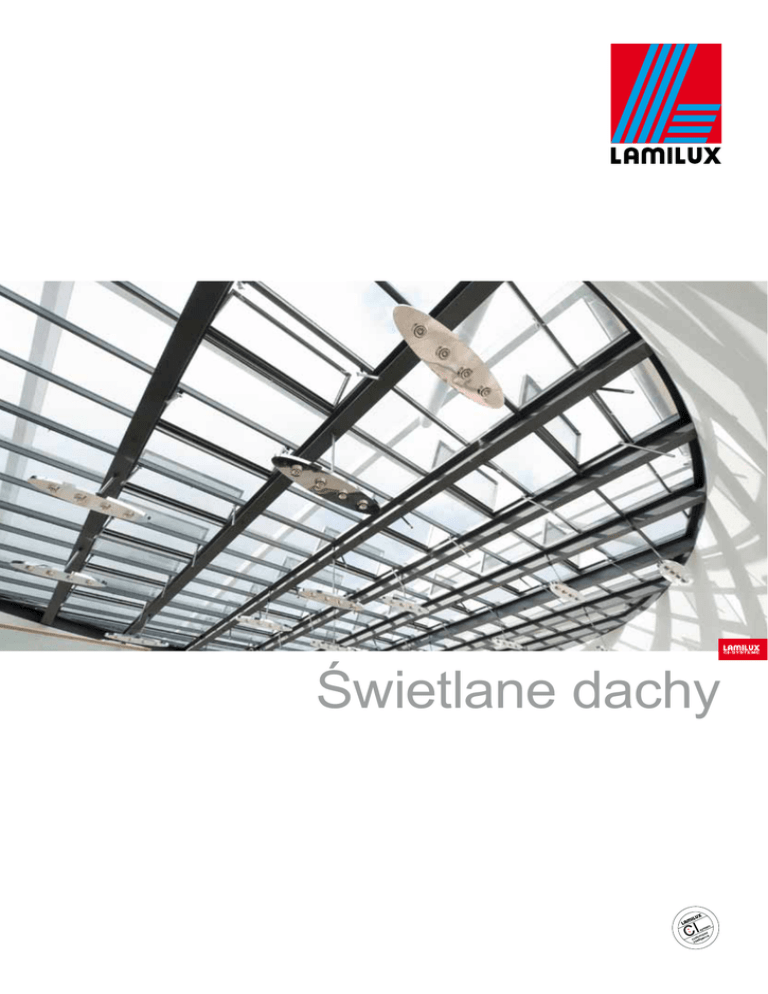 Świetlane dachy LAMILUX Systemy CI – Świetlane dachy Dostarczyć więcej światła dziennego do pomieszczenia i to z Dzięki zastosowaniu naszych wysokiej jakości systemów, wszelkimi tego pozytywnymi skutkami — więcej motywacji, których konstrukcja opiera się na tworzywie sztucznym, szkle większą wydajność, lepszą jakość życia — oraz sprawić to i aluminium, wnosimy światło do Państwa życia. Znacznie odczuwalnym: od dziesiątków lat symbolem tego jest marka wykraczające poza produkty standardowe i zawsze indywidualnie LAMILUX. Dzięki niepowtarzalnej różnorodności systemów oraz zgodnie ze specyfiką obiektu adaptowalne spektrum dla zabudowy przemysłowej i biurowej oraz reprezentacyjnych systemów CI świetlików kopułkowych, naświetli pasmowych aż budowli obiektowych, ugruntowaliśmy swoją pozycję w Europie po estetyczną i nowoczesną formę szklanych dachów, nadającą jako zorientowany na jakość i innowacje producent systemów smaku nowoczesnej, współczesnej architekturze. naświetlania i Wszystkie systemy służą opcjonalnie również jako układy wentylacji oraz technologii sterujących. Naszą zaletą jest to, oddymiania i wentylacji (RWA), a także przewietrzania. W że jako jedyny niemiecki producent oferujemy kompleksowo, połączeniu z naszymi inteligentnymi technologiami sterowania, w tak szerokiej palecie wariantów projektowanie systemów, ich budynki pobudzane są do życia: jako integrator systemów, konstrukcję, montaż oraz serwis. tworzymy sieć dla sterowania systemami oddymiania, wszelkimi światłem dziennym, układów oddymiania komponentami zabezpieczenia przed słońcem oraz optymalizacji klimatyzacyjnej. Tym samym nadajemy takt perfekcyjnej harmonii wszelkich przebiegów w powłokach budynku. Filozofia CI LAMILUX Customized Intelligence – programowa obsługa dostosowana do Klienta: • Lider w jakości – największa korzyść dla Klienta • Lider w innowacji – technologiczne zaawansowanie • Lider w obsłudze – szybko, bez komplikacji, niezawodnie i przyjaźnie • Lider w kompetencji – najlepsze techniczne i handlowe doradztwo • Lider w rozwiązywaniu problemów – indywidualne, dostosowane indywidualnie rozwiązania 2 System CI Architektura szklana KWS 60 System CI Kopułka świetlikowa F100 strona 6 System CI Pasmo świetlne B 3 strona 15 System CI Klapa dymowa strona 8 strona 16 System CI Pasmo świetlne S System CI Klapa dymowa B/S strona 10 strona 18 System CI Naświetle ścienne System CI Klapa dymowa M Napowietrzanie strona 11 strona 19 System CI Architektura szklana F Technika sterowania systemami oddymiania strona 12 strona 20 System CI Architektura szklana M / ME Serwis i modernizacja strona 14 strona 21 Systemy CI LAMILUX Architektura szklana KWS 60 Przykład wykonania - dach kolebkowy Kopuła świetlikowa F100 z regulowaną wentylacją o dużej pow. do złych warunków pogodowych str. 15 str. 6 Architektura szklana FP Strażnik pogodowy Czujnik wiatru i deszczu str. 12 Pasmo świe str. 8 S Architektura szklana KWS 60 Przykład wykonania - piramida str. 15 Architektura szklana FE str. 12 Klapa dymowa SW 16 o. Klapa przyciemniona tłumiąca ciepło Klapa dymowa M str. 19 Architektura szklana ME str. 14 Skrzydło wentylacyjne M str. 15 Klapa dymowa B str. 18 Pasmo świetlne S etlne B str. 10 Klapa dymowa DK Kopuła świetlikowa F100 z wbudowaną wentylacją przy złej pogodzie System ochronny LAMILUX z efektem drzewa liściastego Architektura szklana KWS 60 z wbudowanymi elementami systemu fotowoltaiki Przykład wykonania Sheddach str. 17 Skrzydło wentylacyjne B str. 18 Klapa dymowa S str. 18 str. 15 Klapa dymowa M str. 19 Kopuła świetlikowa F100 pozycja przewietrzania str. 6 Klapa dymowa F100 str. 16 Technika sterowania systemami oddymiania z technologią SPSe str. 20 System podstaw str. 7 Dopowietrzanie str. 19 Naświetle ścienne Skrzydło wentylacyjne str. 11 System podstaw LAMILUX • GFK • aluminium • blacha stalowa System CI Kopułka świetlikowa F100 Rama – wytrzymałość i design Nowe profile ramy posiadają: Ponadczasowy design w nowej szacie i duża wytrzymałość • innowacyjne wzmocnienie profilu ramy przez zastosowanie to charakterystyczne znaki nowej ramy. Duży wpływ na izolację tworzywa sztucznego wzmocnionego długimi włóknami, cieplną i w konsekwencji efektywność energetyczną świetlika • listwę wewnątrz profilu, umożliwiającą łatwy montaż wszelkich kopułkowego ma nowy układ uszczelek, którymi rama uchwytów i rygli połączona jest z podstawą. Ze względu na układ przestrzenny • wielostopniowy system podwójnego uszczelnienia, tworzą one cztery oddzielne komory izolujące. • gotowe otwory montażowe, gwarantujące równomierne rozmieszczenie naprężeń na elementy okucia, • obwodowa komora ramy tworząca dodatkowe profile uszczelniające, SZCZEGÓŁ SZCZEGÓŁ • dwuczęściowe zawiasy zapewniające szybki i łatwy montaż. Listwa mocująca przeszklenie Wyprofilowana listwa z tworzywa sztucznego zapewnia równomierne przenoszenie obciążeń. Zalety • Przeszklenie jest mocowane równomiernie w ramie. • Profil mocowany w ramie umożliwia proste zamocowanie elementów okucia. Wielostopniowy system podwójnego uszczelnienia Na profilu ramy i na listwie mocującej przeszklenia znajdują się koekstrudowane uszczelki stykające się z górną powierzchnią podstawy. Uszczelki wewnętrzne łączą się na stykach narożnych na teową zakładkę. Zalety • Powstają cztery zamknięte termoizolacyjnie komory uszczelniające, zwiększające izolacyjność systemu. • Dobra charakterystyka izolacji akustycznej. • Pewniejsza ochrona przed ulewnym deszczem. 6 SZCZEGÓŁ PODSTAWA - Doskonałe uszczelnienie Podstawa stanowi ważną część całego systemu świetlika Podstawy dostępne są w wersji z GFK ( z tworzywa sztuczne- kopułkowego. Stale doskonalona pod kątem wytrzymałości i go wzmacnianego włóknem szklanym) i blachy stalowej