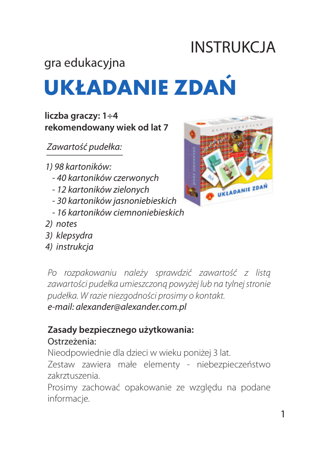 gra edukacyjna INSTRUKCJA UKŁADANIE ZDAŃ liczba graczy: 1÷4 rekomendowany wiek od lat 7 Zawartość pudełka: 1) 98 kartoników: - 40 kartoników czerwonych - 12 kartoników zielonych - 30 kartoników jasnoniebieskich - 16 kartoników ciemnoniebieskich 2) notes 3) klepsydra 4) instrukcja Po rozpakowaniu należy sprawdzić zawartość z listą zawartości pudełka umieszczoną powyżej lub na tylnej stronie pudełka. W razie niezgodności prosimy o kontakt. e-mail: [email protected] Zasady bezpiecznego użytkowania: Ostrzeżenia: Nieodpowiednie dla dzieci w wieku poniżej 3 lat. Zestaw zawiera małe elementy - niebezpieczeństwo zakrztuszenia. Prosimy zachować opakowanie ze względu na podane informacje. 1 Konieczność nadzoru przy zabawie osoby dorosłej. Klepsydrę należy używać ze szczególną ostrożnością. Opakowanie nie jest częścią zabawki. Stan zabawki należy regularnie kontrolować. Gra dydaktyczna "Układanie zdań" polega na układaniu kartoników z obrazkami i różnymi częściami mowy w taki sposób, aby powstało logiczne i poprawne gramatycznie zdanie. Gra wprowadza dzieci w świat gramatyki, uczy logicznego myślenia, kształtuje słuch fonemowy, doskonali umiejętność wypowiadania się i uruchamia dziecięcą wyboraźnię. Gra „Układanie zdań” to nauka i świetna zabawa dla dzieci i rodziców lub opiekunów mogących miło i pożytecznie spędzić razem czas. UWAGA: w grze powinna zawsze uczestniczyć osoba dorosła, znająca zasady języka polskiego, która będzie pomagać dzieciom w prawidłowym przebiegu gry, a także będzie wskazywać właściwe formy budowanych zdań, rozstrzygając wszelkie spory i wątpliwości. PRZYGOTOWANIE DO GRY Kartoniki z postaciami i zwierzętami (kartoniki o zielonym spodzie) należy odwrócić przednią stroną do dołu (tak, aby obrazki nie były widoczne). Następnie tak samo postąpić z kartonikami przedstawiającymi przedmioty i miejsca (kartoniki o jasnoniebieskim spodzie). Kartoniki z zapisanymi na czerwono czasownikami należy natomiast ułożyć spodem do dołu, czyli tak, aby możliwe było ich odczytanie. 2 Ostatnią grupę stanowią kartoniki dodatkowe z wypisanymi na ciemnoniebiesko innymi częściami mowy, które także należy ułożyć spodem ku dołowi, tak by dało się je odczytać. Wszystkie cztery grupy kartoników mają być od siebie oddzielone, a poszczególne kartoniki w grupach mają leżeć tak, by żadne z nich nie nachodziły na siebie. PRZEBIEG GRY Grę zaczyna najmłodszy jej uczestnik. Jego pierwszym zadaniem jest ułożenie krótkiego zdania z dwóch lub trzech (w wyjątkowych przypadkach czterech) kartoników na czas, który odmierzany jest przez klepsydrę (6 obróceń). W pierwszej kolejności gracz losuje jeden spośród zielonych kartoników, odkrywa go, a następnie postępuje ZGODNIE Z JEDNĄ Z PONIŻEJ OPISANYCH MOŻLIWOŚCI: 1. OPCJA: do wylosowanego kartonika dobiera dowolnie wybrany przez siebie kartonik z czasownikiem (napisanym na czerwono), układa dwa posiadane kartoniki (zielony z postacią lub zwierzęciem i drugi z czasownikiem) obok siebie, tak by tworzyły logiczne zdanie proste, np. „BABCIA (rysunek) ŚPI”; „CHŁOPIEC (rysunek) PISZE”. 2. OPCJA: po wylosowaniu zielonego kartonika losuje drugi kartonik, tym razem z jasnoniebieskiej grupy i odsłania go, po czym dobiera do dwóch wylosowanych kartoników dowolnie przez siebie wybrany kartonik z czasownikiem i układa z posiadanych trzech kartoników logiczne zdanie, np. „DZIEWCZYNKA (rysunek) LUBI KWIATY (rysunek)”; „CHŁOPIEC (rysunek) PISZE DŁUGOPISEM (rysunek)”. 3 kartoniki przedstawiające przedmioty i miejsca (o jasnoniebieskim spodzie) kartoniki z postaciami i zwierzętami (o zielonym spodzie) spód kartoniki z wypisanymi na ciemnoniebiesko innymi częściami mowy kartoniki z zapisanymi na czerwono czasownikami 4 spód 3. OPCJA: po wylosowaniu zielonego kartonika losuje drugi kartonik z tej samej grupy (zielonych kartoników) i odsłania go, po czym dobiera do dwóch wylosowanych kartoników dowolnie przez siebie wybrany kartonik z czasownikiem i układa z posiadanych trzech kartoników logiczne zdanie, np. „PIES (rysunek) GONI KOTA(rysunek)”; „DZIEWCZYNKA (rysunek) LUBI NAUCZYCIELKĘ (rysunek)”; „CHŁOPIEC (rysunek) SŁUCHA DZIADKA (rysunek)”. 4. OPCJA: wyjątkowym przypadkiem, kiedy należy użyć czterech kartoników, jest sytuacja, gdy po wylosowaniu dwóch kartoników zgodnie z powyżej przedstawioną OPCJĄ 2. lub 3., gracz dobiera czasownik, który nie może istnieć w (tworzonym z posiadanych kartoników) zdaniu bez dodatkowego kartonika (np. „Z”, „NA”, „W” - napisanym na ciemnoniebiesko), w takich zdaniach jak np. „BABCIA (rysunek) ŚPI W ŁÓŻKU (rysunek)”; „DZIEWCZYNKA (rysunek) ROZMAWIA Z CHŁOPCEM (rysunek)”. Po ułożeniu poprawnego zdania zgodnie z jedną z czterech opisanych powyżej opcji, gracz musi je poprawnie odczytać na głos (czyli zastosować czasownik w odpowiedniej formie i odmienić dobrze rzeczowniki) i dopiero wówczas otrzymuje punkty za ułożone zdanie: - 1 pkt za zdanie ułożone zgodnie z 1. opcją - 2 pkt za zdanie ułożone zgodnie z 2. lub 3. opcją - 3 pkt za zdanie ułożone zgodnie z 4. opcją Po otrzymaniu punktów za poprawnie wykonane zadanie, gracz ma możliwość rozbudowania swojego zdania, używając dowolnie wybranych przez niego innych kartoników. Stara się wówczas wykorzystać jak największą ich liczbę, gdyż za każdy poprawnie wstawiony do zdania kartonik gracz otrzymuje kolejny punkt. 5 Czas w jakim musi się zmieścić to maksymalnie dwanaście obróceń klepsydry. Należy jednak ostrożnie dobierać kolejne kartoniki, gdyż w przypadku losowanych kartoników zielonych lub jasnoniebieskich, tylko po jednym z nich można wymienić lub odłożyć, a resztę zabranych trzeba wykorzystać w zdaniu, zaś wszystkie wybrane kartoniki wypisane kolorem czerwonym i ciemnoniebieskim należy wykorzystać w rozb