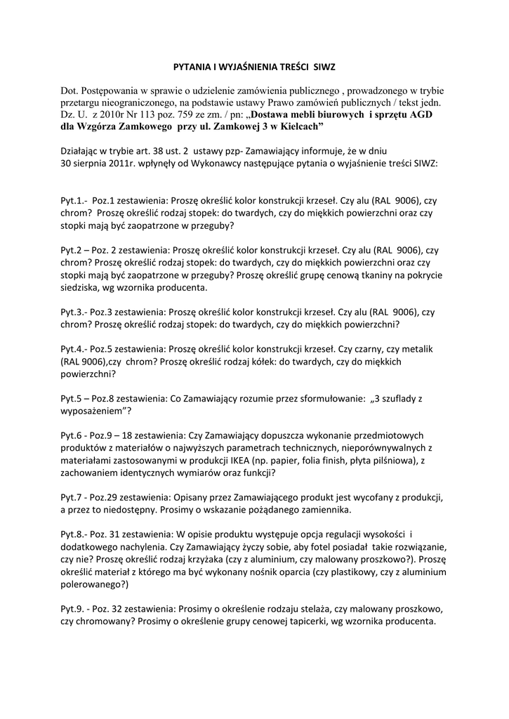 PYTANIA I WYJAŚNIENIA TREŚCI SIWZ Dot. Postępowania w sprawie o udzielenie zamówienia publicznego , prowadzonego w trybie przetargu nieograniczonego, na podstawie ustawy Prawo zamówień publicznych / tekst jedn. Dz. U. z 2010r Nr 113 poz. 759 ze zm. / pn: „Dostawa mebli biurowych i sprzętu AGD dla Wzgórza Zamkowego przy ul. Zamkowej 3 w Kielcach” Działając w trybie art. 38 ust. 2 ustawy pzp- Zamawiający informuje, że w dniu 30 sierpnia 2011r. wpłynęły od Wykonawcy następujące pytania o wyjaśnienie treści SIWZ: Pyt.1.- Poz.1 zestawienia: Proszę określid kolor konstrukcji krzeseł. Czy alu (RAL 9006), czy chrom? Proszę określid rodzaj stopek: do twardych, czy do miękkich powierzchni oraz czy stopki mają byd zaopatrzone w przeguby? Pyt.2 – Poz. 2 zestawienia: Proszę określid kolor konstrukcji krzeseł. Czy alu (RAL 9006), czy chrom? Proszę określid rodzaj stopek: do twardych, czy do miękkich powierzchni oraz czy stopki mają byd zaopatrzone w przeguby? Proszę określid grupę cenową tkaniny na pokrycie siedziska, wg wzornika producenta. Pyt.3.- Poz.3 zestawienia: Proszę określid kolor konstrukcji krzeseł. Czy alu (RAL 9006), czy chrom? Proszę określid rodzaj stopek: do twardych, czy do miękkich powierzchni? Pyt.4.- Poz.5 zestawienia: Proszę określid kolor konstrukcji krzeseł. Czy czarny, czy metalik (RAL 9006),czy chrom? Proszę określid rodzaj kółek: do twardych, czy do miękkich powierzchni? Pyt.5 – Poz.8 zestawienia: Co Zamawiający rozumie przez sformułowanie: „3 szuflady z wyposażeniem”? Pyt.6 - Poz.9 – 18 zestawienia: Czy Zamawiający dopuszcza wykonanie przedmiotowych produktów z materiałów o najwyższych parametrach technicznych, nieporównywalnych z materiałami zastosowanymi w produkcji IKEA (np. papier, folia finish, płyta pilśniowa), z zachowaniem identycznych wymiarów oraz funkcji? Pyt.7 - Poz.29 zestawienia: Opisany przez Zamawiającego produkt jest wycofany z produkcji, a przez to niedostępny. Prosimy o wskazanie pożądanego zamiennika. Pyt.8.- Poz. 31 zestawienia: W opisie produktu występuje opcja regulacji wysokości i dodatkowego nachylenia. Czy Zamawiający życzy sobie, aby fotel posiadał takie rozwiązanie, czy nie? Proszę określid rodzaj krzyżaka (czy z aluminium, czy malowany proszkowo?). Proszę określid materiał z którego ma byd wykonany nośnik oparcia (czy plastikowy, czy z aluminium polerowanego?) Pyt.9. - Poz. 32 zestawienia: Prosimy o określenie rodzaju stelaża, czy malowany proszkowo, czy chromowany? Prosimy o określenie grupy cenowej tapicerki, wg wzornika producenta. Pyt.10. – Poz.33 zestawienia: Prosimy o określenie koloru siatki oparcia (standard – siatka czarna, opcje płatne – siatka pomaraoczowa, zielona, czerwona i szara) Pyt.11. - Poz. 37zestawienia: Czy Zamawiający dopuszcza rozwiązanie równoważne z zachowaniem wszelkich parametrów jakościowych, lecz o wymiarach: Szerokośd: 1200 mm, głębokośd: 490 mm, wysokośd: 2405 mm. Pyt.12. - Poz. 38 zestawienia: Czy Zamawiający dopuszcza rozwiązanie równoważne z zachowaniem wszelkich parametrów jakościowych, lecz o wymiarach: Szerokośd: 600 mm, głębokośd: 490 mm, wysokośd: 2405 mm. Pyt.13. - Poz.39 zestawienia: Czy Zamawiający dopuszcza rozwiązanie równoważne z zachowaniem wszelkich parametrów jakościowych, lecz o wymiarach: Szerokośd: 1200 mm, głębokośd: 490 mm, wysokośd: 2140 mm. Pyt.14. - Poz. 41 zestawienia: Czy Zamawiający dopuszcza rozwiązanie równoważne z zachowaniem wszelkich parametrów jakościowych, lecz o wymiarach: Szerokośd: 1200 mm, głębokośd: 490 mm, wysokośd: 1800 mm. Pyt.15. - Poz. 50 – 51 zestawienia: Prosimy o określenie, jaki rodzaj szuflad jest pożądany przez Zamawiającego, czy tandembox, czy zwykłe? Pyt.16. Zamawiający w załączniku 1 do SIWZ w Formularzu ofertowym wymaga dołączenia do oferty cenowej kart katalogowych dla mebli z przedmiotu zamówienia. Nasza Firma jako producent mebli, nie posiada kart katalogowych dla mebli, które dopiero zostaną wyprodukowane pod zamówienie Zamawiającego. Czy Zamawiający zrezygnuje zatem z wymogu dołączenia do oferty kart katalogowych dla mebli z płyty meblowej, a w zamian za to dopuści rozwiązanie zamienne polegające na dołączeniu oświadczenia, iż wszystkie oferowane meble z drewna litego oraz z płyty meblowej będą zgodne z opisem przedmiotu zamówienia? Jednocześnie nadmieniamy, iż karty katalogowe krzeseł i foteli zostaną dołączone do oferty zgodnie z wymaganiami SIWZ. Pyt. 17. Zamawiający w Załączniku 1a do SIWZ – Oferta cenowa – uzupełnienie, nie podał informacji dotyczących ilości zamawianych mebli. Prosimy Zamawiającego o podanie informacji. Pyt. 18. Zamawiający w Załączniku 1a do SIWZ – Oferta cenowa – uzupełnienie, w poz.47 podał następujące wymiary dla biurka: 200 x 800 x 760. Prosimy o informację, czy wymiary te zostały wpisane prawidłowo? Jeżeli nie to prosimy Zamawiającego o podanie właściwych wymiarów. Zgodnie z art. 38 ust. 1 ustawy Prawo zamówieo publicznych – Zamawiający wyjaśnia, co następuje: Ad.1. Kolor konstrukcji krzeseł – ALU. Stopki do twardych powierzchni, z przegubami. Ad.2. Kolor konstrukcji krzeseł –CHROM. Stopki do twardych powierzchni, z przegubami. Tkanina – Rembrandt symb. R 09, I grupa cenowa Ad.3. Kolor konstrukcji krzeseł – CHROM. Stopki do twardych powierzchni. Ad.4. Kolor konstrukcji krzeseł – CZARNY. Kołka do twardych powierzchni. Ad.5. Kontener 3 szufladowy z nakładanym piórnikiem z tworzywa sztucznego w jednej szufladzie. Ad.6. Zamawiający dopuszcza wykonanie przedmiotowych produktów z materiałów o najwyższych parametrach technicznych,, z zachowaniem identycznych wymiarów, funkcji oraz wzornictwa. Ad.7. Ekspres przelewowo-ciśnieniowy o pojemności 1.4 l, mocy 1750 W, z funkcją spieniania mleka, podgrzewania oraz regulacją mocy kawy. Producent De Longhi Kod producenta BCO 264 Rodzaj Przelewowo-