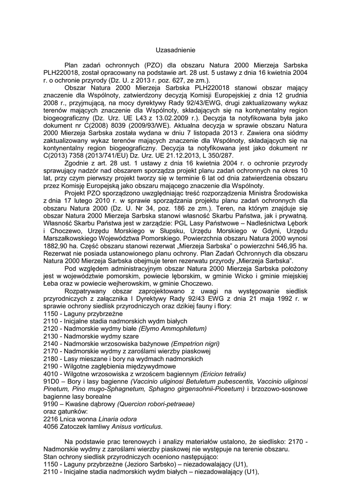 Uzasadnienie Plan zadań ochronnych (PZO) dla obszaru Natura 2000 Mierzeja Sarbska PLH220018, został opracowany na podstawie art. 28 ust. 5 ustawy z dnia 16 kwietnia 2004 r. o ochronie przyrody (Dz. U. z 2013 r. poz. 627, ze zm.). Obszar Natura 2000 Mierzeja Sarbska PLH220018 stanowi obszar mający znaczenie dla Wspólnoty, zatwierdzony decyzją Komisji Europejskiej z dnia 12 grudnia 2008 r., przyjmującą, na mocy dyrektywy Rady 92/43/EWG, drugi zaktualizowany wykaz terenów mających znaczenie dla Wspólnoty, składających się na kontynentalny region biogeograficzny (Dz. Urz. UE L43 z 13.02.2009 r.). Decyzja ta notyfikowana była jako dokument nr C(2008) 8039 (2009/93/WE). Aktualna decyzja w sprawie obszaru Natura 2000 Mierzeja Sarbska została wydana w dniu 7 listopada 2013 r. Zawiera ona siódmy zaktualizowany wykaz terenów mających znaczenie dla Wspólnoty, składających się na kontynentalny region biogeograficzny. Decyzja ta notyfikowana jest jako dokument nr C(2013) 7358 (2013/741/EU) Dz. Urz. UE 21.12.2013, L 350/287. Zgodnie z art. 28 ust. 1 ustawy z dnia 16 kwietnia 2004 r. o ochronie przyrody sprawujący nadzór nad obszarem sporządza projekt planu zadań ochronnych na okres 10 lat, przy czym pierwszy projekt tworzy się w terminie 6 lat od dnia zatwierdzenia obszaru przez Komisję Europejską jako obszaru mającego znaczenie dla Wspólnoty. Projekt PZO sporządzono uwzględniając treść rozporządzenia Ministra Środowiska z dnia 17 lutego 2010 r. w sprawie sporządzania projektu planu zadań ochronnych dla obszaru Natura 2000 (Dz. U. Nr 34, poz. 186 ze zm.). Teren, na którym znajduje się obszar Natura 2000 Mierzeja Sarbska stanowi własność Skarbu Państwa, jak i prywatną. Własność Skarbu Państwa jest w zarządzie: PGL Lasy Państwowe – Nadleśnictwa Lębork i Choczewo, Urzędu Morskiego w Słupsku, Urzędu Morskiego w Gdyni, Urzędu Marszałkowskiego Województwa Pomorskiego. Powierzchnia obszaru Natura 2000 wynosi 1882,90 ha. Część obszaru stanowi rezerwat „Mierzeja Sarbska” o powierzchni 546,95 ha. Rezerwat nie posiada ustanowionego planu ochrony. Plan Zadań Ochronnych dla obszaru Natura 2000 Mierzeja Sarbska obejmuje teren rezerwatu przyrody „Mierzeja Sarbska”. Pod względem administracyjnym obszar Natura 2000 Mierzeja Sarbska położony jest w województwie pomorskim, powiecie lęborskim, w gminie Wicko i gminie miejskiej Łeba oraz w powiecie wejherowskim, w gminie Choczewo. Rozpatrywany obszar zaprojektowano z uwagi na występowanie siedlisk przyrodniczych z załącznika I Dyrektywy Rady 92/43 EWG z dnia 21 maja 1992 r. w sprawie ochrony siedlisk przyrodniczych oraz dzikiej fauny i flory: 1150 - Laguny przybrzeżne 2110 - Inicjalne stadia nadmorskich wydm białych 2120 - Nadmorskie wydmy białe (Elymo Ammophiletum) 2130 - Nadmorskie wydmy szare 2140 - Nadmorskie wrzosowiska bażynowe (Empetrion nigri) 2170 - Nadmorskie wydmy z zaroślami wierzby piaskowej 2180 - Lasy mieszane i bory na wydmach nadmorskich 2190 - Wilgotne zagłębienia międzywydmowe 4010 - Wilgotne wrzosowiska z wrzoścem bagiennym (Ericion tetralix) 91D0 – Bory i lasy bagienne (Vaccinio uliginosi Betuletum pubescentis, Vaccinio uliginosi Pinetum, Pino mugo-Sphagnetum, Sphagno girgensohnii-Piceetum) i brzozowo-sosnowe bagienne lasy borealne 9190 – Kwaśne dąbrowy (Quercion robori-petraeae) oraz gatunków: 2216 Lnica wonna Linaria odora 4056 Zatoczek łamliwy Anisus vorticulus. Na podstawie prac terenowych i analizy materiałów ustalono, że siedlisko: 2170 Nadmorskie wydmy z zaroślami wierzby piaskowej nie występuje na terenie obszaru. Stan ochrony siedlisk przyrodniczych oceniono następująco: 1150 - Laguny przybrzeżne (Jezioro Sarbsko) – niezadowalający (U1), 2110 - Inicjalne stadia nadmorskich wydm białych – niezadowalający (U1), 2120 - Nadmorskie wydmy białe – niezadowalający (U1), 2130 - Nadmorskie wydmy szare – niezadowalający (U1), 2140 - Nadmorskie wrzosowiska bażynowe – niezadowalający (U1), 2180 - Lasy mieszane i bory na wydmach nadmorskich – właściwy (FV), 2190 - Wilgotne zagłębienia międzywydmowe – zły (U2), 4010 - Wilgotne wrzosowiska z wrzoścem bagiennym – niezadowalający (U1), 91D0 – Bory i lasy bagienne – właściwy (FV), 9190 – Kwaśne dąbrowy – niezadowalający (U1). Stan ochrony gatunków oceniono następująco: 2216 Lnica wonna Linaria odora – niezadowalający (U1), 4056 Zatoczek łamliwy Anisus vorticulus – niezadowalający (U1). Jezioro Sarbsko (siedlisko 1150) jest jednym z 11 jezior przymorskich w Polsce. Jest oddzielone od morza wąską Mierzeją Sarbską. Zbiornik ten jest bardzo płytki (średnia głębokość nie przekracza 1,2 m, a maksymalna 3,2 m), ale dość rozległy (powierzchnia to nieco ponad 650 ha). Takie cechy morfologiczne oznaczają bardzo dużą podatność na degradację. Jezioro jest polimiktyczne i eutroficzne. Wg danych Wojewódzkiego Inspektoratu Ochrony Środowiska w Gdańsku, fizykochemiczne parametry wody jeziora są w stanie złym, jednak wg obserwacji monitoringowych z 2009 r. przy ujściu rzeczki Chełst przejrzystość wody latem wynosiła ponad 1 m, w pozostałej części jeziora woda jest bardziej zeutrofizowana, mętnawa i zielonkawa. Przyczyny niezadowalającej oceny stanu ochrony są naturalne (brak bezpośredniego połączenia z morzem, praktycznie tylko podziemne zasilanie wodami słonymi). Silna jest też presja rekreacji na Jezioro Sarbsko, masowo wykorzystywane latem do windsurfingu, ze względu na wyjątkowe ku temu warunki. Już obecna presja jest wysoka, a planowana jest budowa kilku nowych przystani żeglarsko-windsurfingowych. Zagrożeniem dla Jeziora Sarbsko może być odprowadzanie do niego, lub do cieku Chełst, ścieków z ładunkiem biogenów. Zagrożenie to stałoby się szczególnie poważne w przypadku realizacji planów urbanizacji w okolicach Sarbska, a także w zlewni Chełstu na terenie gminy Choczewo. Obecnie w Sarbsku istnieje tylko 