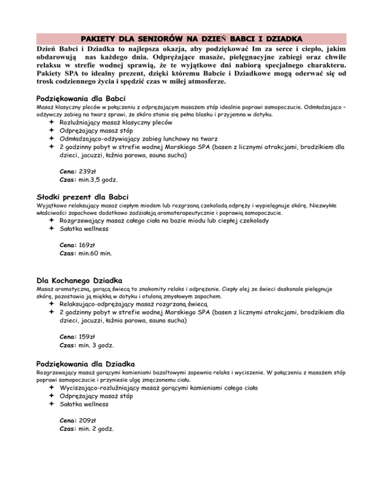 PAKIETY DLA SENIORÓW NA DZIEŃ BABCI I DZIADKA Dzień Babci i Dziadka to najlepsza okazja, aby podziękować Im za serce i ciepło, jakim obdarowują nas każdego dnia. Odprężające masaże, pielęgnacyjne zabiegi oraz chwile relaksu w strefie wodnej sprawią, że te wyjątkowe dni nabiorą specjalnego charakteru. Pakiety SPA to idealny prezent, dzięki któremu Babcie i Dziadkowe mogą oderwać się od trosk codziennego życia i spędzić czas w miłej atmosferze. Podziękowania dla Babci Masaż klasyczny pleców w połączeniu z odprężającym masażem stóp idealnie poprawi samopoczucie. Odmładzająco – odżywczy zabieg na twarz sprawi, że skóra stanie się pełna blasku i przyjemna w dotyku. Rozluźniający masaż klasyczny pleców Odprężający masaż stóp Odmładzająco-odżywiający zabieg lunchowy na twarz 2 godzinny pobyt w strefie wodnej Morskiego SPA (basen z licznymi atrakcjami, brodzikiem dla dzieci, jacuzzi, łaźnia parowa, sauna sucha) Cena: 239zł Czas: min.3,5 godz. Słodki prezent dla Babci Wyjątkowo relaksujący masaż ciepłym miodem lub rozgrzaną czekoladą odpręży i wypielęgnuje skórę. Niezwykłe właściwości zapachowe dodatkowo zadziałają aromaterapeutycznie i poprawią samopoczucie. Rozgrzewający masaż całego ciała na bazie miodu lub ciepłej czekolady Sałatka wellness Cena: 169zł Czas: min.60 min. Dla Kochanego Dziadka Masaż aromatyczną, gorącą świecą to znakomity relaks i odprężenie. Ciepły olej ze świeci doskonale pielęgnuje skórę, pozostawia ją miękką w dotyku i otuloną zmysłowym zapachem. Relaksująco-odprężający masaż rozgrzaną świecą 2 godzinny pobyt w strefie wodnej Morskiego SPA (basen z licznymi atrakcjami, brodzikiem dla dzieci, jacuzzi, łaźnia parowa, sauna sucha) Cena: 159zł Czas: min. 3 godz. Podziękowania dla Dziadka Rozgrzewający masaż gorącymi kamieniami bazaltowymi zapewnia relaks i wyciszenie. W połączeniu z masażem stóp poprawi samopoczucie i przyniesie ulgę zmęczonemu ciału. Wyciszająco-rozluźniający masaż gorącymi kamieniami całego ciała Odprężający masaż stóp Sałatka wellness Cena: 209zł Czas: min. 2 godz. Kochanym Dziadkom – pakiet dla Babci i Dziadka Zabieg oczyszczający z peelingiem kawitacyjnymdoskonale wygładza i nawilża, pozostawiając skórę odmłodzoną, odświeżoną i zregenerowaną. Rytuał Skarby Oceanów jednocześnie energetyzuje, przynosi ulgę zmęczonemu ciału i wzmacnia skórę. Kojąco – nawilżający zabieg aloesowy nawilży, wygładzi i ujędrni skórę, zadziała przeciwobrzękowo i antycellulitowo. 2 noclegi dla dwóch osób w pokoju de lux ze śniadaniem Menu wellness dla dwóch osób Zabiegi SPA: Głęboko oczyszczający zabieg na twarz z peelingiem kawitacyjnymdla dwojga Energetyzująco-wzmacniający zabieg na ciałoSkarby Oceanów Kojąco-nawilżający zabieg aloesowy na ciało 2 godzinny pobytw strefie wodnejMorskiego SPA (basen z licznymi atrakcjami, brodzikiem dla dzieci, jacuzzi, łaźnia parowa, sauna sucha) Codzienny nieograniczony pobyt w Sali fitness Cena:979 zł Czas: min. 5 godz.