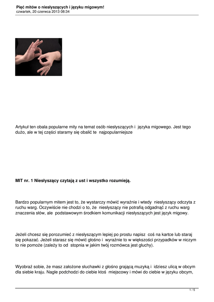 Pięć mitów o niesłyszących i języku migowym! czwartek, 20 czerwca 2013 08:34 Artykuł ten obala popularne mity na temat osób niesłyszących i języka migowego. Jest tego dużo, ale w tej części staramy się obalić te najpopularniejsze MIT nr. 1 Niesłyszący czytają z ust i wszystko rozumieją. Bardzo popularnym mitem jest to, że wystarczy mówić wyraźnie i wtedy niesłyszący odczyta z ruchu warg. Oczywiście nie chodzi o to, że niesłyszący nie potrafią odgadnąć z ruchu warg znaczenia słów, ale podstawowym środkiem komunikacji niesłyszących jest język migowy. Jeżeli chcesz się porozumieć z niesłyszącym lepiej po prostu napisz coś na kartce lub staraj się pokazać. Jeżeli starasz się mówić głośno i wyraźnie to w większości przypadków w niczym to nie pomoże (zależy to od stopnia w jakim twój rozmówca jest głuchy). Wyobraź sobie, że masz założone słuchawki z głośno grającą muzyką i idziesz ulicą w obcym dla siebie kraju. Nagle podchodzi do ciebie ktoś miejscowy i mówi do ciebie w języku obcym, 1/5 Pięć mitów o niesłyszących i języku migowym! czwartek, 20 czerwca 2013 08:34 który znasz słabo lub w ogóle? Jak myślisz jaki procent zrozumiesz? Nawet jeśli znasz ten język będzie ci trudno zrozumieć całe zdania. A co powiedzieć, jeśli ten język jest zupełnie obcy? Czy to, że Twój rozmówca rusza ustami pomoże Ci w jakikolwiek sposób? Nie, ponieważ nie znasz słów które wypowiada. Podobna sytuacja jest z osobami niesłyszącymi. Język którym się posługują to język migowy, różni się on od języka polskiego nie tylko słowami, ale i gramatyką. Język polski jest dla niesłyszących językiem w dużej mierze obcym. Są oczywiście w stanie nauczyć się rozpoznawania słów języka polskiego, ale nie zapewni to komunikacji z nimi. MIT nr. 2 Wystarczy nauczyć się alfabetu, żeby porozumieć się z niesłyszącym. Kolejny mit dotyczący języka migowego oraz niesłyszących. Nie jest to prawdą ponieważ język migowy składa się nie ze słów a ze znaków, które z kolei określają rzeczy, pojęcia i zjawiska a nie słowa. Sama znajomość liter nie zapewni więc poprawnej komunikacji. Załóżmy, że uczysz się języka niemieckiego. Znasz już podstawowe słowa i zwroty. Jeżeli w trakcie rozmowy usłyszysz słowo umweltverschmutzung nie jesteś w stanie zrozumieć tego słowa, ponieważ go nie znasz. Dlatego też przeliterowanie również w niczym nie pomożesz. Podobnie w języku migowym przeliterowanie słowa nefrolog nie pomoże twojemu rozmówcy jeśli wcześniej nie poznał znaczenia tego słowa. Zamiast tego trzeba byłoby opisać w języku migowym, czym taki lekarz się zajmuje. MIT nr. 3 Język migowy to język polski, tylko że wyrażony za pomocą znaków. Nieprawda. Język migowy oczywiście można przełożyć na język polski, ale nie oznacza to, że osoba niesłysząca myśli w języku polskim oraz, że używanie języka polskiego jest dla niej naturalne. 2/5 Pięć mitów o niesłyszących i języku migowym! czwartek, 20 czerwca 2013 08:34 Taki sposób myślenia doprowadził między innymi do utworzenia systemowego języka migowego, lub jak kto woli - języka miganego. Na czym to polega? Polega to na miganiu treści korzystając z polskiej gramatyki a używając słów języka migowego (oczywiście to mocne uogólnienie, ale w skrócie to sprowadza się to do tego). Thank you from the mountain (Dziękuję z góry), I will talk without the garden (Będę mówił bez ogródek). Jeśli znasz język angielski to z pewnością śmieszą cię te przykłady. Oba zdania zostały zbudowane na bazie polskich idiomów, ale z wykorzystaniem słów języka angielskiego. Naturalnie rozmówca nie zrozumie o co nam chodziło, bowiem thank you from the mountain bę dzie przez niego zrozumiane tak jak „dziękuję z wierzchołka góry” np. Mount Everest... Natomiast I will talk without the garden - „ będę mówić bez ogrodu”. W żadnym przypadku nie zostanie zrozumiane to poprawnie. Do tego prowadzi używanie słów języka angielskiego do formułowania myśli w języku polskim. Podobnie jest z językiem migowym. Zamiganie zdania „kot pije mleko” używając dla słowa pije słownikowego słowa pić prowadzi do efektu komicznego, jakoby kot pił ze szklanki. Gorszą sprawą jest zamiganie zdania „biegli sądowi zadecydowali” korzystając ze znaku biec w odniesieniu do biegłych powoduje to, że niesłyszący zrozumie, że ktoś biegł w sądzie. Dodatkowo w języku migowym kontekst inaczej wpływa na znaki. W języku polskim słowo zame k jest jednym słowem i w zależności od kontekstu przybiera inne znaczenie. W przypadku języka migowego istnieją różne znaki na słowo zamek (inny dla zamka w drzwiach, inny dla zamka w spodniach, inny na określenie budynku). Co za tym idzie użycie znaku zamek dotyczącego zamku w spodniach nie może być użyte w zdaniu „zepsuł mi się zamek centralny”. Gramatyka naturalnego języka migowego również jest inna i nie ma sensu formułować myśli korzystając z zasad gramatyki języka polskiego. 3/5 Pięć mitów o niesłyszących i języku migowym! czwartek, 20 czerwca 2013 08:34 MIT nr. 4 Komunikacja w języku migowym jest ograniczona. Przykrym mitem dotyczącym języka migowego jest pogląd, że język migowy jest uboższy niż język werbalny. Jest to nieprawdziwa opinia ponieważ w języku migowym możliwość przekazu jest nieograniczona. Jeżeli ktoś nie potrafi czegoś przekazać to znaczy, że musi mieć lepszy kontakt z niesłyszącymi i nauczyć się tego języka lepiej. Język migowy posługuje się obrazami. Dlatego jeżeli nie ma znaków określających pewne działania lub zjawiska to mimo tego można je pokazać. Na przykład zdanie: zamaszystym ruchem ściął drzewo, można przekazać z ekspresją, nawet jeśli nie znajdziemy odpowiedniego znaku na słowo zamaszysty. Kiedy czytasz książkę w twojej głowie buduje się