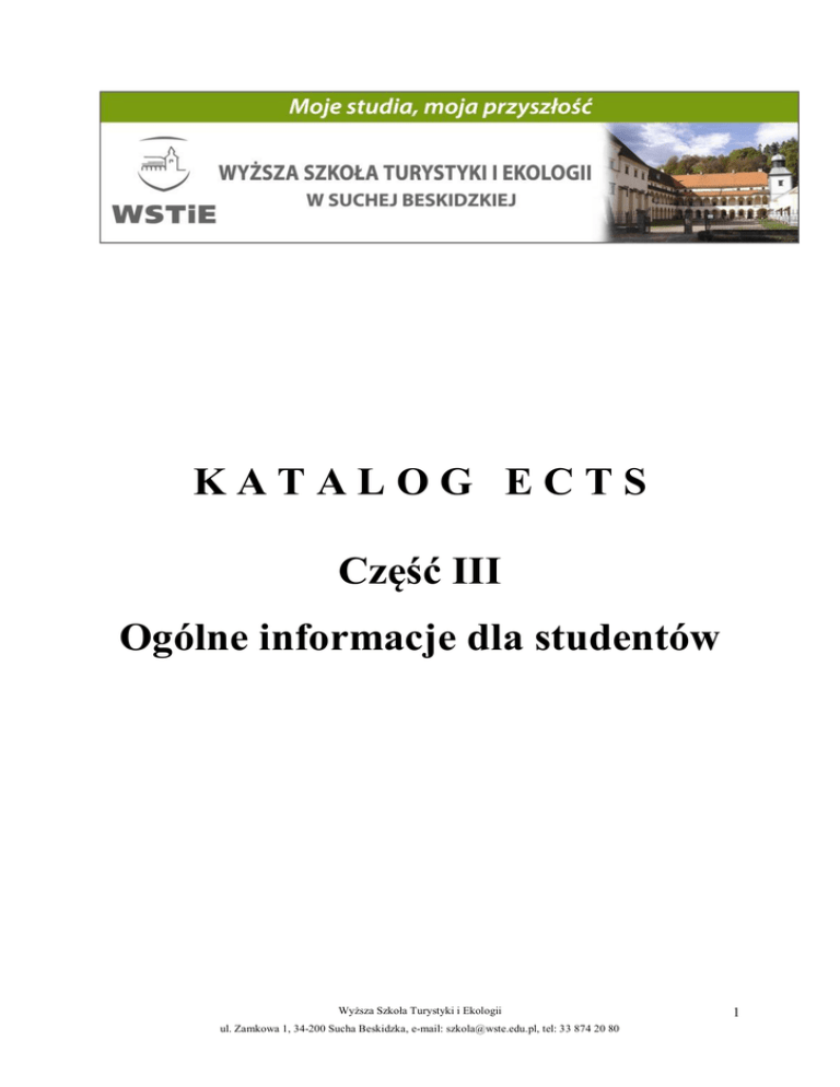 KATALOG ECTS Część III Ogólne informacje dla studentów Wyższa Szkoła Turystyki i Ekologii ul. Zamkowa 1, 34-200 Sucha Beskidzka, e-mail: [email protected], tel: 33 874 20 80 1 III. 1. Koszty utrzymania Koszt zakwaterowania i posiłków: zakwaterowanie w akademiku - 210/miesiąc kwatera prywatna - 200-350 zł/miesiąc obiad w stołówce studenckiej - 8 zł Obiad na mieście - 15-25 zł śniadanie i kolacja (jeśli we własnym zakresie) - 10-15 zł Ceny żywności mogą się różnić w zależności od sklepu oraz pory roku. Większość sklepów otwarta jest w godzinach 7.00-18.00 od poniedziałku do piątku i 8.00-14.00 w soboty. Niektóre sklepy otwarte są również w niedzielę i 24 godziny na dobę. III. 2. Zakwaterowanie Wyższa Szkoła Turystyki i Ekologii oferuje studentom zakwaterowanie w akademiku. Do dyspozycji jest 60 miejsc. Pokoje wyposażone są w meble oraz pościel, stolik i krzesła. Akademiki dysponują pokojami dwuosobowymi z jedną wspólną kuchnią, łazienką i WC na piętrze Cena jednego miejsca to około 210 zł. miesięcznie. Utrzymanie czystości w pokojach należy do studentów. III. 3. Posiłki Stołówka studencka znajdująca się przy ul. Spółdzielców 1 i jest dostępna dla wszystkich studentów WSTiE. Oferuje wyśmienite, domowe posiłki po bardzo rozsądnych cenach. Posiłek dwudaniowy kosztuje 8 zł. W pobliżu Uczelni działają również restauracje i bary z tanimi daniami, a także oferujące kuchnię chińską i włoską. Wyższa Szkoła Turystyki i Ekologii ul. Zamkowa 1, 34-200 Sucha Beskidzka, e-mail: [email protected], tel: 33 874 20 80 2 III. 4. Opieka zdrowotna Wszyscy zarejestrowani studenci i pracownicy WSTiE posiadają prawo do bezpłatnej opieki zdrowotnej oraz są uprawnieni do zniżek na zakup leków przepisanych przez lekarza (na receptę). Państwowe Zakłady Opieki Zdrowotnej zapewniają bezpłatną opiekę zdrowotną w szerokim zakresie. Jest ona bezpłatna dla wszystkich posiadających ważne ubezpieczenie społeczne (zarejestrowanych w Narodowym Funduszu Zdrowia). Istnieje możliwość korzystania również z prywatnych gabinetów i laboratoriów. Przepisane przez lekarza lekarstwa można wykupić w aptekach, otwartych w normalnych godzinach pracy (niektóre apteki pełnią całodobowe dyżury, także w dni świąteczne). W przypadkach nagłych opieka zdrowotna jest bezpłatna dla wszystkich, bez względu na status i okres pobytu w Polsce. W razie nagłego wypadku lub zachorowania należy dzwonić pod numer 112. ZAKŁADY OPIEKI ZDROWOTNEJ Szpital Rejonowy ul. Szpitalna 22 telefon: 033 872 31 00 - centrala 33 872 33 16 - sekretariat fax 033 872 31 01 www: http://www.zozsuchabeskidzka.pl// e-mail: [email protected]/ Wyższa Szkoła Turystyki i Ekologii ul. Zamkowa 1, 34-200 Sucha Beskidzka, e-mail: [email protected], tel: 33 874 20 80 3 Miejska Przychodnia Zdrowia ul. Handlowa 1 33 874 - 22 - 60 Niepubliczny Zakład Opieki Zdrowotnej "MEDYK" s.c ul. Mickiewicza 56 33 874 - 18 - 33 III. 5. Informacje praktyczne W Suchej Beskidzkiej znajdują się : - Powiatowy Szpital Rejonowy (II miejsce w Małopolsce w rankingu „Rzeczpospolitej” i wysokie 25 miejsce w kraju!) - Komenda Straży Pożarnej - Powiatowa Komenda Policji - 2 Urzędy pocztowe - Powiatowa Stacja Sanitarno-Epidemiologiczna - 5 Banków (Alior Bank, Pekao SA, Pekao BP, Bank BGŻ, Bank Spółdzielczy) - Sąd Rejonowy - 8 bankomatów - kluby studenckie - centrum rekreacyjno-sportowe - stadion sportowy - lodowisko - fitness cluby - siłownia - szlaki turystyczne wychodzące spod uczelni (Magurka, Jasień, Mioduszyna, Zawoja) III. 6. Udogodnienia dla studentów o specjalnych potrzebach Uczelnia jest gotowa zapewnić studentom niepełnosprawnym odpowiednie warunki studiowania. W celu uzyskania informacji należy skontaktować się z Dziekanatem WSTiE mieszczącym się w siedzibie Uczelni, tel, +48 338742080 Wyższa Szkoła Turystyki i Ekologii ul. Zamkowa 1, 34-200 Sucha Beskidzka, e-mail: [email protected], tel: 33 874 20 80 4 III. 7. Ubezpieczenie Studenci WSTiE mogą się ubezpieczać od następstw nieszczęśliwych wypadków. Informacji związanych z ubezpieczeniem udziela Dziekanat - +48 338742080 III. 8. Pomoc materialna dla studentów Studenci mogą ubiegać się o następujące świadczenia pomocy materialnej: 1/ stypendium socjalne; 2/ stypendium socjalne zwiększone w związku z zamieszkaniem w domu studenckim lub obiekcie innym niż dom studencki; 3/ stypendium specjalne dla osób niepełnosprawnych; 4/ stypendium rektora dla najlepszych studentów; 5/ zapomogę. Studenci szczególnie wyróżniający się w nauce mogą ubiegać się o stypendium ministra za wybitne osiągnięcia, zgodnie z Rozporządzeniem MNiSW z dnia 1 września 2011r. (Dz. U. 2011 Nr 214 poz.1270) w sprawie szczegółowych warunków i trybu przyznawania oraz wypłacania studentom stypendiów ministra za wybitne osiągnięcia. Zasady przyznawania pomocy materialnej określa regulamin i zarządzenia Rektora na dany rok akademicki. Wszystkie stypendia przyznawane są na wniosek studenta, poza stypendium rektora dla najlepszych studentów, które jest przyznawane automatycznie tym studentom, których uprawnia do tego średnia ocen. Stypendium specjalne dla osób niepełnosprawnych otrzymują studenci niepełnosprawni, którzy zgłosili ten fakt Uczelni oraz przedstawili zaświadczenie o niepełnosprawności. Stypendia rektora dla najlepszych studentów Najlepszym studentom przyznawane są stypendia naukowe będące nagrodą za wyniki w nauce osiągnięte w danym roku akademickim. Kryterium przyznania stypendium jest Wyższa Szkoła Turystyki i Ekologii ul. Zamkowa 1, 34-200 Sucha Beskidzka, e-mail: [email protected], tel: 33 874 20 80 5 średnia ocen uzyskana z przedmiotów kończących się egzaminem lub zaliczeniem z oceną. Szczegółowe kryteria na każdy rok akademicki podawane są w zarządzeniu rektora WSTiE. Stypendia socjalne Pomoc socjalna dla studentów została rozszerzona równie