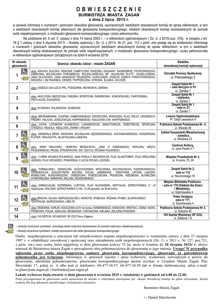 OBWIESZCZENIE BURMISTRZA MIASTA ŻAGAŃ z dnia 2 lipca 2015 r. w sprawie informacji o numerach i granicach obwodów głosowania, wyznaczonych siedzibach obwodowych komisji do spraw referendum, w tym o siedzibach obwodowych komisji właściwych dla głosowania korespondencyjnego, lokalach obwodowych komisji dostosowanych do potrzeb osób niepełnosprawnych, o możliwości głosowania korespondencyjnego i przez pełnomocnika. Na podstawie art. 6 ust. 5 ustawy z dnia 14 marca 2003 r. – o referendum ogólnokrajowym ( Dz. U. z 2015r.poz. 318), w związku z art. 16 § 1 ustawy z dnia 5 stycznia 2011r – Kodeks wyborczy ( Dz. U. z 2011r. Nr 21, poz. 112 z późn. zm) podaje się do wiadomości informację o numerach i granicach obwodów głosowania, wyznaczonych siedzibach obwodowych komisji do spraw referendum, w tym o siedzibach obwodowych komisji dostosowanych do potrzeb osób niepełnosprawnych, o możliwości głosowania korespondencyjnego i przez pełnomocnika w referendum ogólnokrajowym zarządzonym na dzień 6 września 2015r. Nr obwodu głosowania Siedziba obwodowej komisji wyborczej Granica obwodu /ulice/ - miasto ŻAGAŃ 1 ulice: ASNYKA, BUCZKA, DĘBOWA, FABRYCZNA, KSIĘŻNEJ ŻAGANNY, NADBOBRZE, PSTROWSKIEGO, ZAMKOWA, BOLESŁAWA CHROBREGO, BOLESŁAWIECKA, BP. WILHELMA PLUTY, JAGIELLOŃSKA, JANA DŁUGOSZA, JANA IGNACEGO FELBIGERA, KOŚCIUSZKI, KSIĘCIA JÓZEFA PONIATOWSKIEGO, MIESZKA I, MŁYNARSKA, OKRZEI, POPRZECZNA, STROMA, ŚLĄSKA, ZACISZE 2 ulice: OSIEDLE XXX-LECIA PRL, PODGÓRNA, REYMONTA, ŻARSKA 3 ulice: AKACJOWA, BRZOZOWA, FINDERA, SPORTOWA, ŚWIERKOWA , KONOPNICKIEJ, PIASTOWSKA, PRZYJACIÓŁ ŻOŁNIERZA 4 ulice: KLONOWA, PUŁASKIEGO, SOSNOWA 5 ulice: BROWARNIANA, CHOPINA, DĄBROWSKIEGO, DWORCOWA, MONIUSZKI, PLAC ORLĄT LWOWSKICH, 6 ulice: CICHA, LOTNIKÓW ALIANCKICH, ŁUKASIEWICZA, NARUTOWICZA, ROBOTNICZA, SPOKOJNA, STASZICA, WESOŁA, WĘGLOWA, ŻWIRKI I WIGURY 7 ulice: GENERAŁA BEMA, MIODOWA, BOLESŁAWA KĘDZIERZAWEGO, KOCHANOWSKIEGO, KOSZAROWA, PLATER, TRAUGUTTA, WŁADYSŁAWA ŁOKIETKA 8 ulice: ARMII KRAJOWEJ, HENRYKA BRODATEGO, JANA III SOBIESKIEGO, KEPLERA, KRĘTA, PIŁSUDSKIEGO, PRUSA, STRUMYKOWA, ŚW. CECYLII, WOJSKA POLSKIEGO 9 ulice: II ARMII WOJSKA POLSKIEGO, JANA PAWŁA II, MICKIEWICZA, PLAC KLASZTORNY, PLAC KRÓLOWEJ JADWIGI, PLAC WOLNOŚCI, POMORSKA, X LECIA POLSKI LUDOWEJ Miejskie Przedszkole Nr 3, ul. X-Lecia PL 24 10 ulice: FORNALSKIEJ, GRANICZNA, KOŻUCHOWSKA, MYŚLIWSKA, NOCZNICKIEGO, PADEREWSKIEGO, SIENKIEWICZA, AUGUSTYNÓW, BOCZNA, DOLNA, JAŚMINOWA, KWIATOWA, LIPOWA, ŁĄKOWA, MORELOWA, NOWOGRÓDZKA, OGRODOWA, PORZECZKOWA, PÓŁNOCNA, RZEŹNICKA, SŁONECZNA, STAROWIEJSKA, WIŚNIOWA, ZIELONA, ŻÓŁKIEWSKIEGO Zespół Szkół Nr 2, sala nr 112 ul. Nocznickiego 18 11 ulice: GIMNAZJALNA, KOPERNIKA, ŁUŻYCKA, PLAC SŁOWIAŃSKI, SZPITALNA, SZPROTAWSKA 11 -37 nieparzyste, WAŁOWA, SZPROTAWSKA 2-10A, 12-26 parzyste, od 39 do końca 12 ulice: BRACKA, DŁUGA, NIEPODLEGŁOŚCI, NOWOTKI, RYBACKA, RÓŻANA, RYNEK, SŁOWACKIEGO, TEATRALNA, WARSZAWSKA, LIBELTA 13 ulice: DRZEWNA, KARLIKI, KOLEJOWA od 91 do końca, KONARSKIEGO, KOŃCOWA, KRÓTKA), LEŚNA, NOWA, PIASKOWA, POLNA, SZKOLNA, ŚRODKOWA, TARTAKOWA, WIEJSKA, ŻELAZNA,POGODNA 14 ulice: 105 SZPITAL WOJSKOWY SP ZOZ Filia w Żaganiu Ośrodek Pomocy Społecznej, ul. Pstrowskiego 3 Zespół Szkół Nr 1 – sala lekcyjna nr 01 ul. Żarska 1 FREDRY, HALICKA, JOSELEWICZA, KARPIŃSKIEGO, KOLEJOWA 2-89, WARYŃSKIEGO Zespół Szkół Nr 1 - stołówka, ul. Żarska 1 Zespół Szkół Nr 1 - sala nr 27, ul. Żarska 1 Liceum Ogólnokształcące, Pl. Orląt Lwowskich 4 Publiczna Szkoła Podstawowa Nr 4, ul. Wesoła 38 Zakład Gospodarki Mieszkaniowej - świetlica, ul. Miodowa 23 Centrum Kultury, ul. Jana Pawła II 7 Miejska Biblioteka Publiczna - sala nr 176 (Oddział dla Dzieci i Młodzieży), ul. Szprotawska 4 Pałac Książęcy sala nr 171, ul. Szprotawska 4 Publiczna Szkoła Podstawowa Nr 3, ul. Szkolna 42 105 Szpital Wojskowy SP ZOZ, ul. Żelazna 1 A - obwody oznaczone symbolem, posiadają lokale wyborcze dostosowane do potrzeb wyborców niepełnosprawnych. - obwody oznaczone symbolem, zostały wyznaczone dla celów głosowania korespondencyjnego Osoba niepełnosprawna o znacznym lub umiarkowanym stopniu niepełnosprawności w rozumieniu ustawy z dnia 27 sierpnia 1997 r. o rehabilitacji zawodowej i społecznej oraz zatrudnianiu osób niepełnosprawnych (Dz. U. z 2011 r. Nr 127, poz.721, z późn. zm.) oraz osoba, która najpóźniej w dniu głosowania kończy 75 lat, może w terminie do 28 sierpnia 2015r r. złożyć wniosek do Burmistrza miasta Żagań o sporządzenie aktu pełnomocnictwa do głosowania w jego imieniu. Uwaga! W przypadku zgłoszenia przez osobę niepełnosprawną zamiaru głosowania korespondencyjnego, głosowanie za pośrednictwem pełnomocnika jest wyłączone. Informacje w sprawach rejestru i spisu wyborców, wydawanie zaświadczeń o prawie do głosowania, udzielenia pełnomocnictwa, głosowania korespondencyjnego można uzyskać w Urzędzie Miasta Żagań, Plac Słowiański 17, pokój nr 6 albo pod nr telefonów: 68-477-10-57; 68-477-10-58 lub w formie elektronicznej, adres e-mail: [email protected]; [email protected]. Lokale wyborcze będą otwarte w dniu głosowania 6 września 2015 r. (niedziela) w godzinach od 6.00 do 22.00. Przed przystąpieniem do głosowania osoba uprawniona do udziału w referendum obowiązana jest okazać obwodowej komisji do spraw referendum dowód osobisty lub inny dokument umożliwiający stwierdzenie tożsamości. Burmistrz Miasta Żagań /-/ Daniel Marchewka
