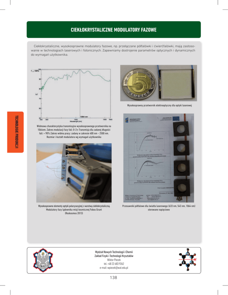 CIEKŁOKRYSTALICZNE MODULATORY FAZOWE Ciekłokrystaliczne, wysokosprawne modulatory fazowe, np. przełączane półfalówki i ćwierćfalówki, mają zastosowanie w technologiach laserowych i fotonicznych. Zapewniamy dostrojenie parametrów optycznych i dynamicznych do wymagań użytkownika. Wysokosprawny przetwornik elektrooptyczny dla optyki laserowej TECHNOLOGIE PRODUKCJI Widmowa charakterystyka transmisyjna wysokosprawnego przetwornika na 1064nm. Zakres modulacji fazy fali; 0-2π Transmisja dla zadanej długości fali: > 90% Zakres widma pracy: zadany w zakresie 400 nm – 2500 nm. Rozmiar i kształt modulatora wg wymagań użytkownika Wysokosprawne elementy optyki polaryzacyjnej z warstwą ciekłokrystaliczną. Modulatory fazy lądownika misji kosmicznej Fobos Grunt (Roskosmos 2013) Przesuwniki półfalowe dla światła laserowego (633 nm, 543 nm, 1064 nm) sterowane napięciowo Wydział Nowych Technologii i Chemii Zakład Fizyki i Technologii Kryształów Wiktor Piecek tel. +48 22 683 9262 e-mail: [email protected] 138