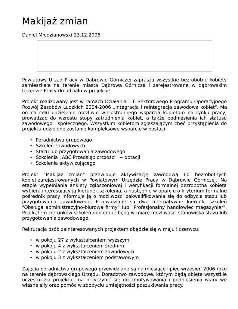 Makijaż zmian Daniel Młodzianowski 23.12.2006 Powiatowy Urząd Pracy w Dąbrowie Górniczej zaprasza wszystkie bezrobotne kobiety zamieszkałe na terenie miasta Dąbrowa Górnicza i zarejestrowane w dąbrowskim Urzędzie Pracy do udziału w projekcie. Projekt realizowany jest w ramach Działania 1.6 Sektorowego Programu Operacyjnego Rozwój Zasobów Ludzkich 2004-2006 „Integracja i reintegracja zawodowa kobiet". Ma on na celu udzielenie możliwie wielostronnego wsparcia kobietom na rynku pracy, prowadząc do wzrostu stopy zatrudnienia kobiet, a także podniesienia ich statusu zawodowego i społecznego. Wszystkim kobietom zgłaszającym chęć przystąpienia do projektu udzielone zostanie kompleksowe wsparcie w postaci: • • • • • Poradnictwa grupowego Szkoleń zawodowych Stażu lub przygotowania zawodowego Szkolenia „ABC Przedsiębiorczości" + dotacji Szkolenia aktywizującego Projekt "Makijaż zmian" przewiduje aktywizację zawodową 60 bezrobotnych kobiet zarejestrowanych w Powiatowym Urzędzie Pracy w Dąbrowie Górniczej. Na etapie wypełniania ankiety zgłoszeniowej i weryfikacji formalnej bezrobotna kobieta wybiera interesujący ją kierunek szkolenia, a następnie w oparciu o kryterium formalne pośrednik pracy informuje ją o możliwości zakwalifikowania się do odbycia stażu lub przygotowania zawodowego. Przewidziane są dwa alternatywne kierunki szkoleń "Obsługa administracyjno-biurowa firmy" lub "Profesjonalny handlowiec magazynier". Pod kątem kierunków szkoleń dobierane będą w miarę możliwości stanowiska stażu lub przygotowania zawodowego. Rekrutacja osób zainteresowanych projektem obędzie się w maju i czerwcu: • • • • w w w w pokoju pokoju pokoju pokoju 27 z wykształceniem wyższym 4 z wykształceniem średnim 2 z wykształceniem zawodowym 3 z wykształceniem podstawowym Zajęcia poradnictwa grupowego przewidziane są na miesiące lipiec-wrzesień 2006 roku na terenie dąbrowskiego Urzędu. Doradztwo zawodowe, którym będą objęte wszystkie uczestniczki projektu, ma przyczynić się do zmotywowania i podniesienia wiary we własne siły oraz pomóc w zdobyciu umiejętności poszukiwania pracy. Po zajęciach poradnictwa grupowego kobiety będą uczestniczyć w jednym z trzech bloków wsparcia: 1. szkolenie „ABC Przedsiębiorczości" + dotacja – blok ten skierowany jest do kobiet zainteresowanych samozatrudnieniem i poszerzeniem wiedzy na temat otwierania i prowadzenia własnej firmy. Przewiduje się przygotowanie 10 kobiet do podjęcia własnej działalności gospodarczej poprzez uczestnictwo w kompleksowym szkoleniu „ABC Przedsiębiorczości", fakultatywne doradztwo zawodowe oraz przyznanie jednorazowych środków na podjęcie działalności gospodarczej dla 5 kobiet. Dodatkowe informacje można uzyskać w pokoju 19. 2. szkolenie zawodowe + staż zawodowy – blok ten skierowany jest do 30 młodych bezrobotnych kobiet ( do 25 roku życia lub do 27 roku życia w okresie do 12 miesięcy od daty uzyskania dyplomu ukończenia szkoły wyższej ). Realizacja tej formy wsparcia umożliwi młodym bezrobotnym kobietom uzupełnić dotychczasowe kwalifikacje zawodowe poprzez uczestnictwo w szkoleniu zawodowym, a następnie dzięki odbyciu 6-cio miesięcznego stażu uzyskać pierwsze doświadczenia zawodowe. 3. szkolenie zawodowe + przygotowanie zawodowe – blok ten adresowany jest do 20 kobiet powracających na rynek pracy po dłuższej nieobecności spowodowanej m.in. macierzyństwem. Grupę beneficjentów ostatecznych mają stanowić kobiety długotrwale bezrobotne, kobiety powyżej 50 roku życia, kobiety bez kwalifikacji zawodowych, kobiety samotnie wychowujące co najmniej jedno dziecko do 7 roku życia, kobiety niepełnosprawne. Powyższe formy wsparcia pozwolą zaktualizować i wzbogacić dotychczasowe kwalifikacje oraz odbudować nawyk pracy i zdobyć nowe doświadczenia zawodowe. Program szkolenia "Profesjonalny handlowiec – magazynier" (200 h) 1. Podstawy obsługi komputera + program SUBIEKT (30 h) 2. Obsługa kasy fiskalnej (15 h) 3. HACCP (10 h) 4. Funkcjonowanie magazynu + program SYMFONIA-HANDEL (50 h) 5. Podstawy rachunkowości (15 h) 6. Kontrola weryfikacji środków pieniężnych (5 h) 7. Dekorowanie sklepu i reklama (10 h) 8. Obsługa dźwigu towarowego z obsługą (25 h) + do wyboru: 9. Marketing i nowoczesne techniki sprzedaży (40 h) lub 10.Kierowca wózków jezdniowych z napędem silnikowym (40 h) Program szkolenia "Obsługa administracyjno – biurowa firmy" (200 h) 1. Podstawy obsługi komputera (20 h) 2. Płatnik (10 h) 3. Obsługa sekretariatu (50 h) 4. Kadry i płace (70 h) 5. Księgowość (50 h) Szkolenia odbędą się w miesiącach październik-listopad 2006 Staże i przygotowanie zawodowe zaplanowane zostały na miesiące grudzień 2006 – maj 2007 roku Elementem kończącym uczestnictwo w projekcie będą zajęcia aktywizujące w zakresie poruszania się na rynku pracy, które będą realizowane w miesiącach lipiec-sierpień 2007 roku. Przebieg Realizacji Projektu "Makijaż zmian" Zakończył się pierwszy etap współfinansowanego przez Europejski Fundusz Społeczny programu „Makijaż zmian". W ciągu czterech tygodni sześćdziesiąt kobiet na warsztatach aktywizacyjnych uzyskało wiedzę o sobie, o rynku pracy i regułach rządzących tym rynkiem. Uczestniczki zdobyły wiarę we własne siły, umiejętność myślenia o sobie w kategoriach sukcesów i możliwości oraz przełamały strach przed spotkaniem z pracodawcą. Warsztaty aktywizacyjne zostały przygotowane i przeprowadzone przez doradców zawodowych Powiatowego Urzędu Pracy. Zajęcia służyły określeniu umiejętności i predyspozycji zawodowych uczestniczek, a ponadto wzmocnieniu w nich poczucia własnej wartości. Pracując m.in. nad rozwojem świadomości mocnych i słabych stron kursantek, prowadzący starali się podnieść poziom samoakceptacji pań oraz ich motywacji wewnętrznej. Na warsztatach poruszano zagadnienia dotyczące 