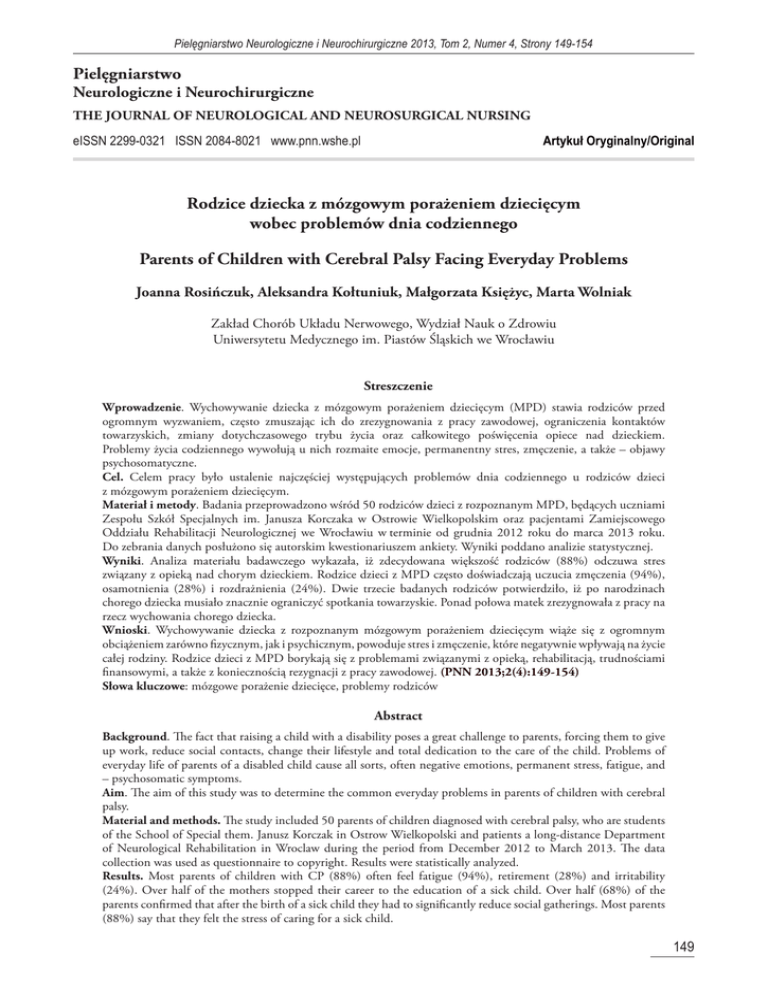 Pielęgniarstwo Neurologiczne i Neurochirurgiczne 2013, Tom 2, Numer 4, Strony 149-154 Pielęgniarstwo Neurologiczne i Neurochirurgiczne THE JOURNAL OF NEUROLOGICAL AND NEUROSURGICAL NURSING Artykuł Oryginalny/Original eISSN 2299-0321 ISSN 2084-8021 www.pnn.wshe.pl Rodzice dziecka z mózgowym porażeniem dziecięcym wobec problemów dnia codziennego Parents of Children with Cerebral Palsy Facing Everyday Problems Joanna Rosińczuk, Aleksandra Kołtuniuk, Małgorzata Księżyc, Marta Wolniak Zakład Chorób Układu Nerwowego, Wydział Nauk o Zdrowiu Uniwersytetu Medycznego im. Piastów Śląskich we Wrocławiu Streszczenie Wprowadzenie. Wychowywanie dziecka z mózgowym porażeniem dziecięcym (MPD) stawia rodziców przed ogromnym wyzwaniem, często zmuszając ich do zrezygnowania z pracy zawodowej, ograniczenia kontaktów towarzyskich, zmiany dotychczasowego trybu życia oraz całkowitego poświęcenia opiece nad dzieckiem. Problemy życia codziennego wywołują u nich rozmaite emocje, permanentny stres, zmęczenie, a także – objawy psychosomatyczne. Cel. Celem pracy było ustalenie najczęściej występujących problemów dnia codziennego u rodziców dzieci z mózgowym porażeniem dziecięcym. Materiał i metody. Badania przeprowadzono wśród 50 rodziców dzieci z rozpoznanym MPD, będących uczniami Zespołu Szkół Specjalnych im. Janusza Korczaka w Ostrowie Wielkopolskim oraz pacjentami Zamiejscowego Oddziału Rehabilitacji Neurologicznej we Wrocławiu w terminie od grudnia 2012 roku do marca 2013 roku. Do zebrania danych posłużono się autorskim kwestionariuszem ankiety. Wyniki poddano analizie statystycznej. Wyniki. Analiza materiału badawczego wykazała, iż zdecydowana większość rodziców (88%) odczuwa stres związany z opieką nad chorym dzieckiem. Rodzice dzieci z MPD często doświadczają uczucia zmęczenia (94%), osamotnienia (28%) i rozdrażnienia (24%). Dwie trzecie badanych rodziców potwierdziło, iż po narodzinach chorego dziecka musiało znacznie ograniczyć spotkania towarzyskie. Ponad połowa matek zrezygnowała z pracy na rzecz wychowania chorego dziecka. Wnioski. Wychowywanie dziecka z rozpoznanym mózgowym porażeniem dziecięcym wiąże się z ogromnym obciążeniem zarówno fizycznym, jak i psychicznym, powoduje stres i zmęczenie, które negatywnie wpływają na życie całej rodziny. Rodzice dzieci z MPD borykają się z problemami związanymi z opieką, rehabilitacją, trudnościami finansowymi, a także z koniecznością rezygnacji z pracy zawodowej. (PNN 2013;2(4):149-154) Słowa kluczowe: mózgowe porażenie dziecięce, problemy rodziców Abstract Background. The fact that raising a child with a disability poses a great challenge to parents, forcing them to give up work, reduce social contacts, change their lifestyle and total dedication to the care of the child. Problems of everyday life of parents of a disabled child cause all sorts, often negative emotions, permanent stress, fatigue, and – psychosomatic symptoms. Aim. The aim of this study was to determine the common everyday problems in parents of children with cerebral palsy. Material and methods. The study included 50 parents of children diagnosed with cerebral palsy, who are students of the School of Special them. Janusz Korczak in Ostrow Wielkopolski and patients a long-distance Department of Neurological Rehabilitation in Wroclaw during the period from December 2012 to March 2013. The data collection was used as questionnaire to copyright. Results were statistically analyzed. Results. Most parents of children with CP (88%) often feel fatigue (94%), retirement (28%) and irritability (24%). Over half of the mothers stopped their career to the education of a sick child. Over half (68%) of the parents confirmed that after the birth of a sick child they had to significantly reduce social gatherings. Most parents (88%) say that they felt the stress of caring for a sick child. 149 Rosińczuk i wsp. / PNN 2013, Tom 2, Numer 4, Strony 149-154 Conclusions. Raising a child with a diagnosis of cerebral palsy is associated with a very high both physical and mental burden. The care of the child with cerebral palsy causes constant stress and fatigue, which negatively affect the lives of the entire family. Parents of children with CP face a number of everyday problems associated with the care, rehabilitation, financial difficulties, and the need to give up work. (PNN 2013;2(4):149-154) Key words: cerebral palsy, problems of parents Wprowadzenie Mózgowe porażenie dziecięce (MPD) to powstałe w czasie ciąży, porodu bądź w okresie okołoporodowym niepostępujące zaburzenia czynności ośrodkowego układu nerwowego [1]. Obejmuje ono zmieniające się wraz z wiekiem zaburzenia ruchu, postawy, zaburzenia napięcia mięśniowego i równowagi współistniejące z innymi objawami trwałego uszkodzenia mózgu (padaczka, upośledzenie umysłowe, zaburzenia mowy, wzroku, słuchu) [2]. Do objawów psychicznych należą zaburzenia emocjonalne, drażliwość, rozpraszalność uwagi, wzmożona pobudliwość psychoruchowa, bezsenność, różnego stopnia opóźnienie psychoruchowe [3]. Częstość występowania MPD oceniana jest na 1,5-2,5/1000 żywo urodzonych dzieci. Ryzyko zachorowania wzrasta, jeżeli podczas ciąży wystąpiły urazy wewnątrzmaciczne, zatrucia środkami chemicznymi (m.in. alkohol i narkotyki) lub infekcje (różyczka, toksoplazmoza oraz infekcje wirusowe – w tym także HIV) [1]. Przyjście na świat ciężko chorego dziecka powoduje ogromne zmiany w życiu rodziny. Mogą one obejmować różne sfery życia rodziny, wyzwalać w niej pozytywne i negatywne emocje, czynić ją wewnętrznie bardziej spójną i lepiej zorganizowaną lub osłabiać ją pod różnym względem i destabilizować [4,5]. Problemy, z którymi spotykają się rodzice dzieci ciężko i nieuleczalnie chorych, w tym dzieci z MPD podzielić możemy na kilka grup. Najczęściej są to [5]: • problemy natury psychologi