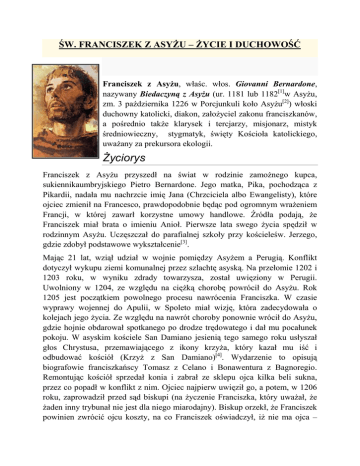 ŚW. FRANCISZEK Z ASYŻU – ŻYCIE I DUCHOWOŚĆ Franciszek z Asyżu, właśc. włos. Giovanni Bernardone, nazywany Biedaczyną z Asyżu (ur. 1181 lub 1182[1]w Asyżu, zm. 3 października 1226 w Porcjunkuli koło Asyżu[2]) włoski duchowny katolicki, diakon, założyciel zakonu franciszkanów, a pośrednio także klarysek i tercjarzy, misjonarz, mistyk średniowieczny, stygmatyk, święty Kościoła katolickiego, uważany za prekursora ekologii. Życiorys Franciszek z Asyżu przyszedł na świat w rodzinie zamożnego kupca, sukiennikaumbryjskiego Pietro Bernardone. Jego matka, Pika, pochodząca z Pikardii, nadała mu nachrzcie imię Jana (Chrzciciela albo Ewangelisty), które ojciec zmienił na Francesco, prawdopodobnie będąc pod ogromnym wrażeniem Francji, w której zawarł korzystne umowy handlowe. Źródła podają, że Franciszek miał brata o imieniu Anioł. Pierwsze lata swego życia spędził w rodzinnym Asyżu. Uczęszczał do parafialnej szkoły przy kościeleśw. Jerzego, gdzie zdobył podstawowe wykształcenie[3]. Mając 21 lat, wziął udział w wojnie pomiędzy Asyżem a Perugią. Konflikt dotyczył wykupu ziemi komunalnej przez szlachtę asyską. Na przełomie 1202 i 1203 roku, w wyniku zdrady towarzysza, został uwięziony w Perugii. Uwolniony w 1204, ze względu na ciężką chorobę powrócił do Asyżu. Rok 1205 jest początkiem powolnego procesu nawrócenia Franciszka. W czasie wyprawy wojennej do Apulii, w Spoleto miał wizję, która zadecydowała o kolejach jego życia. Ze względu na nawrót choroby ponownie wrócił do Asyżu, gdzie hojnie obdarował spotkanego po drodze trędowatego i dał mu pocałunek pokoju. W asyskim kościele San Damiano jesienią tego samego roku usłyszał głos Chrystusa, przemawiającego z ikony krzyża, który kazał mu iść i odbudować kościół (Krzyż z San Damiano)[4]. Wydarzenie to opisują biografowie franciszkańscy Tomasz z Celano i Bonawentura z Bagnoregio. Remontując kościół sprzedał konia i zabrał ze sklepu ojca kilka beli sukna, przez co popadł w konflikt z nim. Ojciec najpierw uwięził go, a potem, w 1206 roku, zaprowadził przed sąd biskupi (na życzenie Franciszka, który uważał, że żaden inny trybunał nie jest dla niego miarodajny). Biskup orzekł, że Franciszek powinien zwrócić ojcu koszty, na co Franciszek oświadczył, iż nie ma ojca – zdjął odzienie, zostając w samej włosiennicy, złożył je i razem z pieniędzmi oddał ojcu. Rozpoczął życie pokuty, m.in. asystując w leprozorium. W latach 1206-1208 odrestaurował podasyskie kaplice: San Damiano, San Pietro i kaplicę Matki BożejAnielskiej w Porcjunkuli pod Asyżem[5]. 24 lutego 1208 roku Franciszek, uderzony usłyszanymi w czasie Mszy św. słowami, dotyczącymi stylu życia apostolskiego, zdjął habit eremicki i zaczął nosić prostą brązową tunikę – strój uważany w ówczesnej Umbrii za typowo plebejski. Z bosymi stopami zaczął wzywać ludzi do czynienia pokuty. 16 kwietnia 1208 roku przyłączyli się do niego Bernard z Quintavalle (który spieniężył cały swój majątek, a pieniądze rozdał wdowom i sierotom) i kanonik Piotr z Cattani. W kilka dni później do grupki pierwszych franciszkanów dołączył brat Idzi z Asyżu. Minoryci zaczęli odbywać wyprawy misyjne (Marchia Ankońska, Poggio Bustone, Rieti, Florencja). Wiosną 1209 (w niektórych źródłach 1210) roku Franciszek poprosił w Rzymie o zatwierdzenie napisanej przez siebie Reguły. Papież Innocenty III, zgodnie z wcześniejszymi ustaleniami miał odmówić i wręczyć Franciszkowi napomnienie, ale, jak mówią podania, pod wpływem snu z poprzedniej nocy postanowił zatwierdzić regułę. W śnie tym papież Innocenty widział walące się mury bazyliki lateraneńskiej i obszarpanego młodzieńca, który w jego oczach urósł do olbrzyma i ocalił Lateran. We Franciszku Innocenty rozpoznał młodzieńca ze swego snu i zatwierdził franciszkański sposób życia, polecając braciom mniejszym głoszenie nawrócenia i pokuty. Wracając z Rzymu, Franciszek z pierwszymi towarzyszami zatrzymał się w Rivotorto, a następnie w Porcjunkuli pod Asyżem, która stała się kolebką franciszkanów. W niedzielę palmową w 1211 albo 1212 roku Franciszek przyjął w Porcjunkuli Klarę Ofreduccio, której pomógł w ucieczce z domu; wówczas ukonstytuował się Drugi Zakon – klaryski. Wokół Franciszka i jego braci zaczyna formować się grupa pokutników, która później da początek Trzeciemu Zakonowi. W następnych latach Franciszek informował osobiście papieża o stanie rozwoju założonej przez siebie wspólnoty franciszkańskiej, spotykając się w Rzymie z Jakubiną Settesoli. Szlachcic Orlando di Chiusi ofiarował franciszkanom na zamku Monte Feltro górę La Verna. W 1215 roku w czasie IV Soboru Laterańskiego, Franciszek spotkał Dominika Guzmana, założyciela zakonu dominikanów. 5 maja 1217 roku franciszkanie zgromadzili się w Porcjunkuli na kapitule generalnej. Zostały podjęte decyzje o misji pozaalpejskiej, do Ziemi Świętej i do Afryki. Franciszek na wyraźne życzenie kardynała Ugolina (późniejszego papieża Grzegorza IX), legata papieskiego dla Toskanii i Lombardii, zdecydował się pozostać we Włoszech. W 1219 roku Franciszek wyruszył na Bliski Wschód. W Egipcie spotkał się z sułtanemMelek el-Kamelem. Zaproponował mu, by odrzucił Mahometa, a przyjął Chrystusa. Mimo wielkiej obrazy, jaką była taka propozycja, sułtan zapytał Franciszka, co uczyni, by dowieść prawdziwości swojej wiary. Franciszek zaproponował, by sułtan rozpalił wielki ogień, przez który przejdą Franciszek i derwisze sułtana, a Bóg uczyni sąd i jeśli zechce, to Franciszek przejdzie nietknięty. Jednak derwisze sułtana nie podjęli wyzwania, sam sułtan zaś odesłał Franciszka, dając mu firman na drogę, by nikt w zasięgu wojsk sułtańskich nie skrzywdził go. Na początku 1220 roku Franciszek opuścił Akko, w którym spędzić m