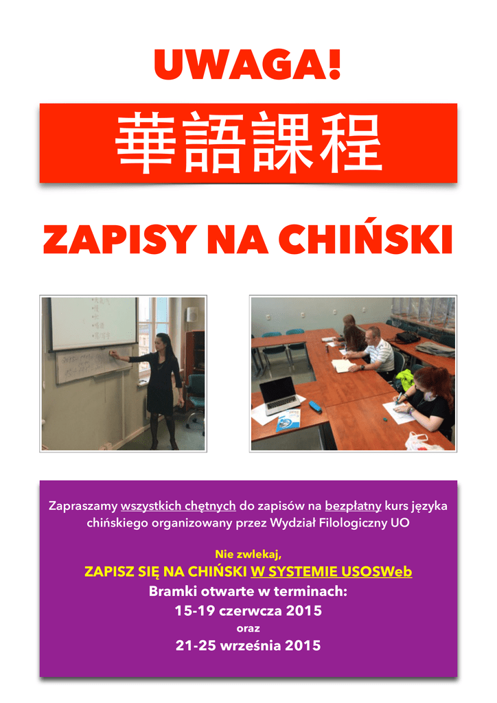 UWAGA! 華語課程 ZAPISY NA CHIŃSKI Zapraszamy wszystkich chętnych do zapisów na bezpłatny kurs języka chińskiego organizowany przez Wydział Filologiczny UO Nie zwlekaj, ZAPISZ SIĘ NA CHIŃSKI W SYSTEMIE USOSWeb Bramki otwarte w terminach: 15-19 czerwcza 2015 oraz 21-25 września 2015