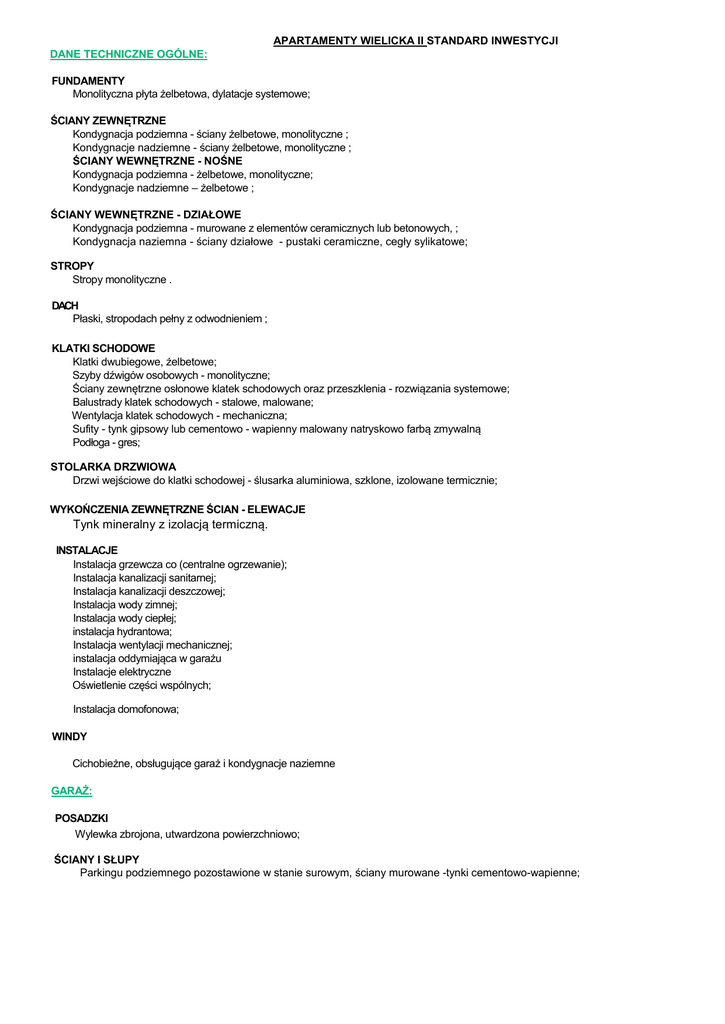 APARTAMENTY WIELICKA II STANDARD INWESTYCJI DANE TECHNICZNE OGÓLNE: FUNDAMENTY Monolityczna płyta żelbetowa, dylatacje systemowe; ŚCIANY ZEWNĘTRZNE Kondygnacja podziemna - ściany żelbetowe, monolityczne ; Kondygnacje nadziemne - ściany żelbetowe, monolityczne ; ŚCIANY WEWNĘTRZNE - NOŚNE Kondygnacja podziemna - żelbetowe, monolityczne; Kondygnacje nadziemne – żelbetowe ; ŚCIANY WEWNĘTRZNE - DZIAŁOWE Kondygnacja podziemna - murowane z elementów ceramicznych lub betonowych, ; Kondygnacja naziemna - ściany działowe - pustaki ceramiczne, cegły sylikatowe; STROPY Stropy monolityczne . DACH Płaski, stropodach pełny z odwodnieniem ; KLATKI SCHODOWE Klatki dwubiegowe, żelbetowe; Szyby dźwigów osobowych - monolityczne; Ściany zewnętrzne osłonowe klatek schodowych oraz przeszklenia - rozwiązania systemowe; Balustrady klatek schodowych - stalowe, malowane; Wentylacja klatek schodowych - mechaniczna; Sufity - tynk gipsowy lub cementowo - wapienny malowany natryskowo farbą zmywalną Podłoga - gres; STOLARKA DRZWIOWA Drzwi wejściowe do klatki schodowej - ślusarka aluminiowa, szklone, izolowane termicznie; WYKOŃCZENIA ZEWNĘTRZNE ŚCIAN - ELEWACJE Tynk mineralny z izolacją termiczną. INSTALACJE Instalacja grzewcza co (centralne ogrzewanie); Instalacja kanalizacji sanitarnej; Instalacja kanalizacji deszczowej; Instalacja wody zimnej; Instalacja wody ciepłej; instalacja hydrantowa; Instalacja wentylacji mechanicznej; instalacja oddymiająca w garażu Instalacje elektryczne Oświetlenie części wspólnych; Instalacja domofonowa; WINDY Cichobieżne, obsługujące garaż i kondygnacje naziemne GARAŻ: POSADZKI Wylewka zbrojona, utwardzona powierzchniowo; ŚCIANY I SŁUPY Parkingu podziemnego pozostawione w stanie surowym, ściany murowane -tynki cementowo-wapienne; DRZWI Drzwi wejściowe do części piwnicznej - stalowe, przeciw pożarowe; BRAMY Bramy garażowe stalowe sterowane mechanicznie i elektrycznie - obsługa pilotem; KOMÓRKI LOKATORSKIE: Posadzki - wylewka lub gres; Punkt oświetleniowy; Komórki dostępne ze strefy garażu posiadają drzwi ażurowe MIESZKANIA: POSADZKI Podłoga pływająca - szlichta cementowa na warstwie styropianu; ŚCIANY WEWNĘTRZNE Murowane z pustaków ceramicznych, lub cegły sylikatowej; DRZWI DO MIESZKAŃ Drzwi wejściowe do mieszkań - anty włamaniowe klasy C o podwyższonej odporności na włamanie; OKNA PCV-z szybami zespolonymi, z zapewnioną infiltracją o współczynniku Us (dla zestawu szybowego) =1,1 W/m2x K; PARAPETY WEWNĘTRZNE Konglomerat; TYNKI Tynk gipsowy w kuchniach i pokojach; Tynk cementowo-wapienny w łazienkach i wc; ŁAZIENKA Wykonanie podejścia instalacyjnego wg projektów technicznych; KUCHNIE Wykonanie podejścia instalacyjnego wg projektów technicznych; BALKONY Balustrady stalowe, malowane; Na części wypełnienie z płyt włókno-cementowych; Płytki gresowe, mrozoodporne, antypoślizgowe; INSTALACJE CO WODNA KANALIZACYJNA WENTYLACYJNA INNE INSTALACJE - grzejniki płytowe; - łazienki - grzejniki drabinkowe; - wg. projektu; - wg. projektu; - mechaniczna - łazienki, WC, kuchnie, - elektryczna - wg. dokumentacji; - komputerowa (dostęp do Internetu); - domofonowa - przedpokój; OTOCZENIE: DROGI I CHODNIKI - kostka betonowa: ZIELEŃ - urządzona zgodnie z projektem; MAŁA ARCHITEKTURA - zgodnie z projektem - ławki, donice, śmietniki, place zabaw, plac rekreacyjny.
