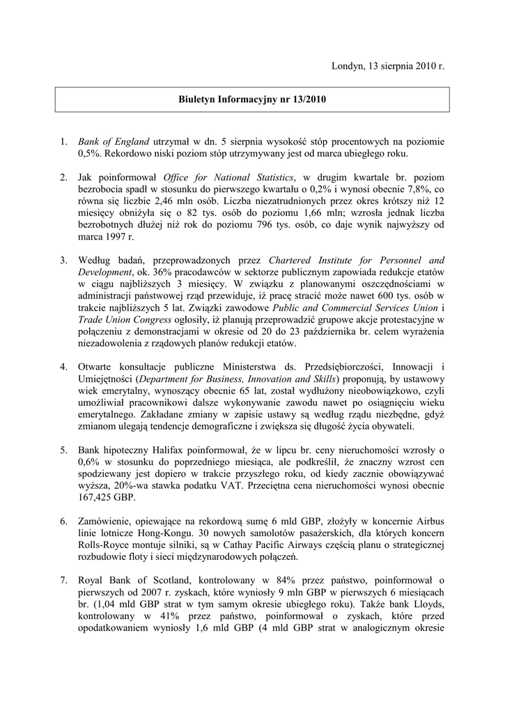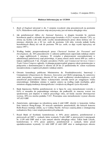 Londyn, 13 sierpnia 2010 r. Biuletyn Informacyjny nr 13/2010 1. Bank of England utrzymał w dn. 5 sierpnia wysokość stóp procentowych na poziomie 0,5%. Rekordowo niski poziom stóp utrzymywany jest od marca ubiegłego roku. 2. Jak poinformował Office for National Statistics, w drugim kwartale br. poziom bezrobocia spadł w stosunku do pierwszego kwartału o 0,2% i wynosi obecnie 7,8%, co równa się liczbie 2,46 mln osób. Liczba niezatrudnionych przez okres krótszy niż 12 miesięcy obniżyła się o 82 tys. osób do poziomu 1,66 mln; wzrosła jednak liczba bezrobotnych dłużej niż rok do poziomu 796 tys. osób, co daje wynik najwyższy od marca 1997 r. 3. Według badań, przeprowadzonych przez Chartered Institute for Personnel and Development, ok. 36% pracodawców w sektorze publicznym zapowiada redukcje etatów w ciągu najbliższych 3 miesięcy. W związku z planowanymi oszczędnościami w administracji państwowej rząd przewiduje, iż pracę stracić może nawet 600 tys. osób w trakcie najbliższych 5 lat. Związki zawodowe Public and Commercial Services Union i Trade Union Congress ogłosiły, iż planują przeprowadzić grupowe akcje protestacyjne w połączeniu z demonstracjami w okresie od 20 do 23 października br. celem wyrażenia niezadowolenia z rządowych planów redukcji etatów. 4. Otwarte konsultacje publiczne Ministerstwa ds. Przedsiębiorczości, Innowacji i Umiejętności (Department for Business, Innovation and Skills) proponują, by ustawowy wiek emerytalny, wynoszący obecnie 65 lat, został wydłużony nieobowiązkowo, czyli umożliwiał pracownikowi dalsze wykonywanie zawodu nawet po osiągnięciu wieku emerytalnego. Zakładane zmiany w zapisie ustawy są według rządu niezbędne, gdyż zmianom ulegają tendencje demograficzne i zwiększa się długość życia obywateli. 5. Bank hipoteczny Halifax poinformował, że w lipcu br. ceny nieruchomości wzrosły o 0,6% w stosunku do poprzedniego miesiąca, ale podkreślił, że znaczny wzrost cen spodziewany jest dopiero w trakcie przyszłego roku, od kiedy zacznie obowiązywać wyższa, 20%-wa stawka podatku VAT. Przeciętna cena nieruchomości wynosi obecnie 167,425 GBP. 6. Zamówienie, opiewające na rekordową sumę 6 mld GBP, złożyły w koncernie Airbus linie lotnicze Hong-Kongu. 30 nowych samolotów pasażerskich, dla których koncern Rolls-Royce montuje silniki, są w Cathay Pacific Airways częścią planu o strategicznej rozbudowie floty i sieci międzynarodowych połączeń. 7. Royal Bank of Scotland, kontrolowany w 84% przez państwo, poinformował o pierwszych od 2007 r. zyskach, które wyniosły 9 mln GBP w pierwszych 6 miesiącach br. (1,04 mld GBP strat w tym samym okresie ubiegłego roku). Także bank Lloyds, kontrolowany w 41% przez państwo, poinformował o zyskach, które przed opodatkowaniem wyniosły 1,6 mld GBP (4 mld GBP strat w analogicznym okresie ubiegłego roku), i były wyższe od przewidywanego przez analityków zysku na poziomie 800 mln GBP. 8. Największy bank strefy Euro, hiszpański Santander, poinformował o planach odkupienia od Royal Bank of Scotland jego 318 oddziałów za kwotę 1,65 mln GBP. Sprzedaż oddziałów, zarządzona przez Komisję Europejską, jest warunkiem otrzymania przez RBS rządowego pakietu pomocowego w wysokości 45,5 mld GBP. 9. Jak podaje Council of Mortgage Lenders, liczba przejętych przez banki zadłużonych domów i mieszkań spadła w drugim kwartale br. o 400 i wyniosła 9400 nieruchomości. Zrewidowano także w dół roczne prognozowania na liczbę przejętych przez banki zadłużonych nieruchomości z 53 tys. do poziomu 39 tys. Według Rady Kredytodawców Hipotecznych, utrzymanie stóp procentowych na rekordowo niskim poziomie i programy rządowe, wspomagające spłatę długów, uchroniły wielu kredytobiorców przed oddaniem nieruchomości w ręce banku. 10. Na ponad 6 mld USD koncern BP wycenił walkę ze skutkami wycieku ropy do Zatoki Meksykańskiej. Poniesione koszty to m.in.: działania związane z wyciekiem i zebraniem wylanej ropy, odwiertami ratunkowymi oraz zaplombowaniem szybu. Wydatki obejmują także sumy przekazane nabrzeżnym stanom Ameryki, rządowi federalnemu USA i wypłacone dotąd odszkodowania.