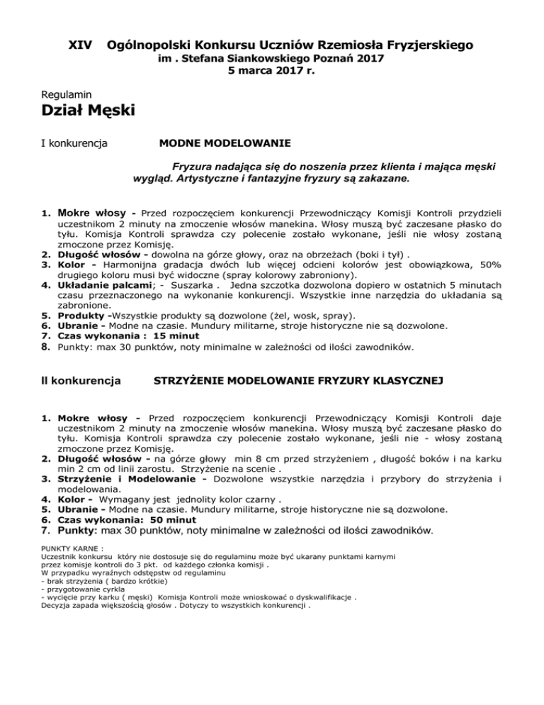 XIV Ogólnopolski Konkursu Uczniów Rzemiosła Fryzjerskiego im . Stefana Siankowskiego Poznań 2017 5 marca 2017 r. Regulamin Dział Męski I konkurencja MODNE MODELOWANIE Fryzura nadająca się do noszenia przez klienta i mająca męski wygląd. Artystyczne i fantazyjne fryzury są zakazane. 1. Mokre włosy - Przed rozpoczęciem konkurencji Przewodniczący Komisji Kontroli przydzieli uczestnikom 2 minuty na zmoczenie włosów manekina. Włosy muszą być zaczesane płasko do tyłu. Komisja Kontroli sprawdza czy polecenie zostało wykonane, jeśli nie włosy zostaną zmoczone przez Komisję. 2. Długość włosów - dowolna na górze głowy, oraz na obrzeżach (boki i tył) . 3. Kolor - Harmonijna gradacja dwóch lub więcej odcieni kolorów jest obowiązkowa, 50% drugiego koloru musi być widoczne (spray kolorowy zabroniony). 4. Układanie palcami; - Suszarka . Jedna szczotka dozwolona dopiero w ostatnich 5 minutach czasu przeznaczonego na wykonanie konkurencji. Wszystkie inne narzędzia do układania są zabronione. 5. Produkty -Wszystkie produkty są dozwolone (żel, wosk, spray). 6. Ubranie - Modne na czasie. Mundury militarne, stroje historyczne nie są dozwolone. 7. Czas wykonania : 15 minut 8. Punkty: max 30 punktów, noty minimalne w zależności od ilości zawodników. II konkurencja STRZYŻENIE MODELOWANIE FRYZURY KLASYCZNEJ 1. Mokre włosy - Przed rozpoczęciem konkurencji Przewodniczący Komisji Kontroli daje uczestnikom 2 minuty na zmoczenie włosów manekina. Włosy muszą być zaczesane płasko do tyłu. Komisja Kontroli sprawdza czy polecenie zostało wykonane, jeśli nie - włosy zostaną zmoczone przez Komisję. 2. Długość włosów - na górze głowy min 8 cm przed strzyżeniem , długość boków i na karku min 2 cm od linii zarostu. Strzyżenie na scenie . 3. Strzyżenie i Modelowanie - Dozwolone wszystkie narzędzia i przybory do strzyżenia i modelowania. 4. Kolor - Wymagany jest jednolity kolor czarny . 5. Ubranie - Modne na czasie. Mundury militarne, stroje historyczne nie są dozwolone. 6. Czas wykonania: 50 minut 7. Punkty: max 30 punktów, noty minimalne w zależności od ilości zawodników. PUNKTY KARNE : Uczestnik konkursu który nie dostosuje się do regulaminu może być ukarany punktami karnymi przez komisje kontroli do 3 pkt. od każdego członka komisji . W przypadku wyraźnych odstępstw od regulaminu - brak strzyżenia ( bardzo krótkie) - przygotowanie cyrkla - wycięcie przy karku ( męski) Komisja Kontroli może wnioskować o dyskwalifikacje . Decyzja zapada większością głosów . Dotyczy to wszystkich konkurencji .