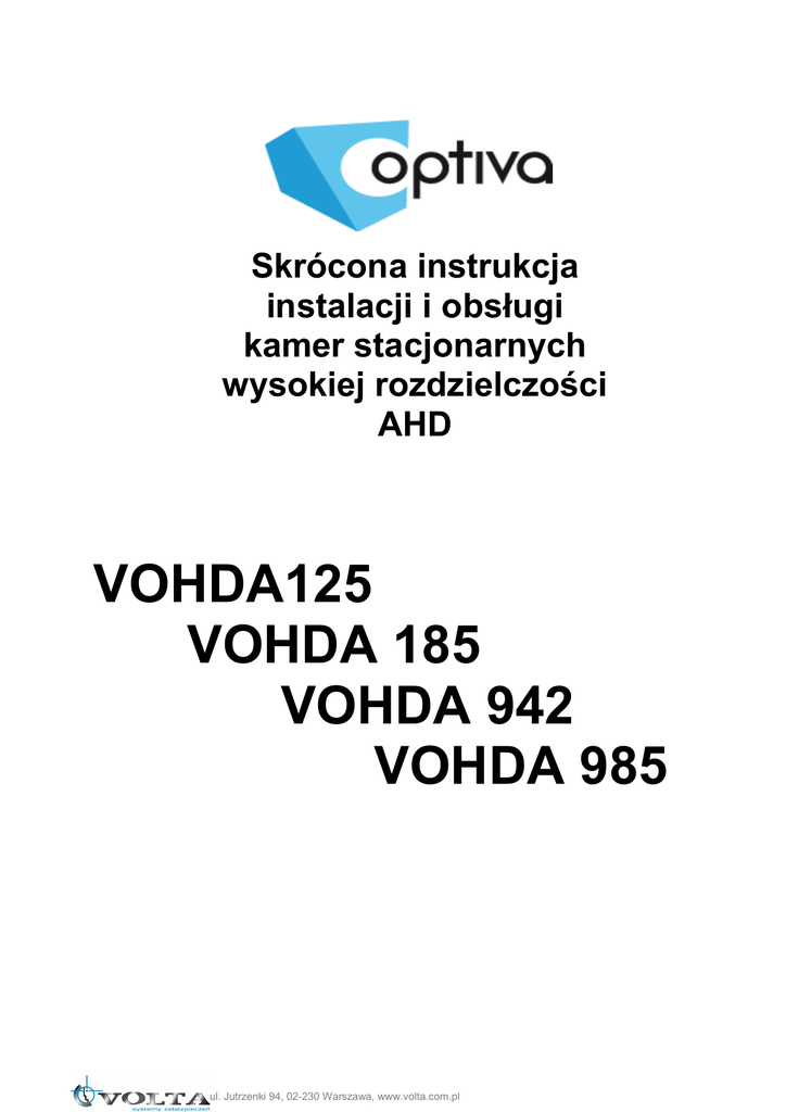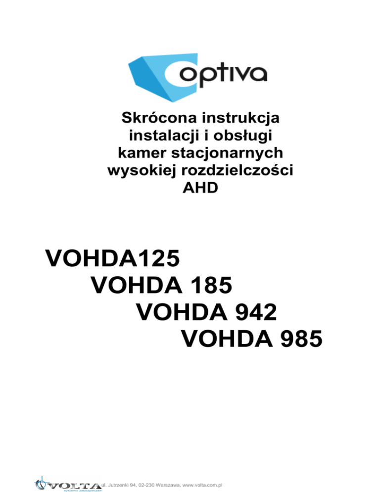 Skrócona instrukcja instalacji i obsługi kamer stacjonarnych wysokiej rozdzielczości AHD VOHDA125 VOHDA 185 VOHDA 942 VOHDA 985 ul. Jutrzenki 94, 02-230 Warszawa, www.volta.com.pl Instrukcja instalacji i obsługi Kamera stacjonarna A-HD CCTV OPTIVA Kamera, która została uszkodzona w wyniku przepięcia (wyładowanie atmosferyczne lub inne) w instalacji wizyjnej lub zasilającej nie podlega gwarancji. Funkcje kamery w zależności od wersji oprogramowania, mogą się różnić od tych podanych w podstawowej instrukcji. Każde urządzenie i instalacja powinna być wykonane przez certyfikowanego i uprawnionego instalatora. Prawidłowa utylizacja produktu. Oznaczenie przekreślonego kosza naniesione na produkcie lub jego opakowaniu wskazuje, że tego urządzenia nie można wyrzucać razem z innymi odpadami pochodzącymi z gospodarstwa domowego. Aby uniknąć ewentualnego zagrożenia dla środowiska naturalnego lub zdrowia spowodowanego niekontrolowanym składowaniem odpadów, należy przekazać ten produkt do recyklingu. W celu uzyskania dodatkowych informacji dotyczących recyklingu niniejszego produktu należy skontaktować się z władzami gminy, dostawcą usług utylizacji odpadów lub sklepem, gdzie zakupiono urządzenie. Informacja dla użytkowników dotycząca ograniczenia użycia substancji niebezpiecznych w sprzęcie elektrycznym elektronicznym. Informujemy, że nasze urządzenia , zostały zaprojektowane i wyprodukowane zgodnie z wymaganiami dyrektywy Dyrektywa RoHS 2011/95/EU, dotyczącej użycia substancji niebezpiecznych w sprzęcie elektrycznym i elektronicznym. Producent zastrzega sobie możliwość zmiany parametrów technicznych bez wcześniejszego powiadomienia 2 Kamera stacjonarna A-HD CCTV OPTIVA Instrukcja instalacji i obsługi SPIS TREŚCI 1 Podstawowe informacje........................................................................3 2 Ustawienie obiektywu (dotyczy zmiennoogniskowych).........................5 3 Zasilanie..............................................................................................6 4 Konserwacja........................................................................................6 5 Zabezpieczenie przeciw przepięciowe.................................................7 6 Zanim skontaktujesz się z serwisem....................................................7 7 Menu OSD kamery AHD......................................................................8 7.1. OBIEKTYW – Ustawienia przesłony obiektywu................................................8 7.2. EKSPOZYCJA – Podmenu ustawień elektroniki kamery.................................8 7.4. BALANS BIELI – Wybór typu automatycznego balansu bieli...........................8 7.5. DZIEŃ / NOC - Podmenu przełączania się kamery..........................................9 7.6. NR – Podmenu ustawień redukcji szumów 2DNR, 3DNR...............................9 7.7. SPECJALNE – Podmenu funkcji specjalnych kamery, Wideo-detekcja, Strefy prywatności, itp........................................................................................................9 7.8. ADJUSTAR – Regulacja obrazu.....................................................................9 7.9 WYJŚCIE – z zapisem ustawień, bez, lub ustawienia fabryczne......................9 1 Podstawowe informacje • Przeczytaj tą instrukcję Przeczytaj całą instrukcję instalacji i użytkowania przed instalacją. • Zachowaj tą instrukcję Zachowaj tą instrukcję – możesz potrzebować do niej zajrzeć w przyszłości. • Urządzenia współpracujące i akcesoria Używaj wyłącznie urządzeń zalecanych przez producenta lub dystrybutora. Urządzenia niezalecane mogą spowodować nieprzewidziane zachowanie sprzętu, jego uszkodzenie i utratę gwarancji. • Instalacja urządzenia Urządzenie należy montować na stabilnej podstawie. Konieczne jest upewnienie się, że miejsce, w którym kamera ma być zamontowana (elewacja, słup, sufit) jest zdolne do utrzymania dodatkowego ciężaru kamery. Używaj uchwytów załączonych do kamery lub zalecanych przez producenta lub dystrybutora. Podczas instalacji kieruj się wskazówkami zawartymi w tej instrukcji. 1) Przygotuj otwory montażowe na kołki, zgodnie z ich rozstawem (wykorzystaj opcjonalnie dostępny szablon) upewniając się, że uchwyt po zamocowaniu będzie pozwalał na przewidziane ustawienia kamery 3 Instrukcja instalacji i obsługi Kamera stacjonarna A-HD CCTV OPTIVA 2) Doprowadź i przygotuj pozostałe elementy instalacji i okablowania, tak aby zapewnić dobre spasowanie stosowanych elementów systemu. 3) Przymocuj uchwyt kamerowy do powierzchni, tak aby w zależności od zagrożenia osłaniał on instalację przed działaniem warunków atmosferycznych 4) Umieść i zablokuj kamerę w/na uchwycie pewnie i stabilnie, by uniknąć jej uszkodzenia. Przytwierdzenie podstawy kamery kopułowej Przytwierdzenie uchwytu kamery buletowej 4 • Kierunek patrzenia Nigdy nie wolno ustawiać kamery prosto w kierunku słońca, lub innych mocno odbijających/emitujących światło obiektów. Obraz traci wtedy na jakości a funkcje cyfrowej korekty obrazu mogą działać nieefektywnie. • Obiektyw Ostrość obrazu należy ustawić przy średnim poziomie naświetlenia sceny, tak aby zmieniające się oświetlenie było możliwie najbliżej poziomu, dla jakiego ostrość była regulowana. Kamera stacjonarna A-HD CCTV OPTIVA Instrukcja instalacji i obsługi Opis podstawowych elementów kamery typu bulet i kopuła 2 Ustawienie obiektywu (dotyczy zmiennoogniskowych) Zamontowany czy fabrycznie, czy przez instalatora obiektyw, należy ustawić zgodnie z potrzebami monitoringu i możliwościami samego obiektywu. Ustaw ostrość i ogniskową tak, aby uzyskać odpowiedni dla potrzeb obraz. Dotyczy modelów ze zmienną ogniskową 5 Instrukcja instalacji i obsługi Kamera stacjonarna A-HD CCTV OPTIVA 3 Zasilanie Pamiętaj aby zasilanie zapewnione na obiekcie było właściwe dla m